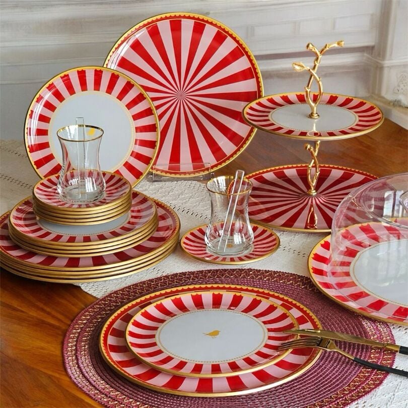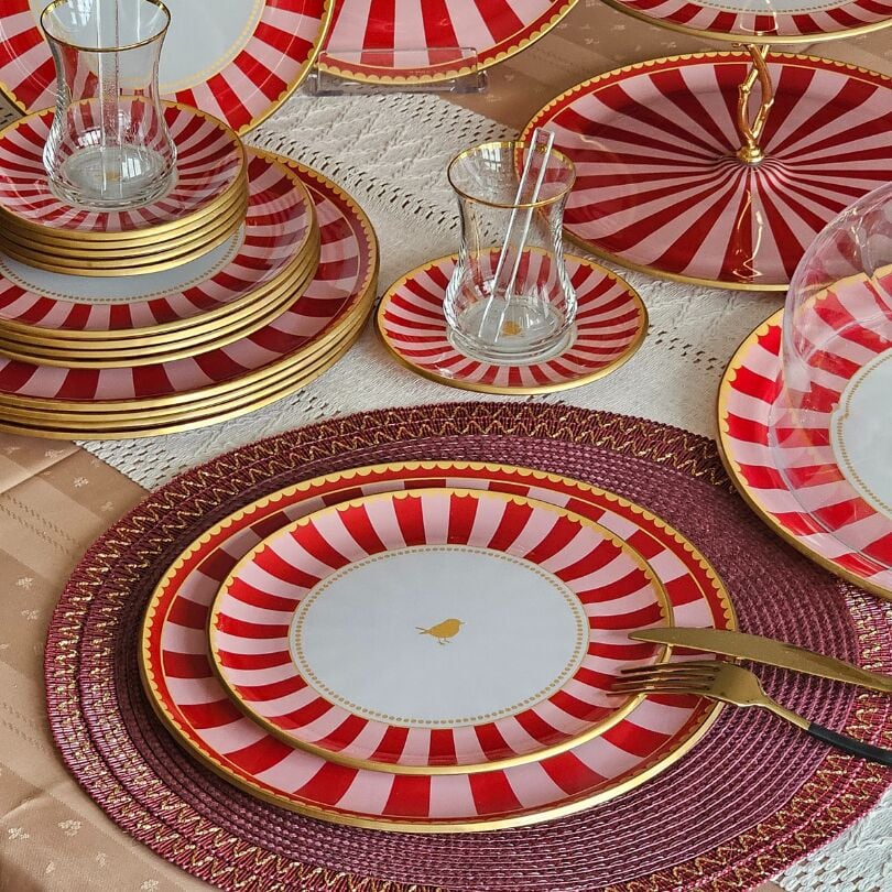 34 Parça Pink Bird Altın Yaldızlı 6 Kişilik Pasta Çay Servis İkram Takımı
