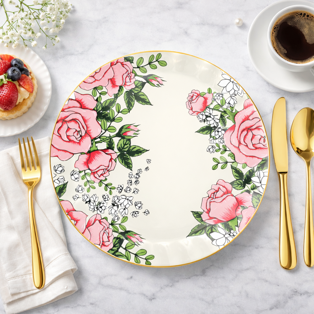 SUDEDI HOME Gerçek altın yaldız detaylı gül desenli 26 cm servis tabağı, sofralarınıza hem lüks hem de dikkat çekici bir sunum kazandırır.Geniş 26 cm çapı sayesinde ana yemek, pasta ve tatlı sunumları için ideal kullanım sunar.Işığa göre parlayan gerçek altın yaldızlı kenar yapısı, ürüne premium bir görünüm kazandırırken estetik gül desenleri sofranıza zarif bir dokunuş ekler.Modern ve klasik sofralarla uyum sağlayan bu özel tasarım servis tabağı, günlük kullanım ve misafir sunumlarında fark yaratır.