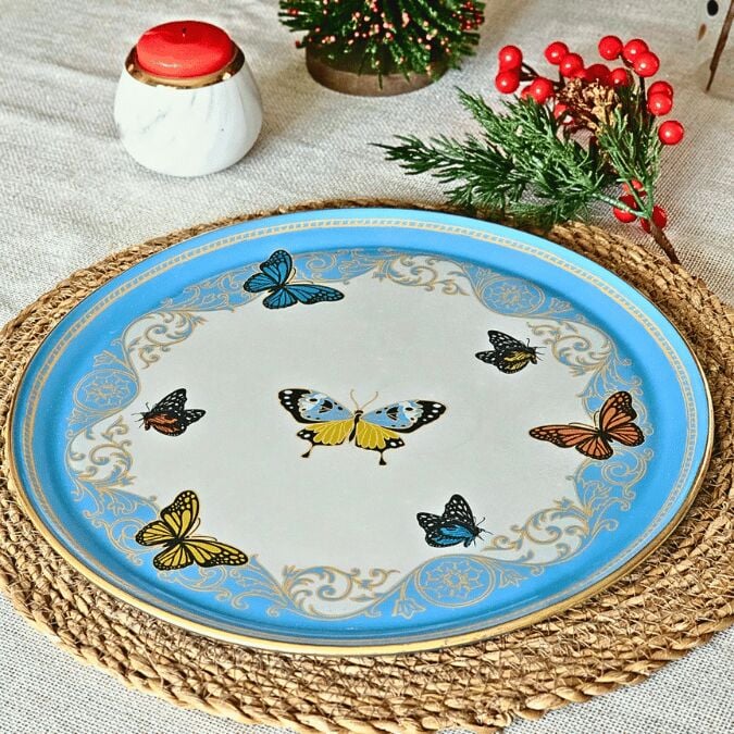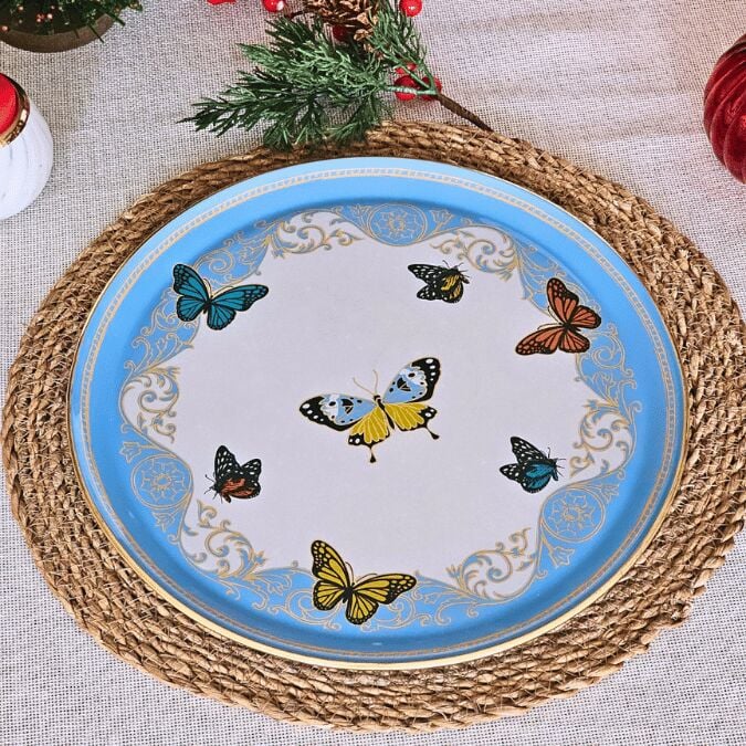Glore Butterfly Effect Altın Yaldızlı Cam Tepsi (Mavi)