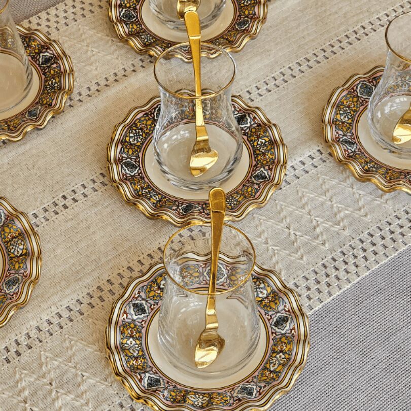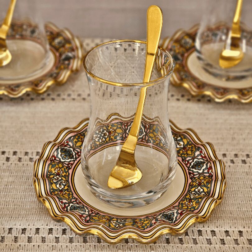 6 adet altın yaldızlı cam çay tabağı