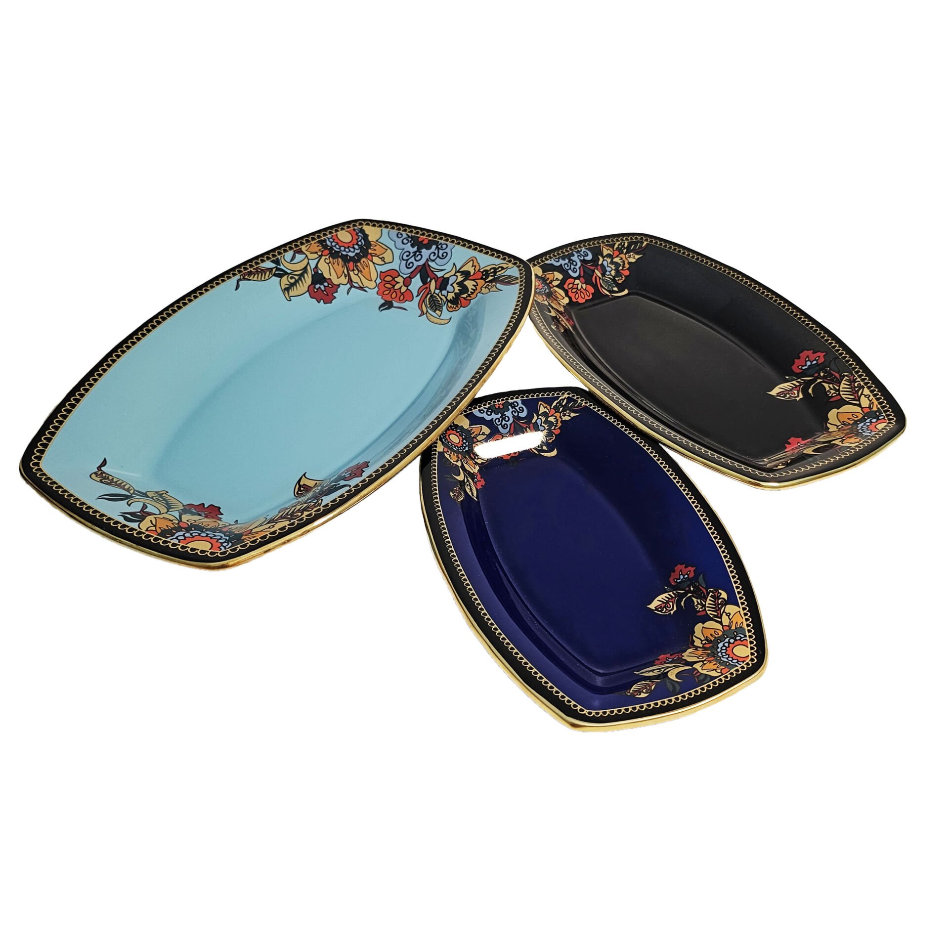 Glore Glore Lorena Asorti Altın Yaldızlı Kayık Tabak Seti (Turkuaz-Siyah-Mavi)