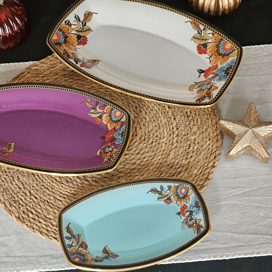 Glore Lorena Asorti Altın Yaldızlı Kayık Tabak Seti (Beyaz Mor Turkuaz)