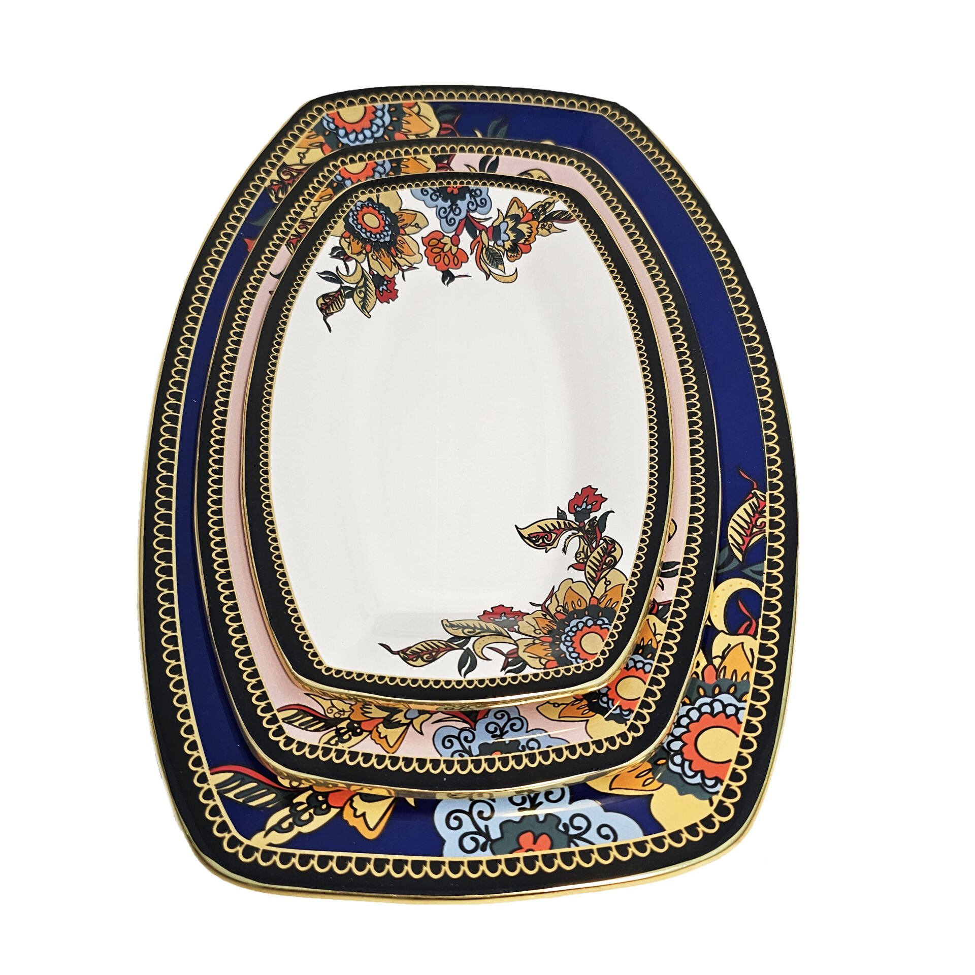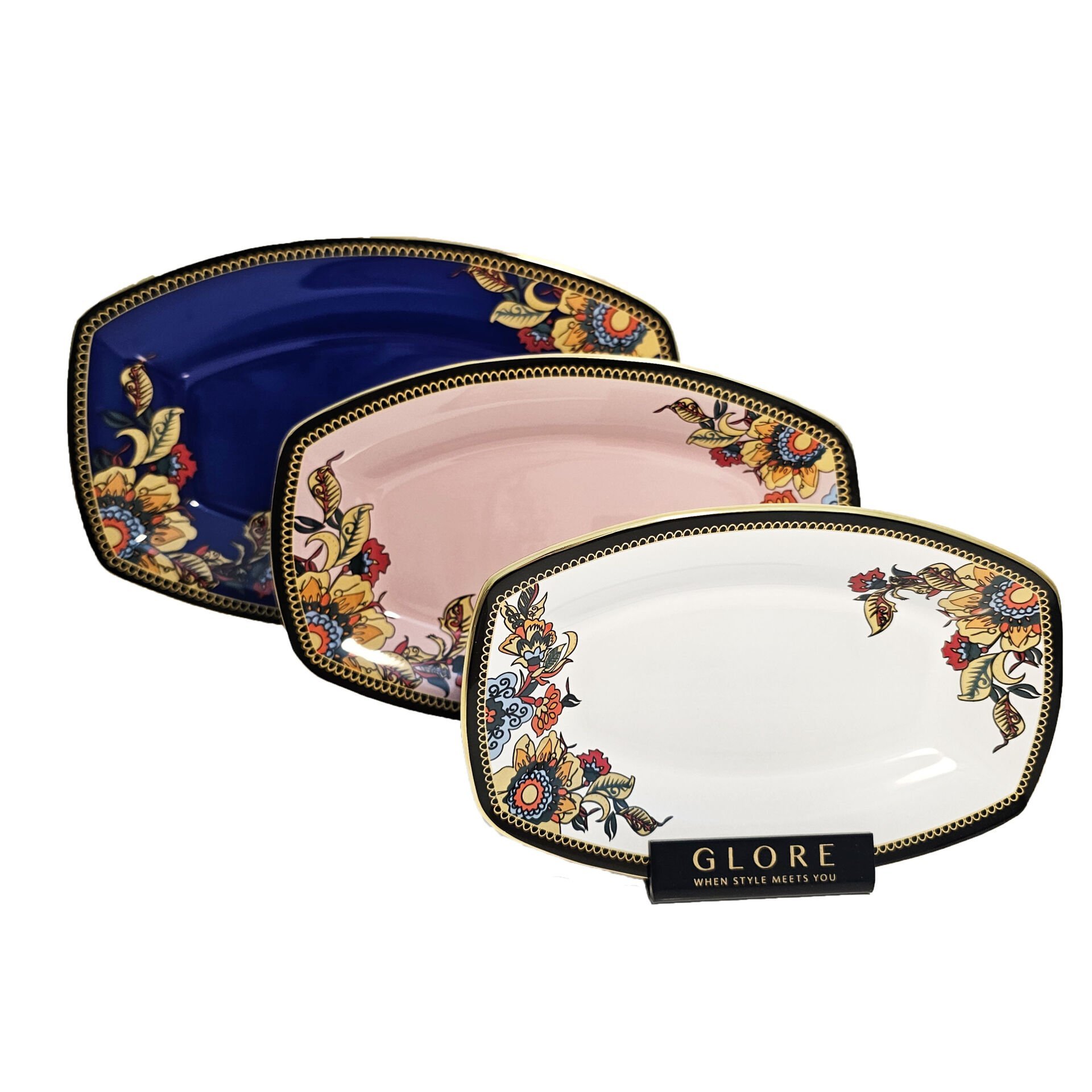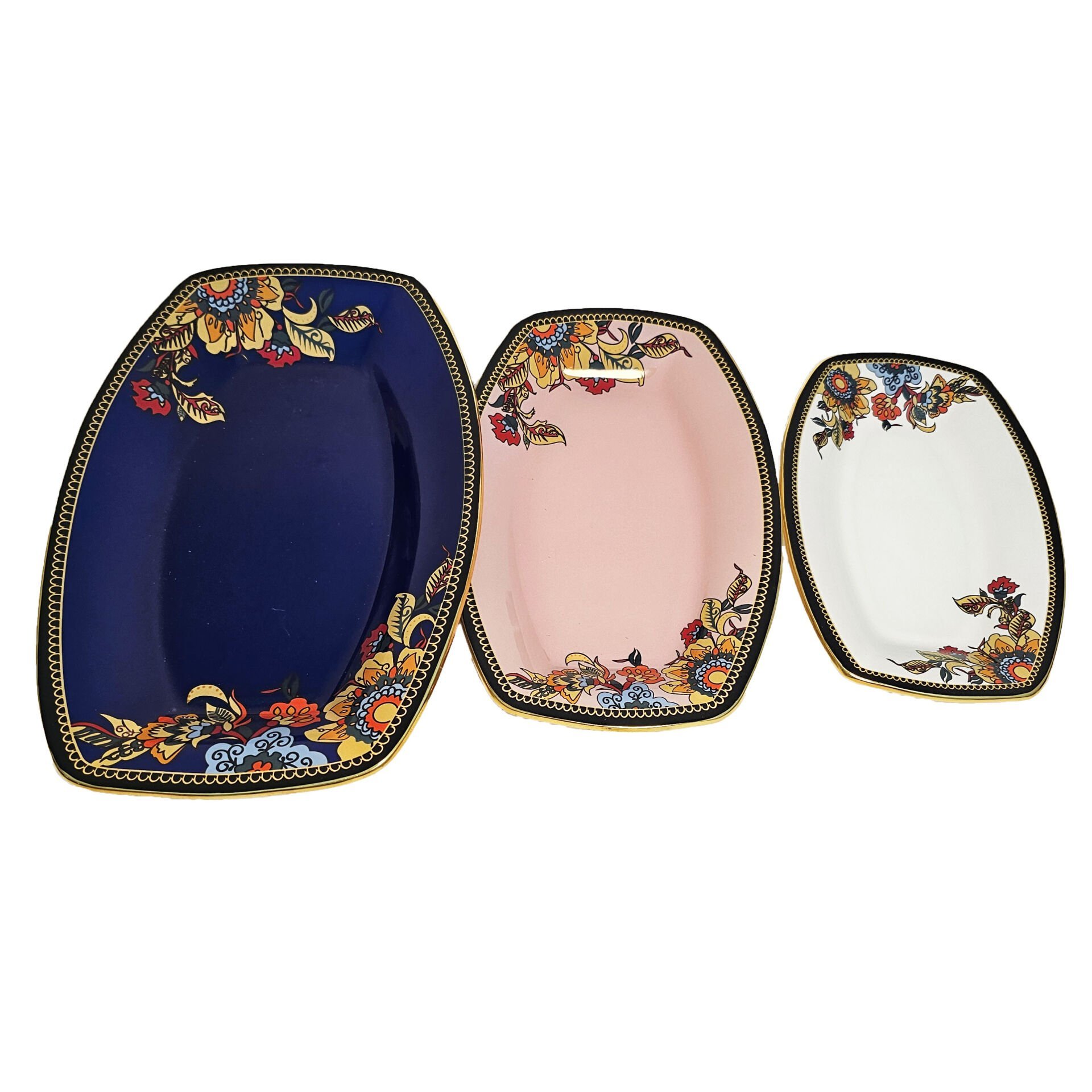 Glore Lorena Asorti Altın Yaldızlı Kayık Tabak Seti (Mavi- Pembe- Beyaz)