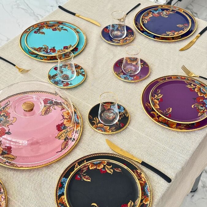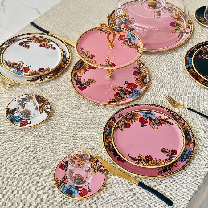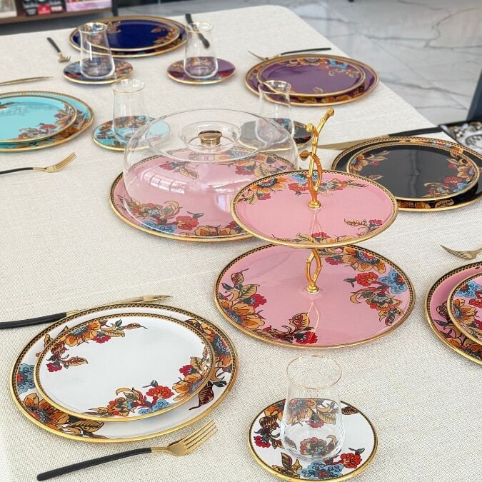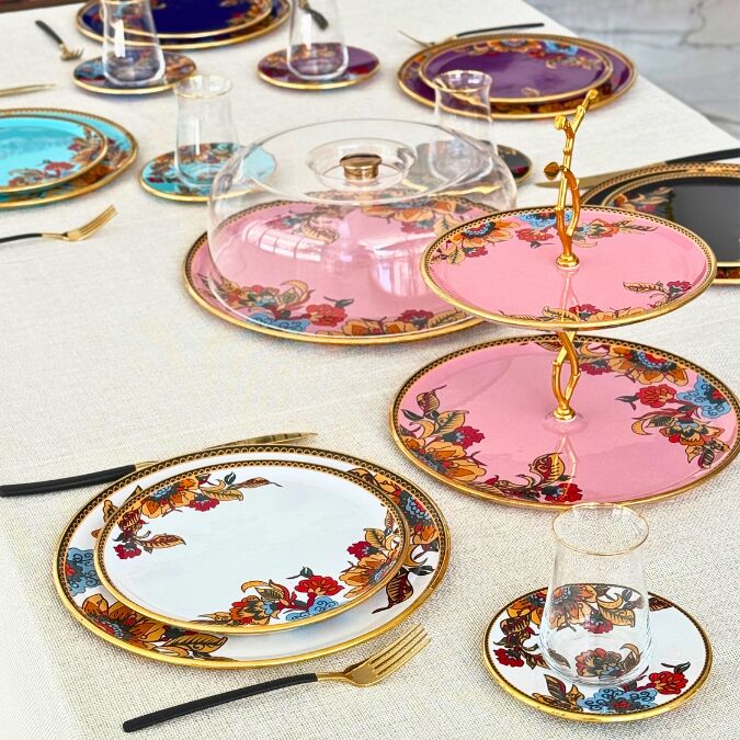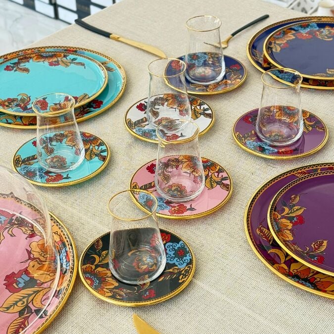 Glore Lorena Asorti Yaldızlı Cam 28 Parça Çay İkram Takımı Full Set (Pembe)