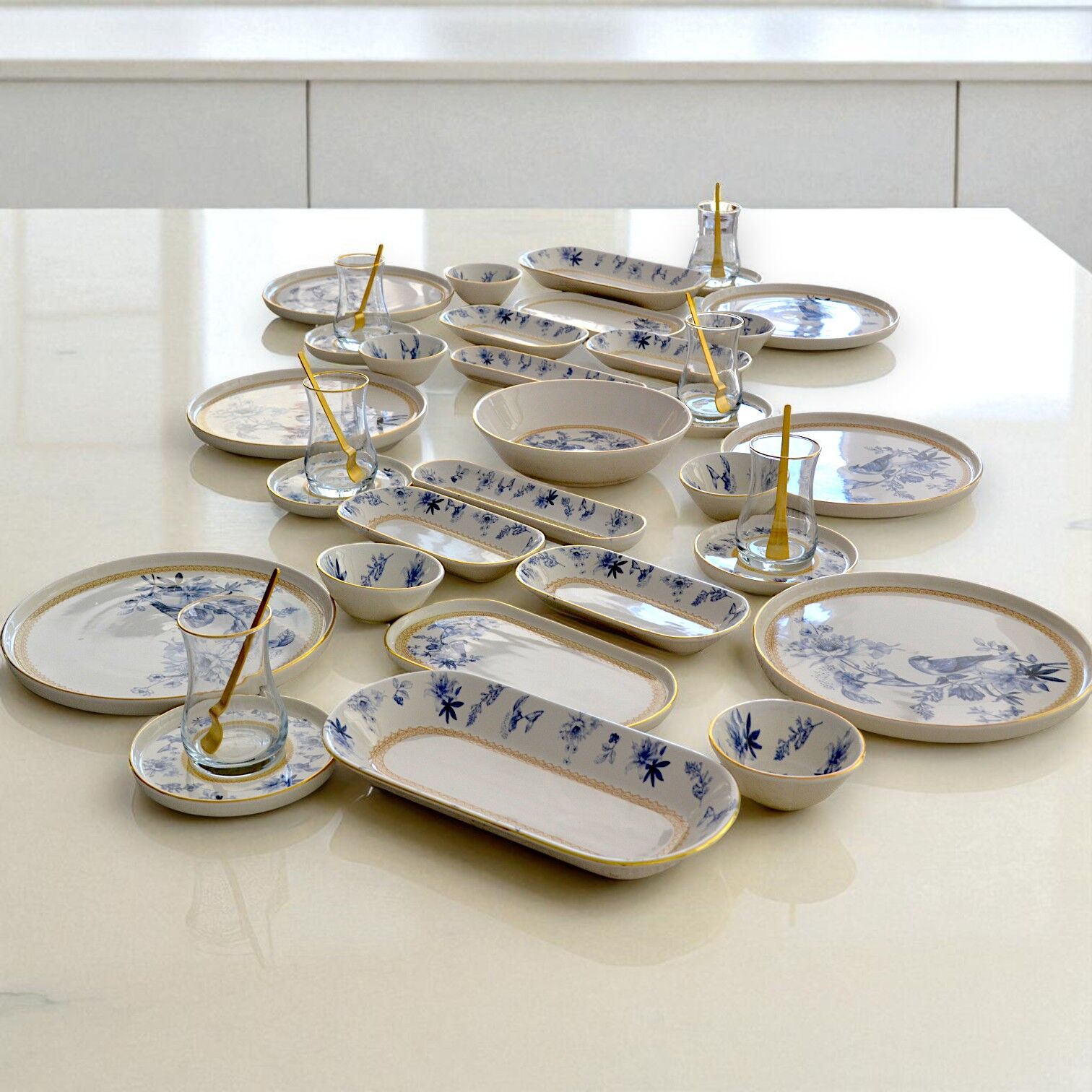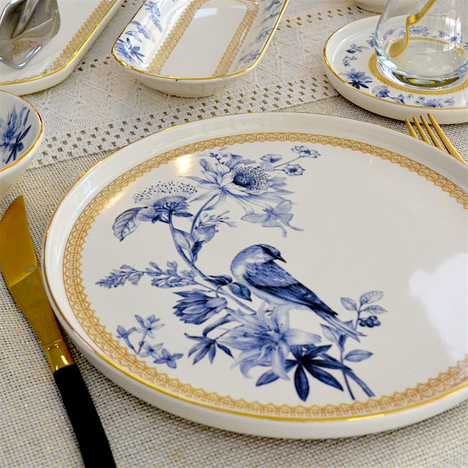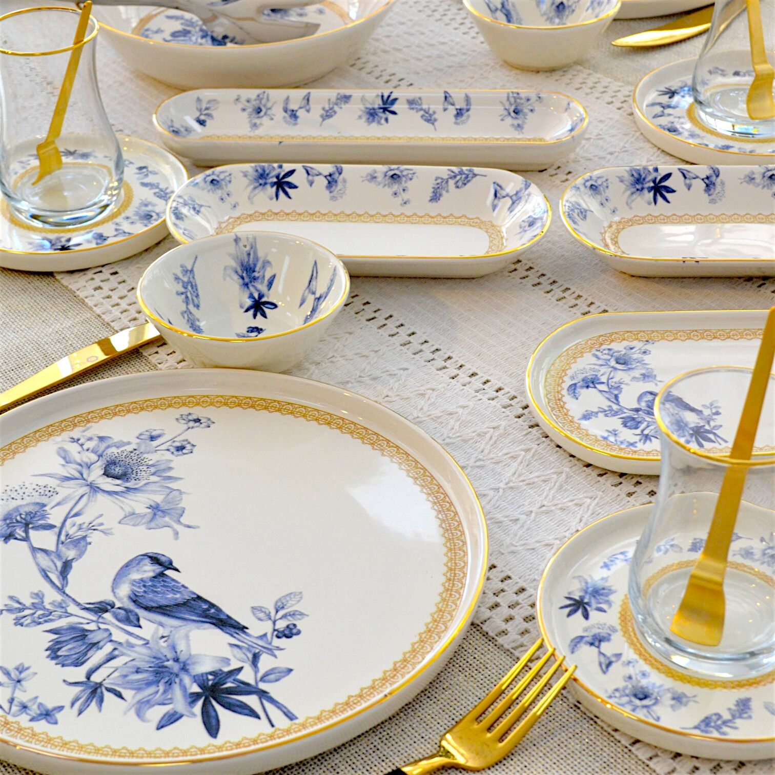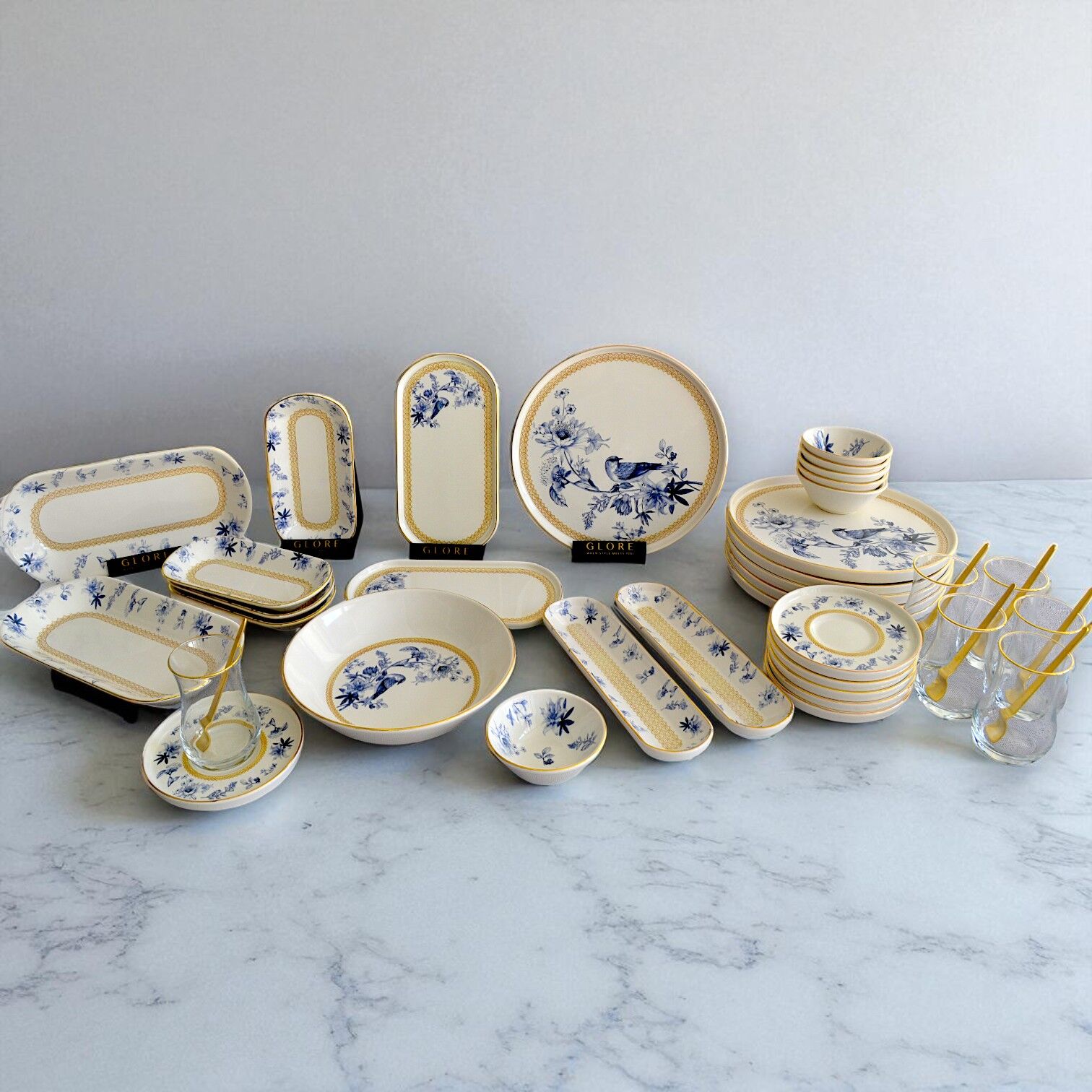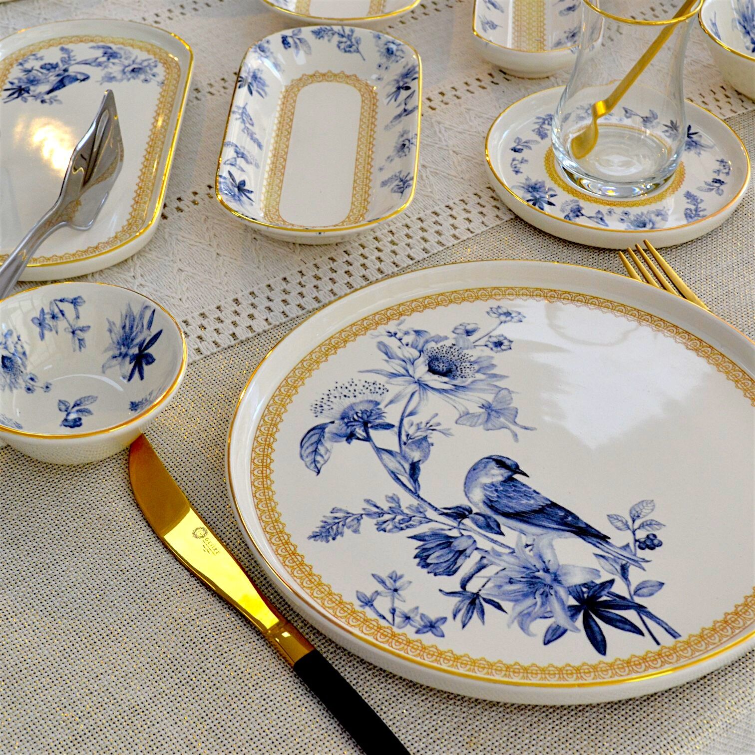 Glore Mavi Kuş 41 Parça 6 Kişilik Altın Yaldızlı Seramik Kahvaltı Takımı