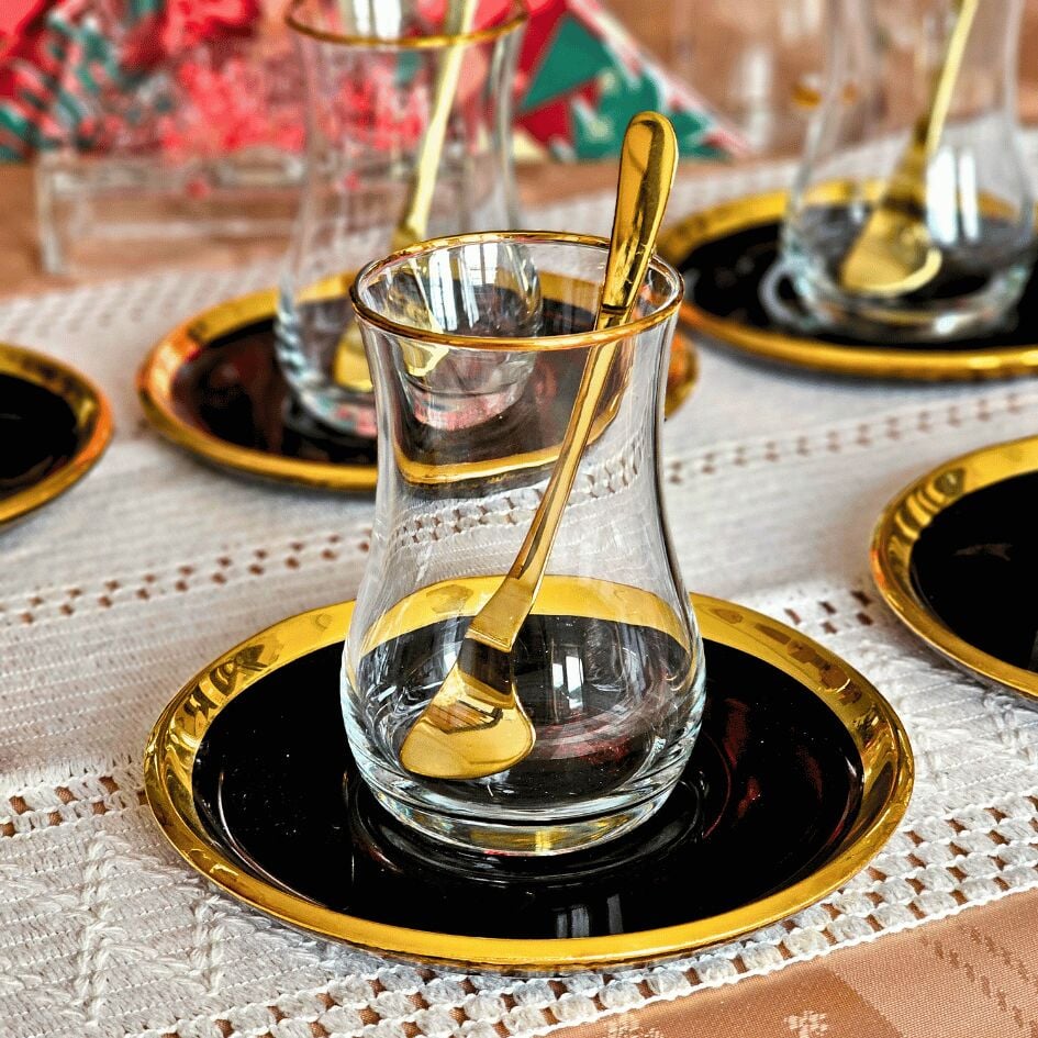 6 adet altın yaldızlı cam çay bardağı