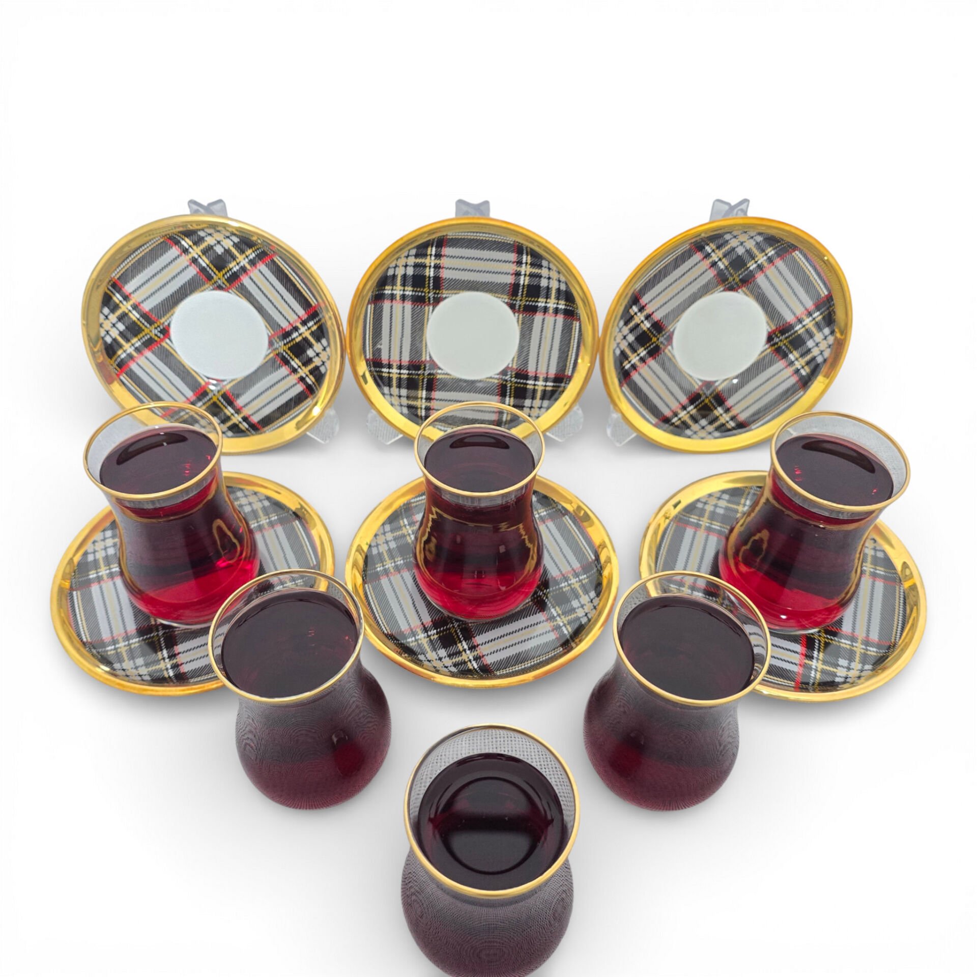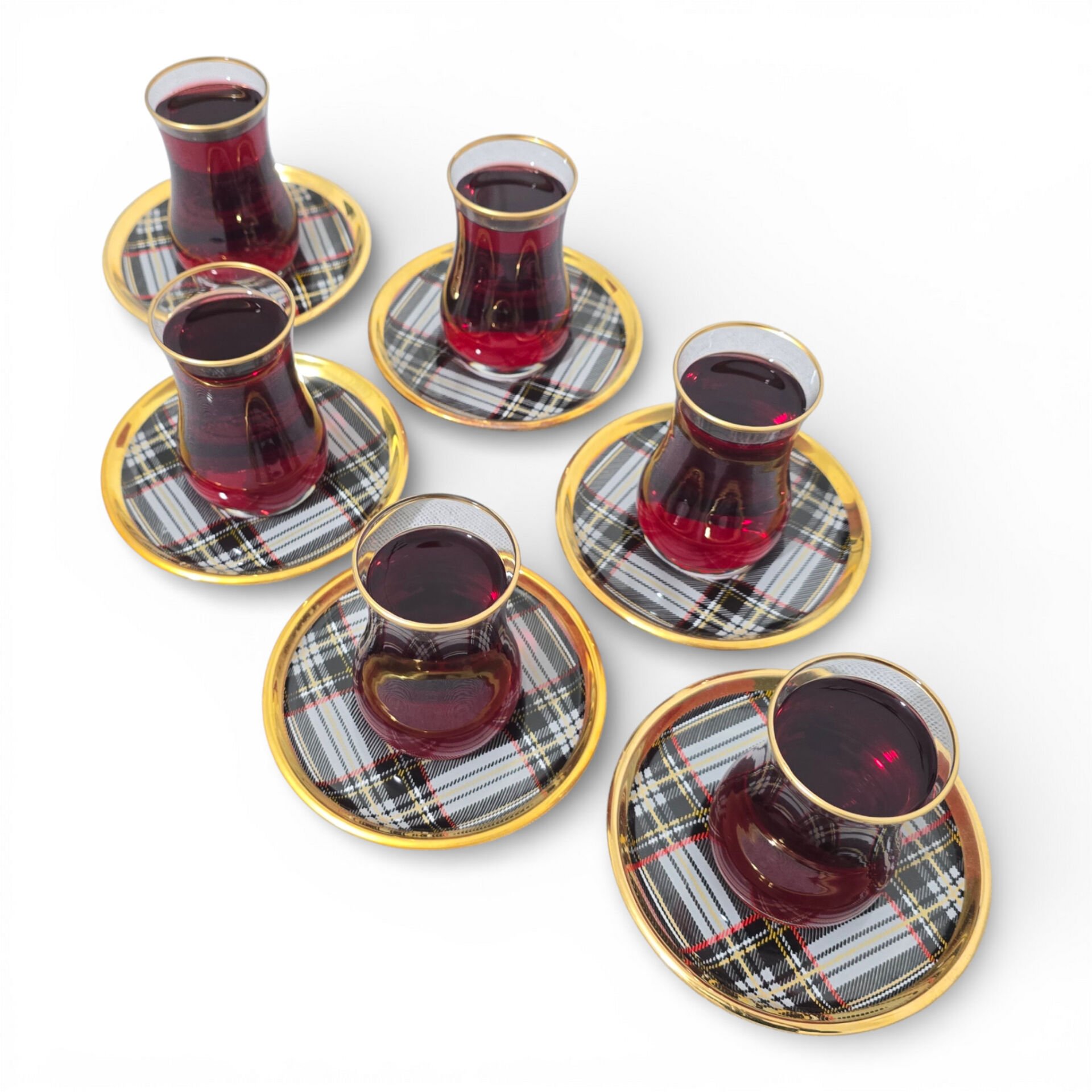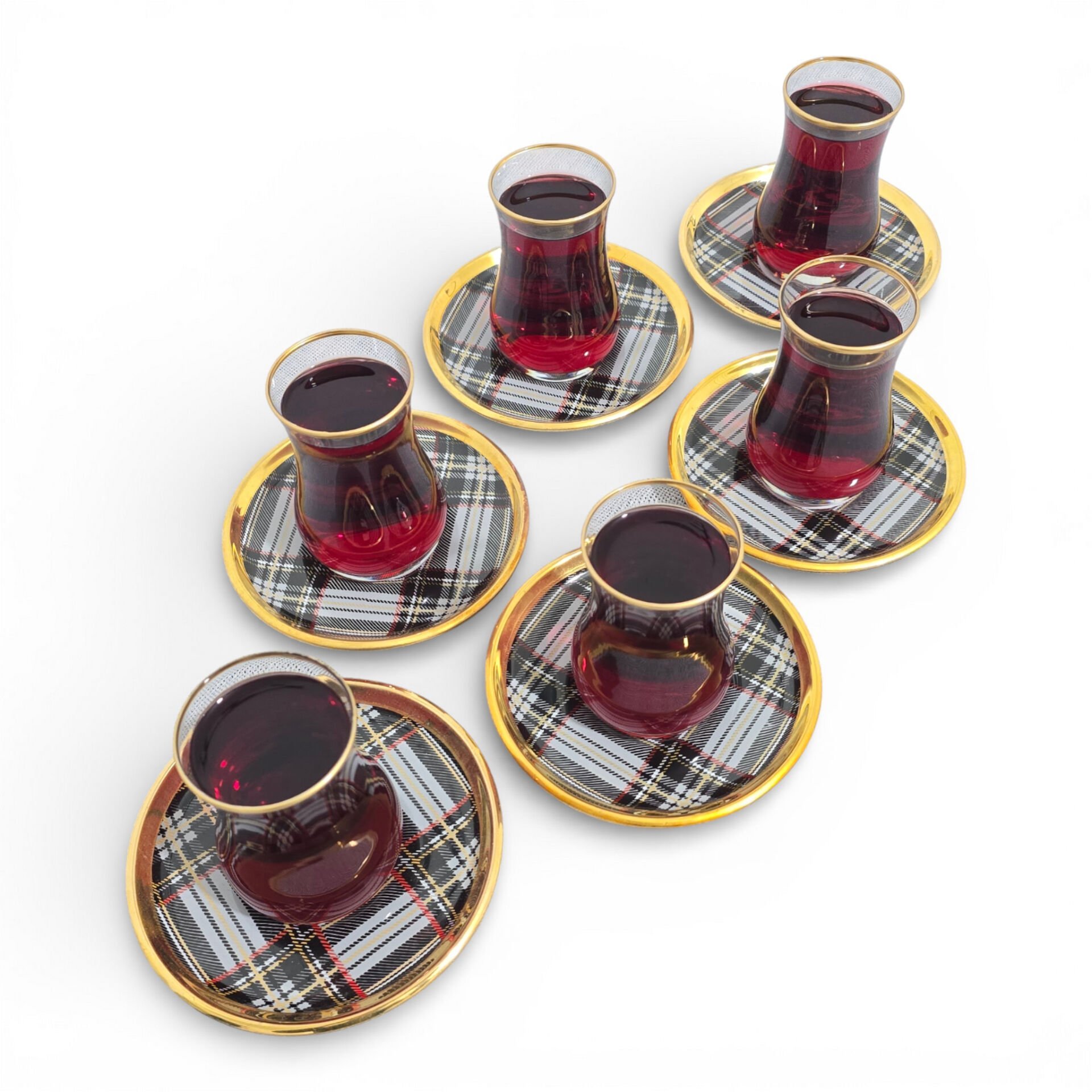 Ekose desenli cam çay tabakları ve zarif formdaki cam çay bardakları, hem tabak hem bardak kenarlarında kullanılan gerçek altın yaldız ile güçlü ve premium bir duruş sunar.