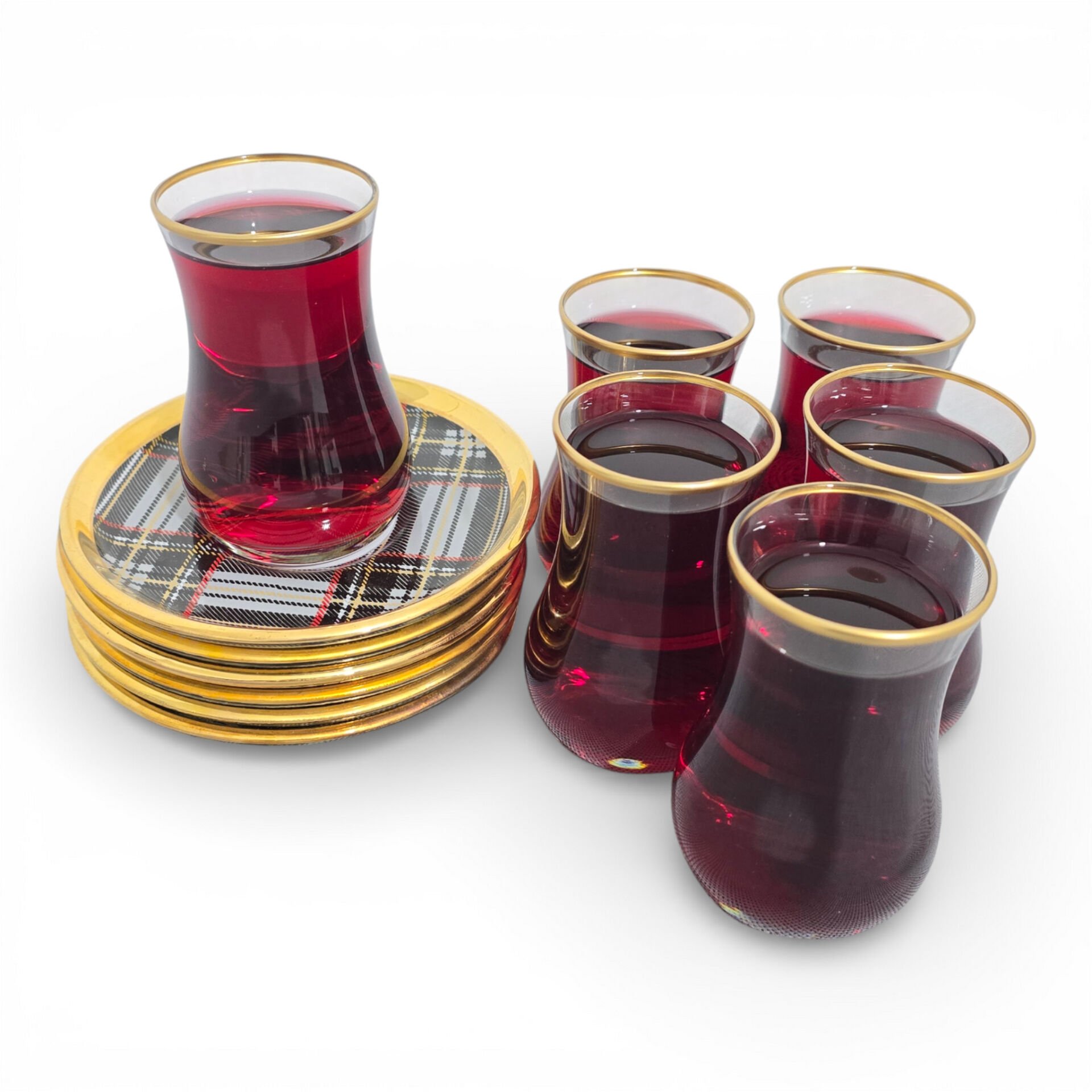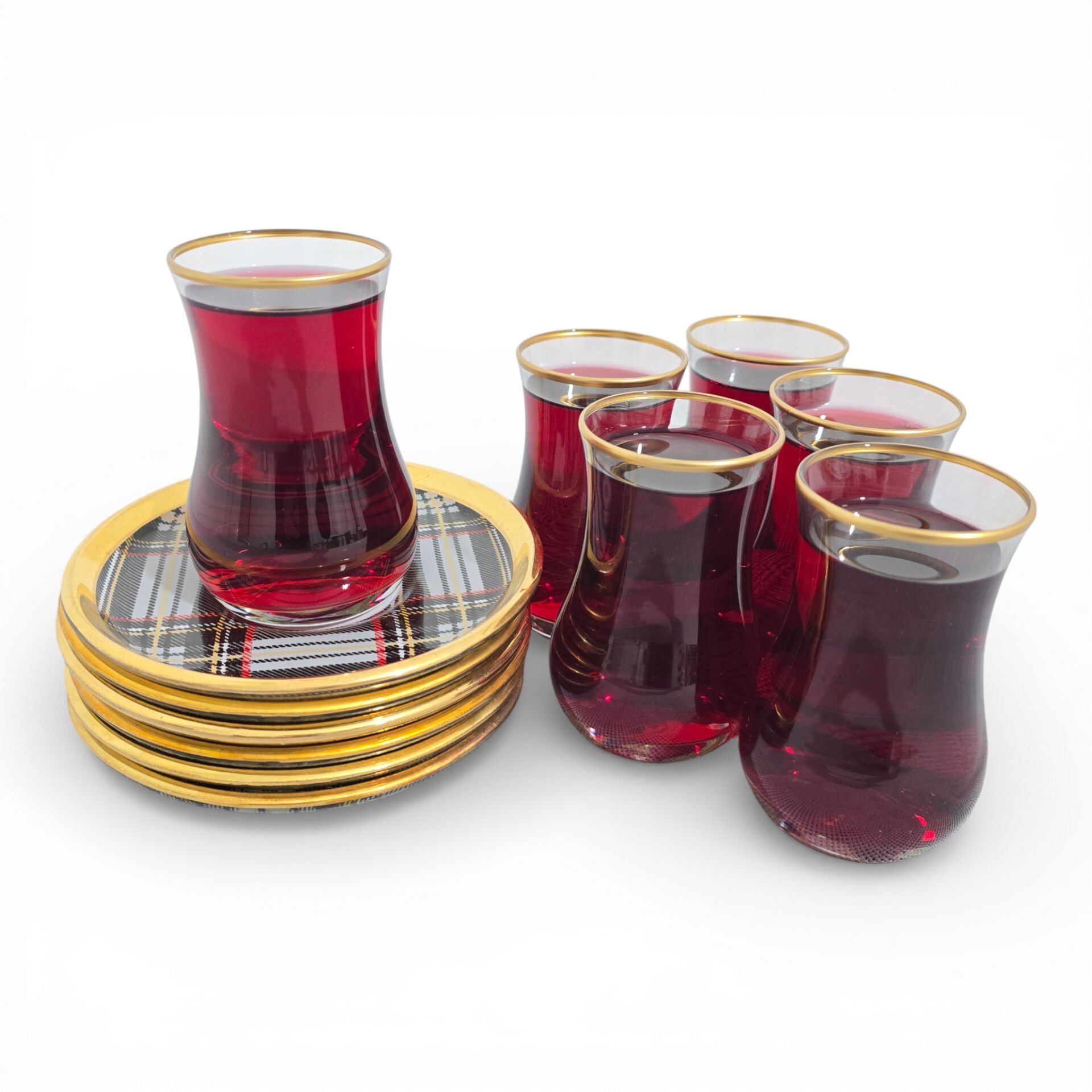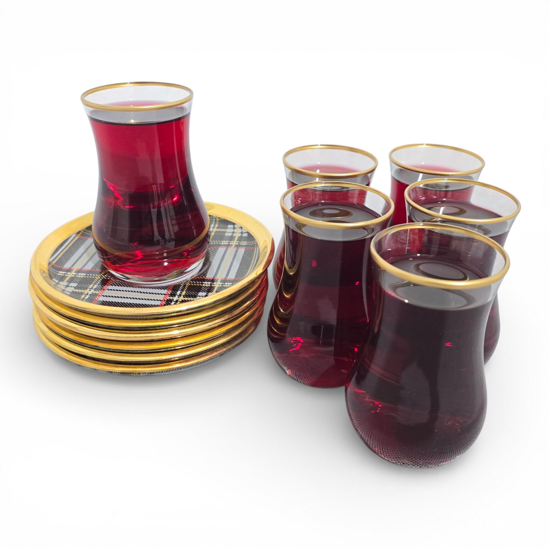 Ekose desenli cam çay tabakları ve zarif formdaki cam çay bardakları, hem tabak hem bardak kenarlarında kullanılan gerçek altın yaldız ile güçlü ve premium bir duruş sunar.