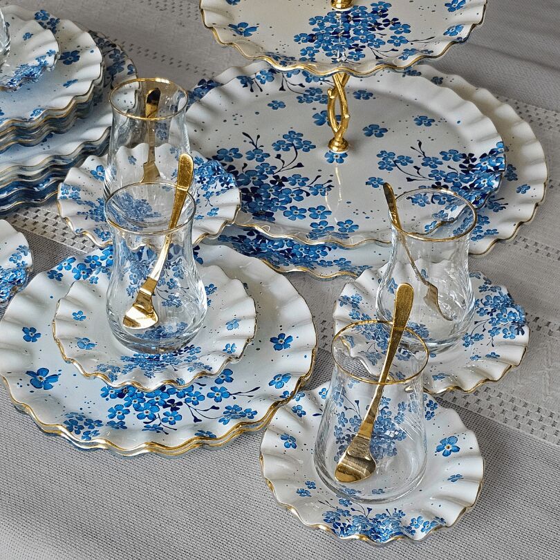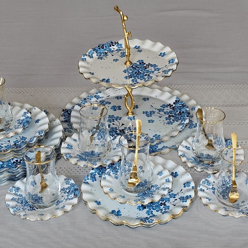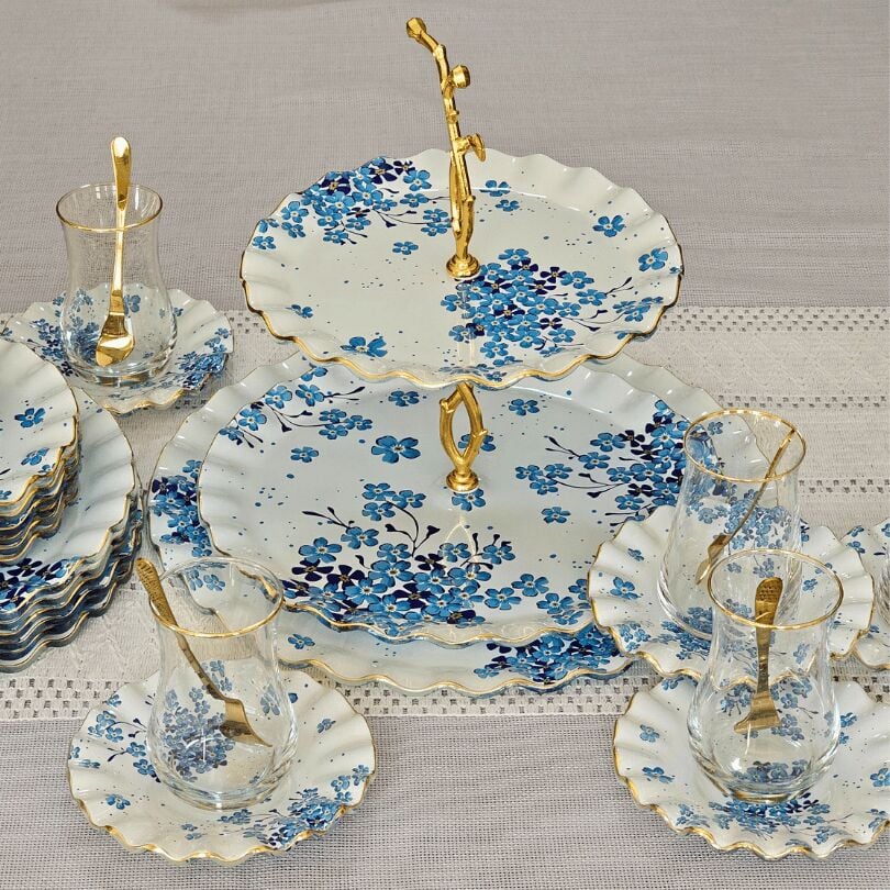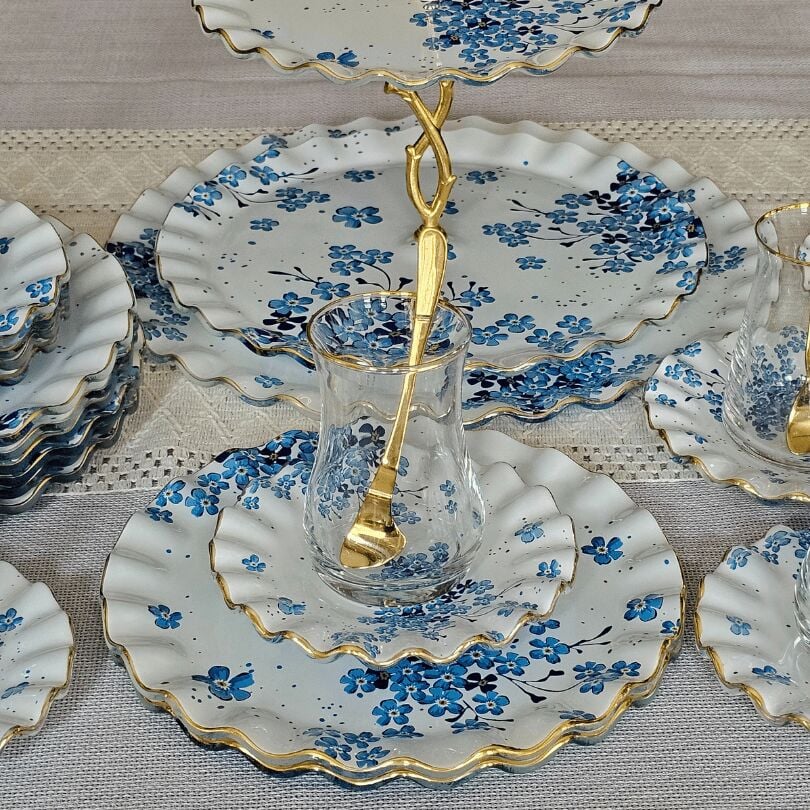 Glore Safir Altın Yaldızlı Cam 28 Parça Çay İkram Takımı Full Set