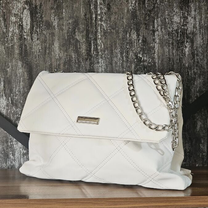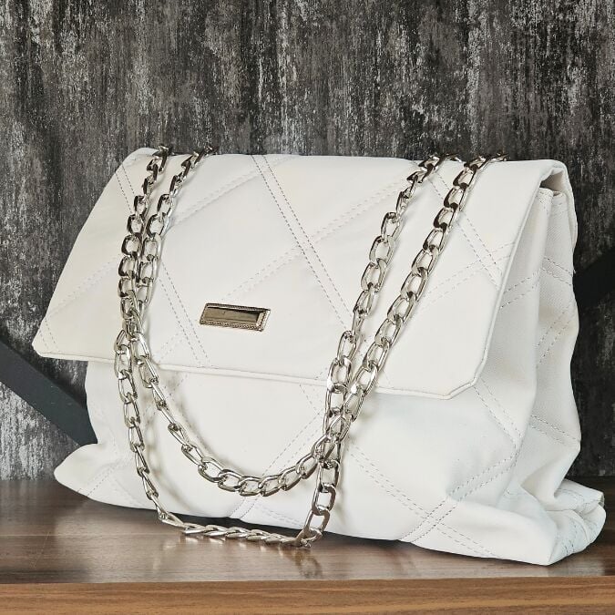 Beyazın zamansız asaleti ve zincir detayının modern ışıltısı, bu çantayı her ortamda dikkat çekici kılmaktadır.