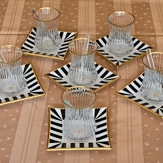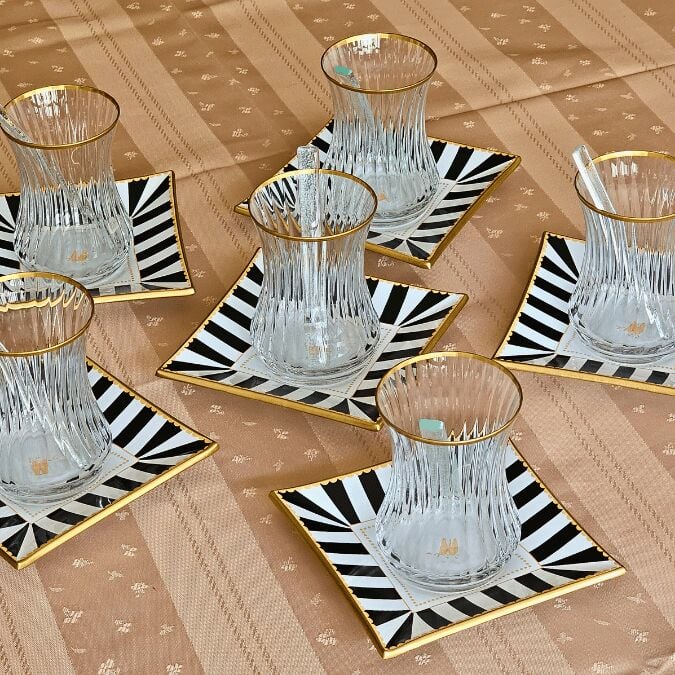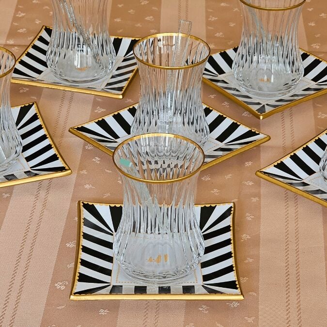 6 adet altın yaldızlı cam çay tabağı