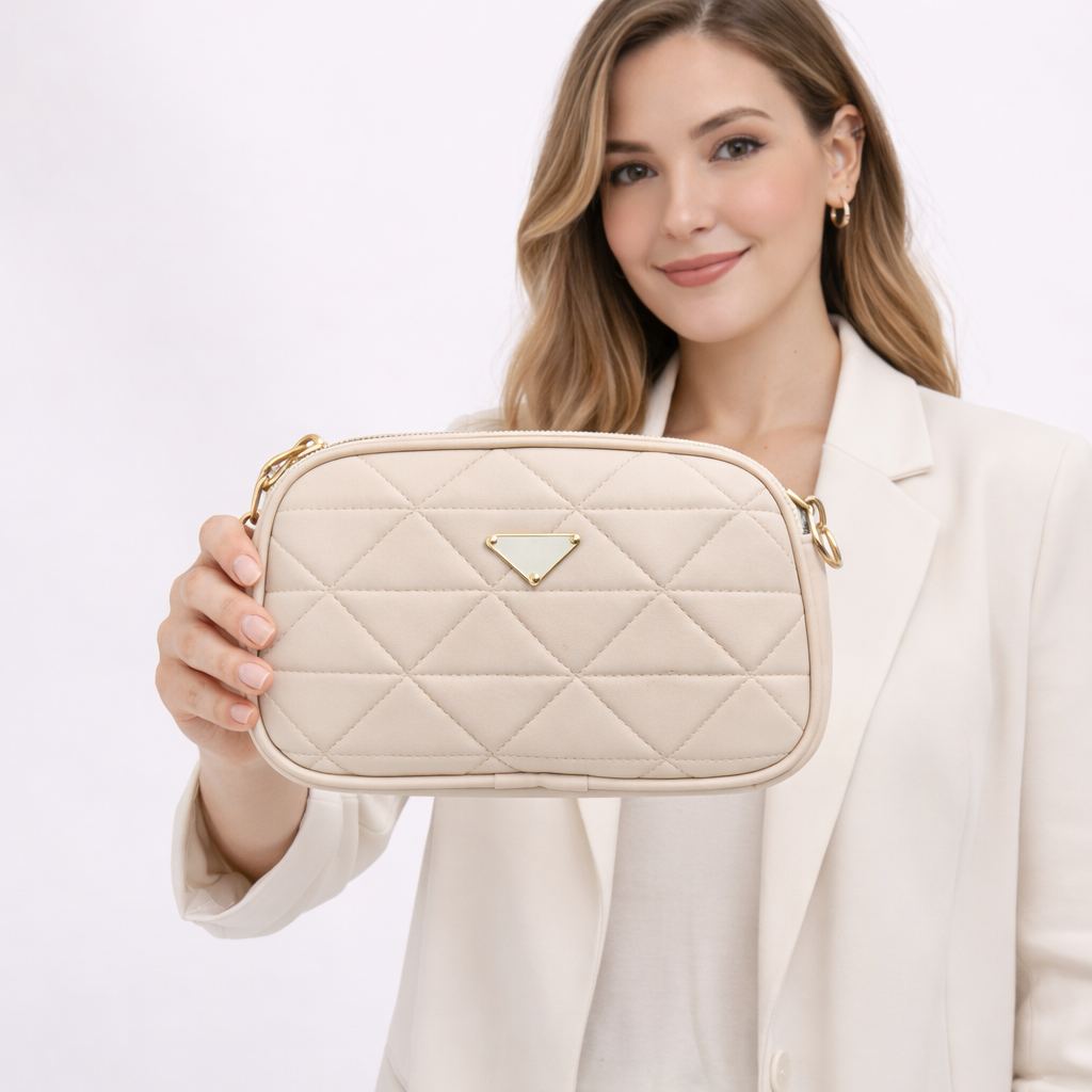 Sudedi Home modern kapitone tasarımı ve zarif bej rengi ile günlük kullanım için tasarlanmış şık kadın çapraz omuz çantasıdır.