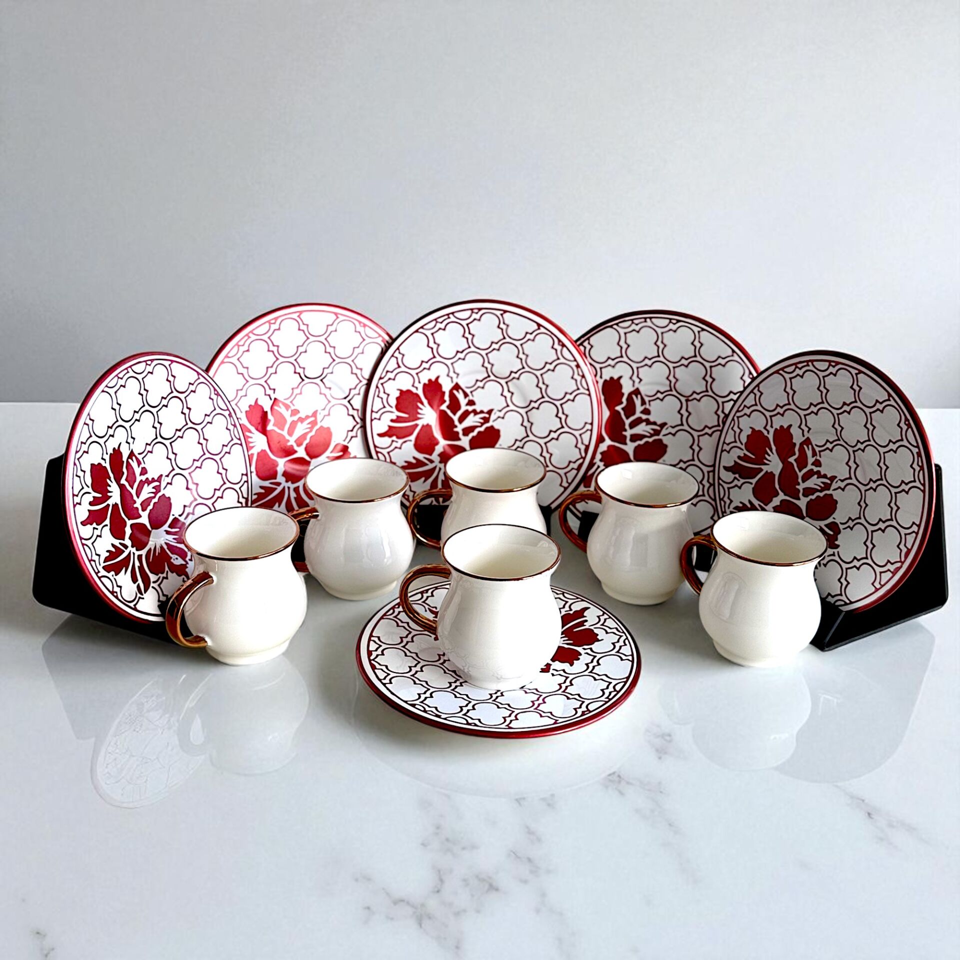Her bir parçası özenle tasarlanmış olan bu lüks kahve fincan takımı, canlı kırmızı ve beyaz desenleri ile dikkat çekiyor.
