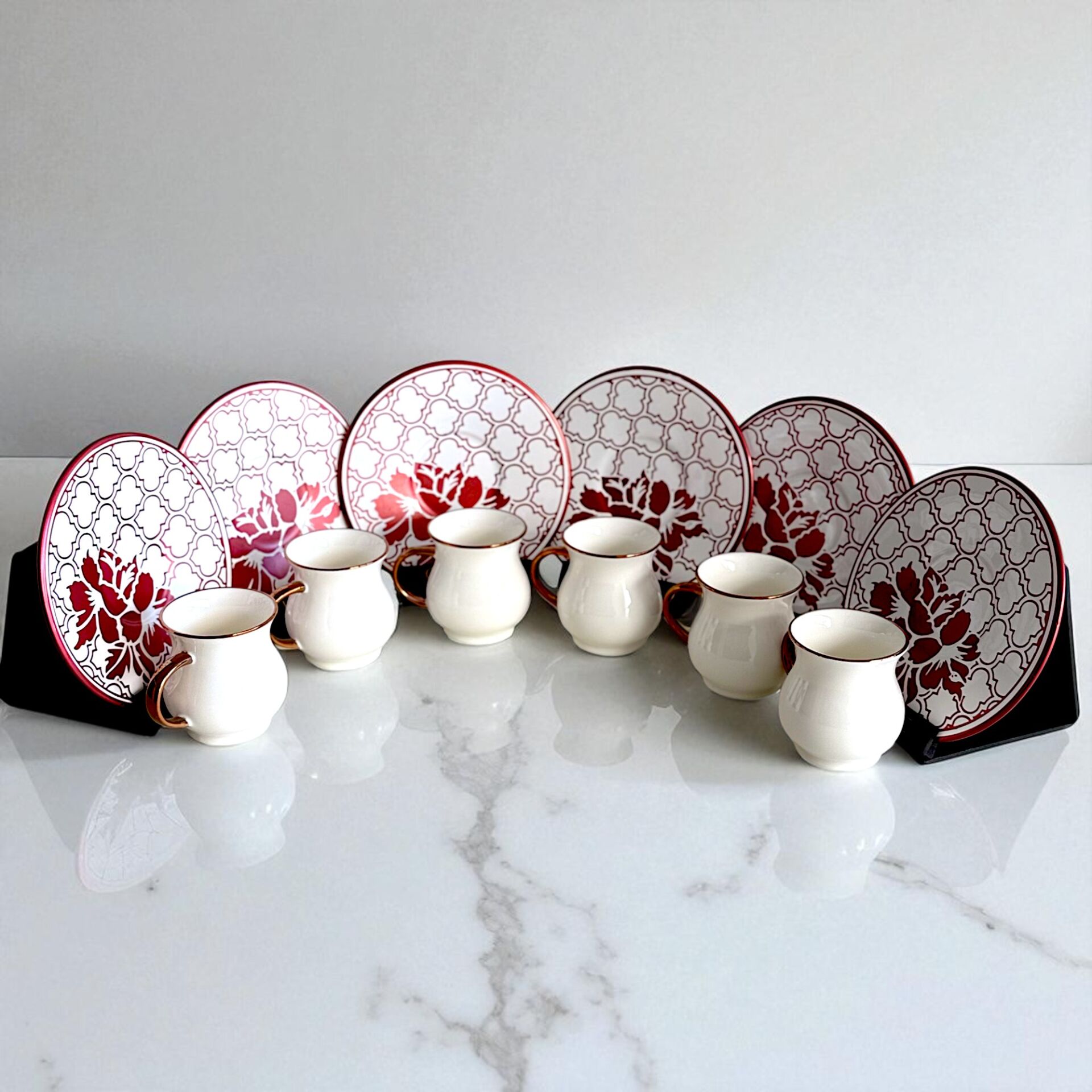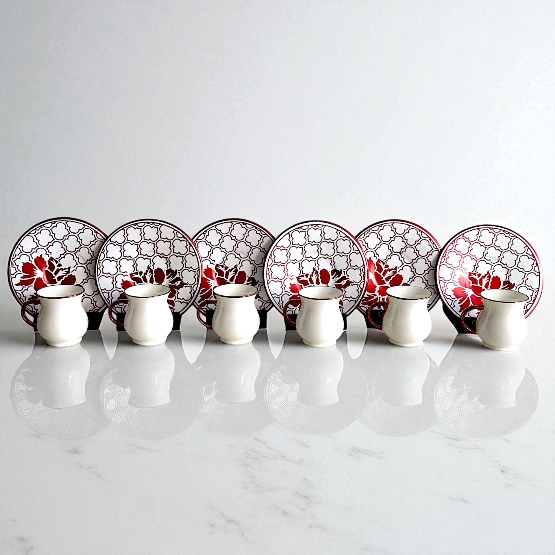 Kırmızı Beyaz Desenli Porselen 6 Kişilik Türk Kahvesi Fincan Takımı