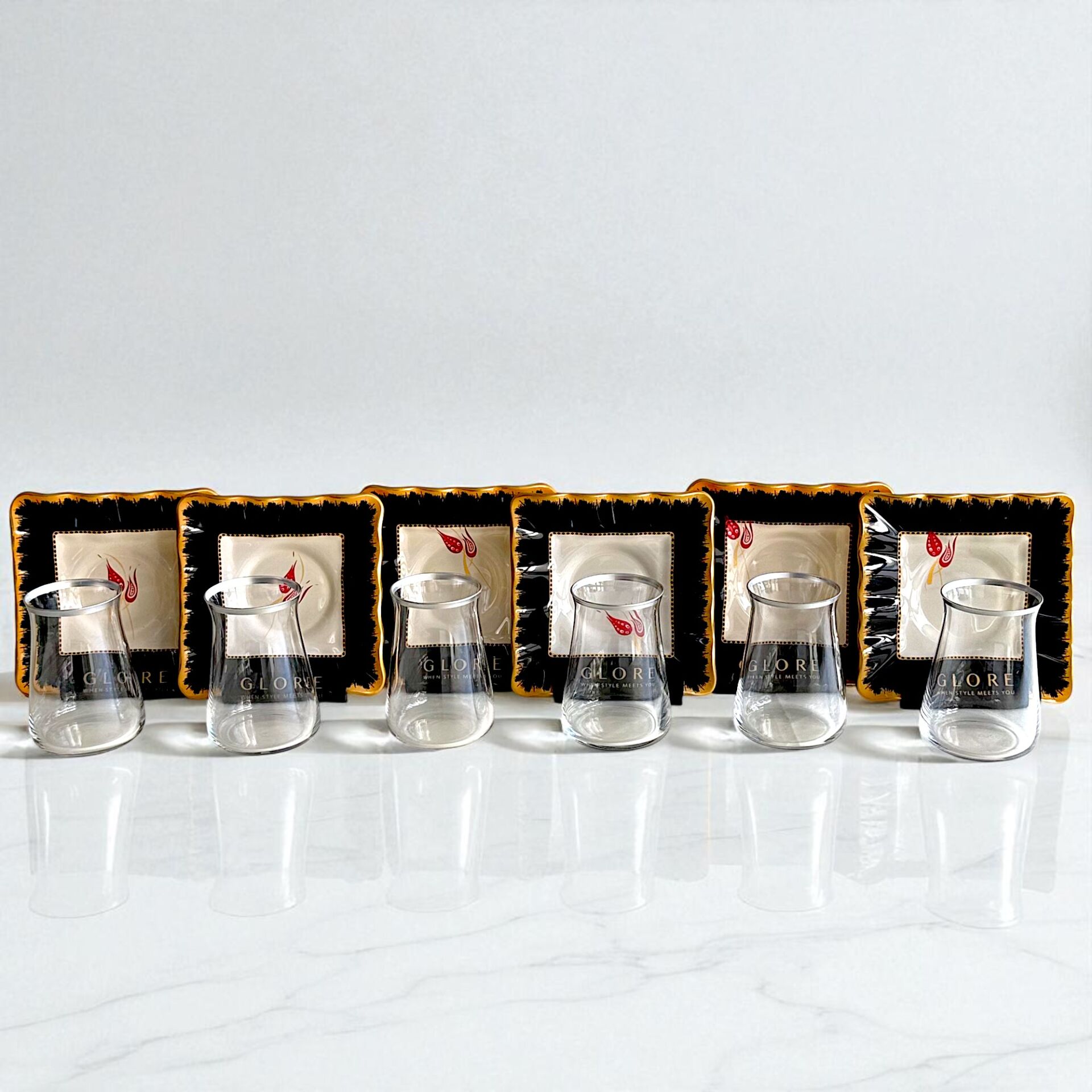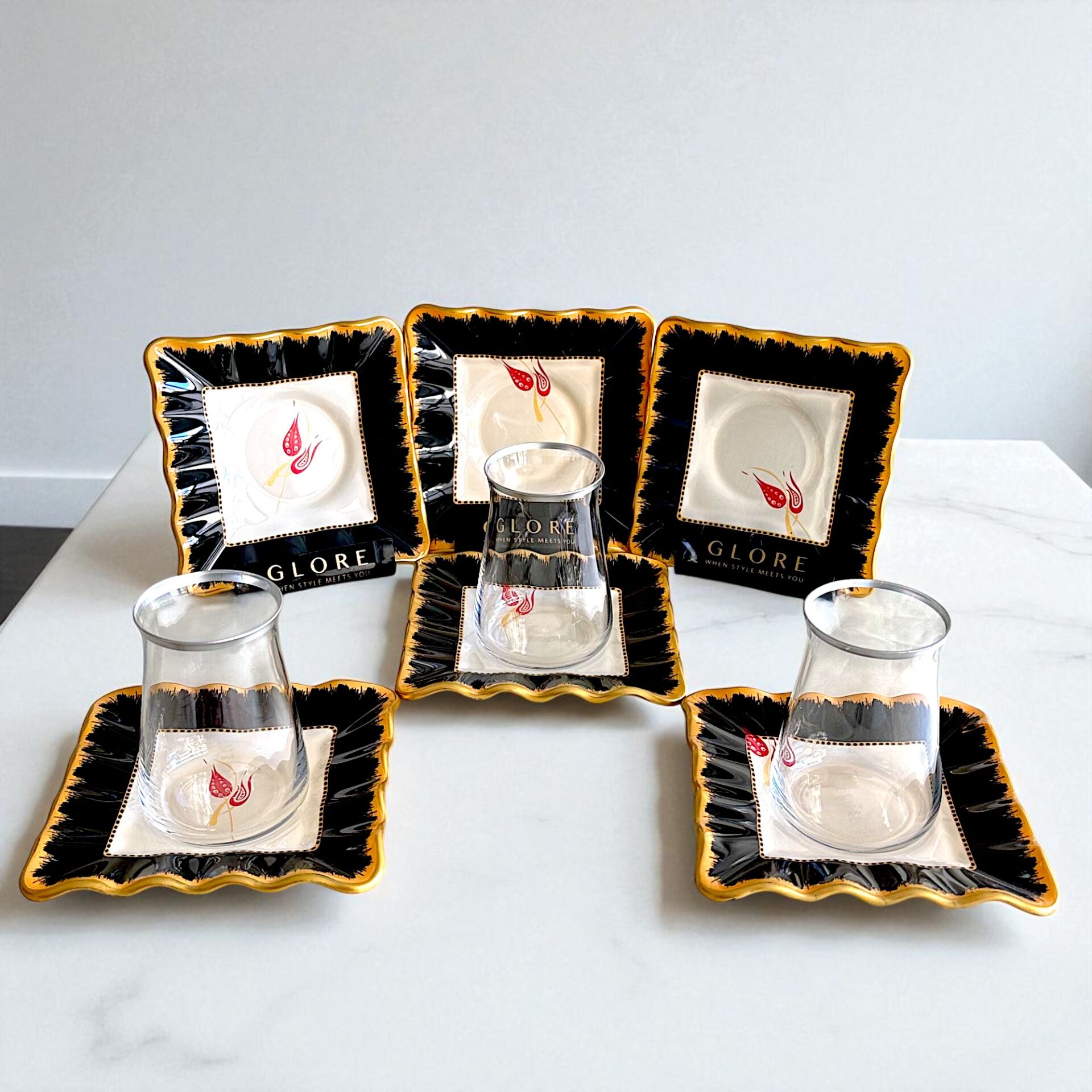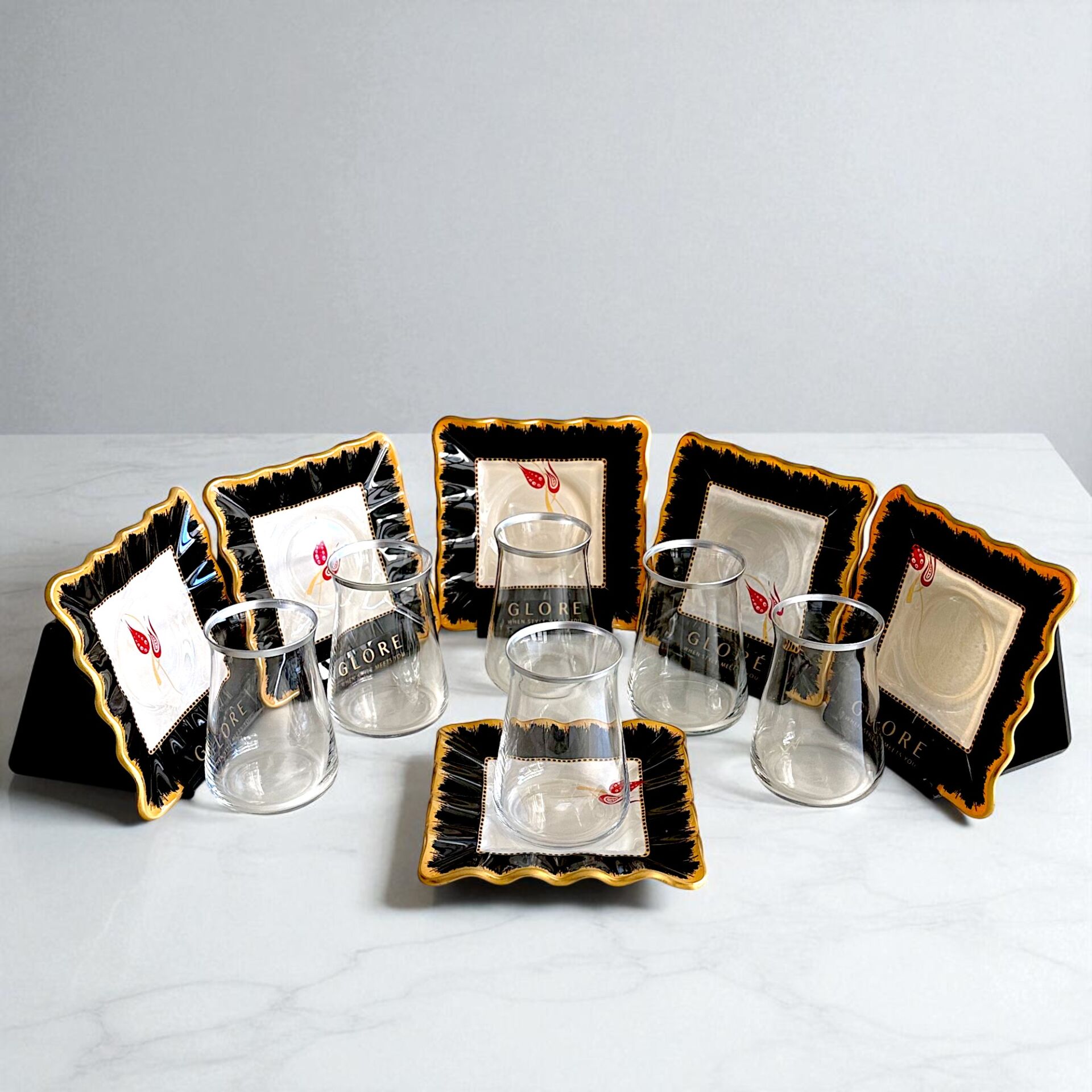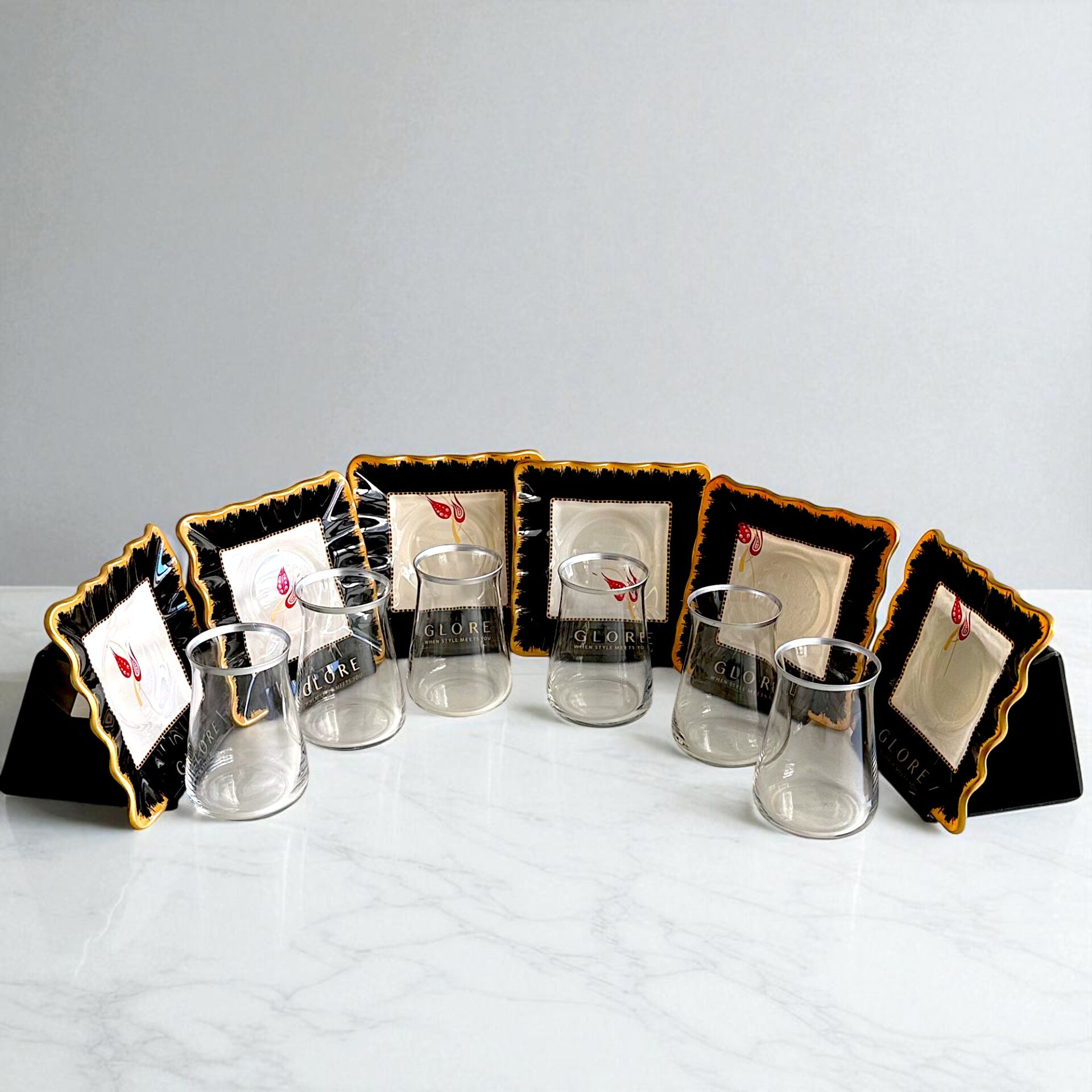 Sudedi Home'un bu özel 6 kişilik çay takımı, modern siyah çerçeveleri ve zarif altın varaklı lale motifleriyle dikkat çeker.