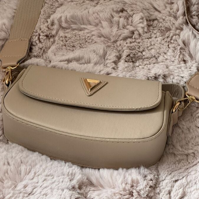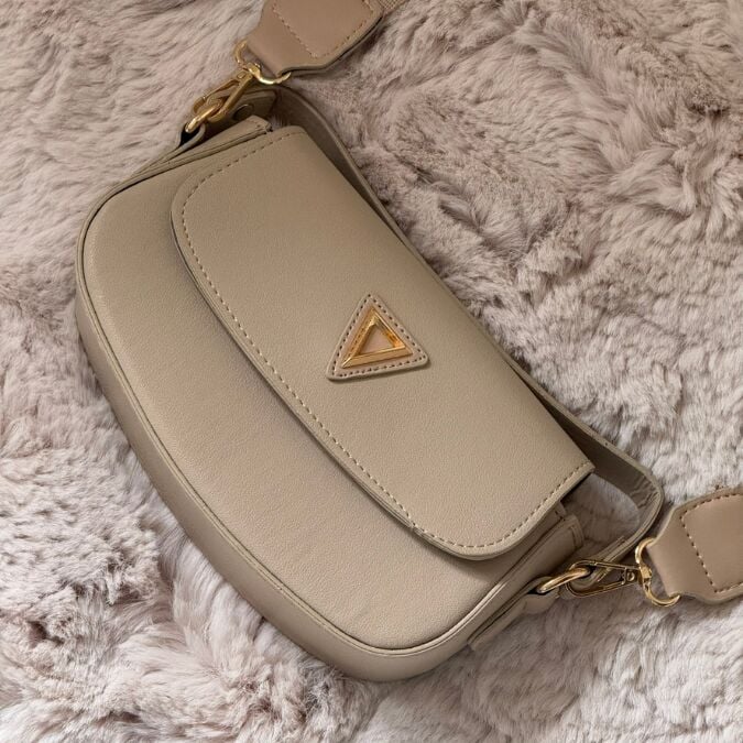 Çantanın ön yüzeyinde yer alan üçgen detay, tasarıma modern bir dokunuş katarken, ayarlanabilir geniş omuz askısı gün boyu konforlu bir kullanım sunar.
