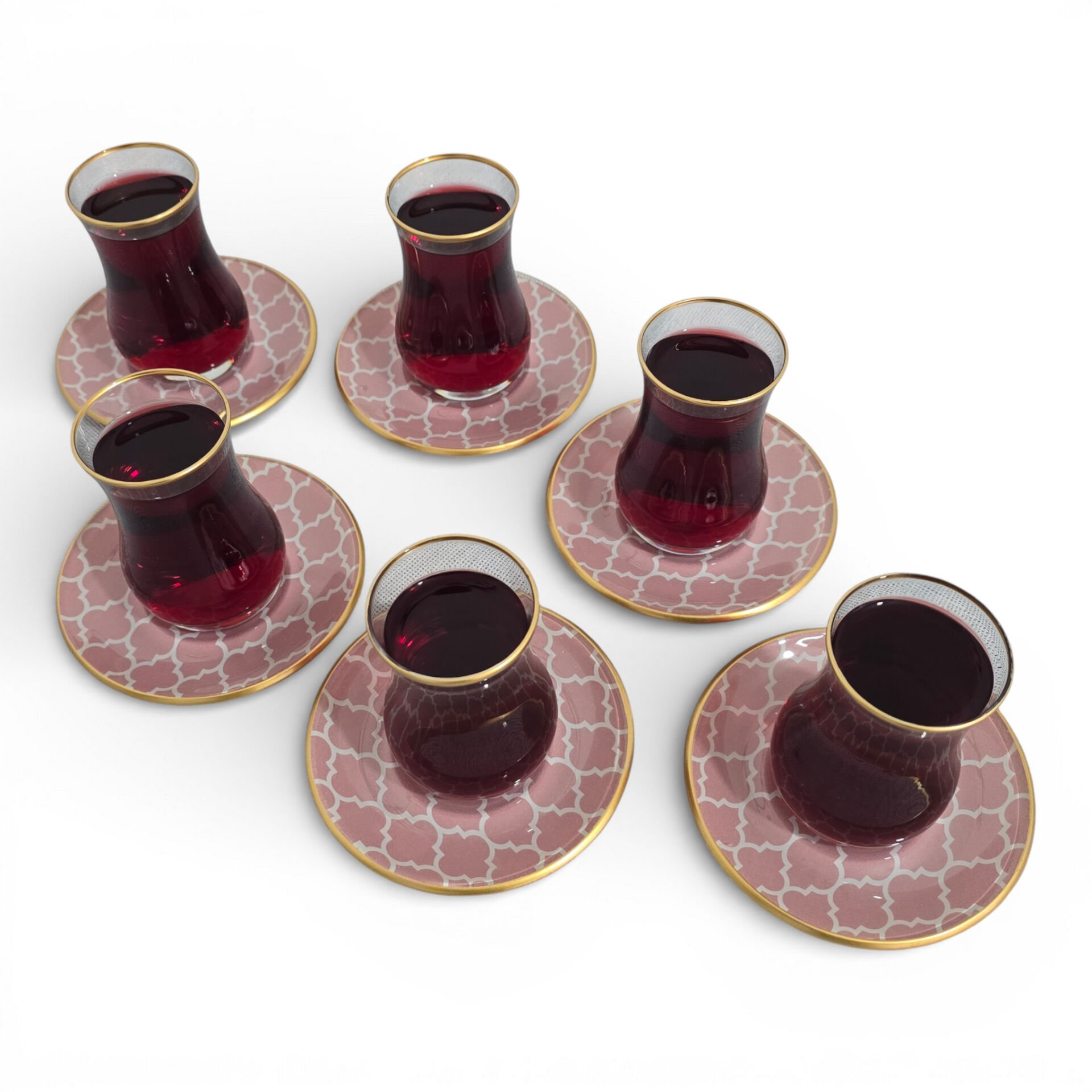 Sudedi Home kalitesiyle sunulan bu cam çay bardağı seti, premium duruşu ve şık pembe desenleriyle sofralarda fark yaratır.