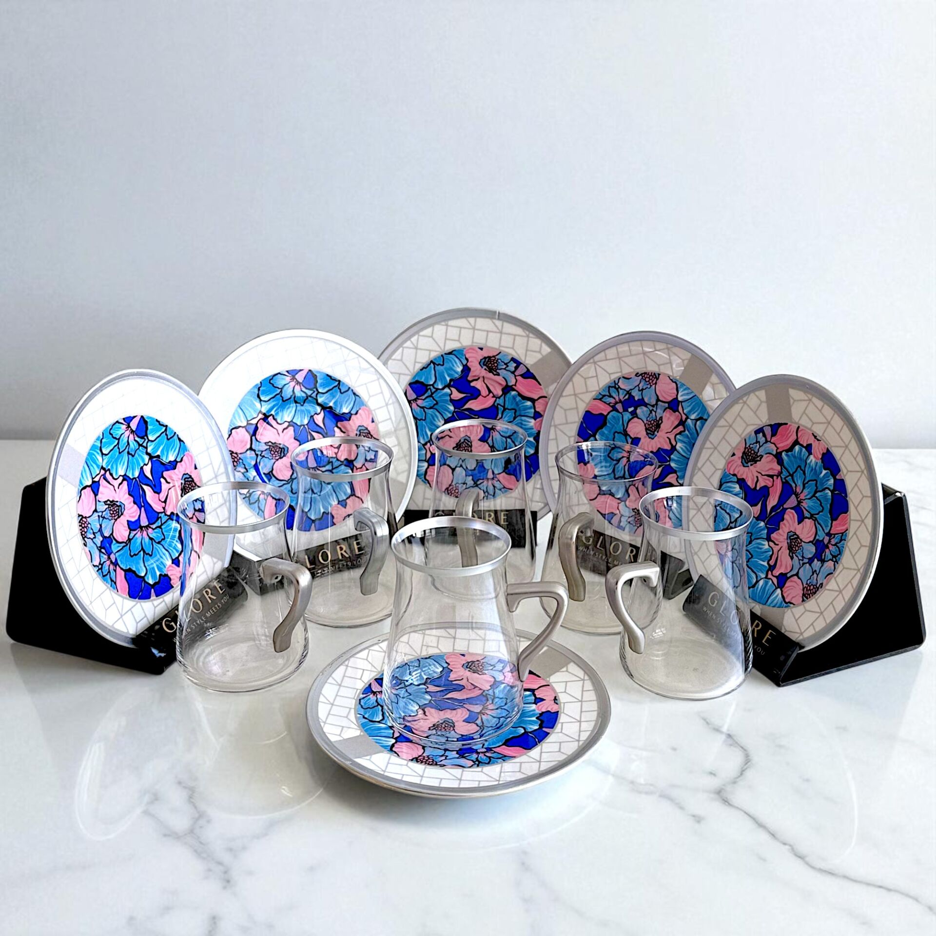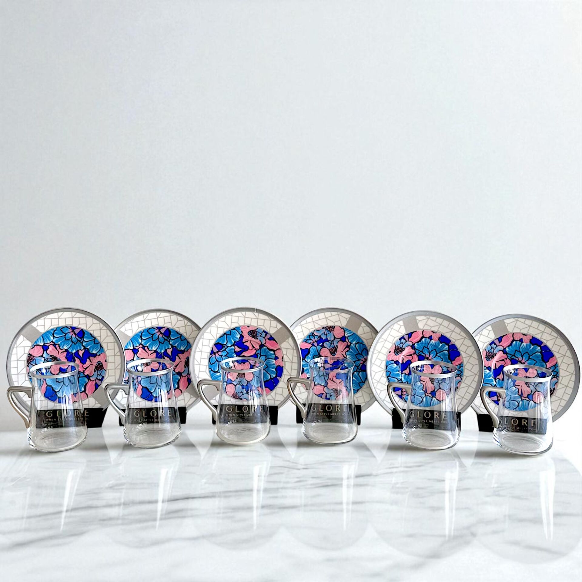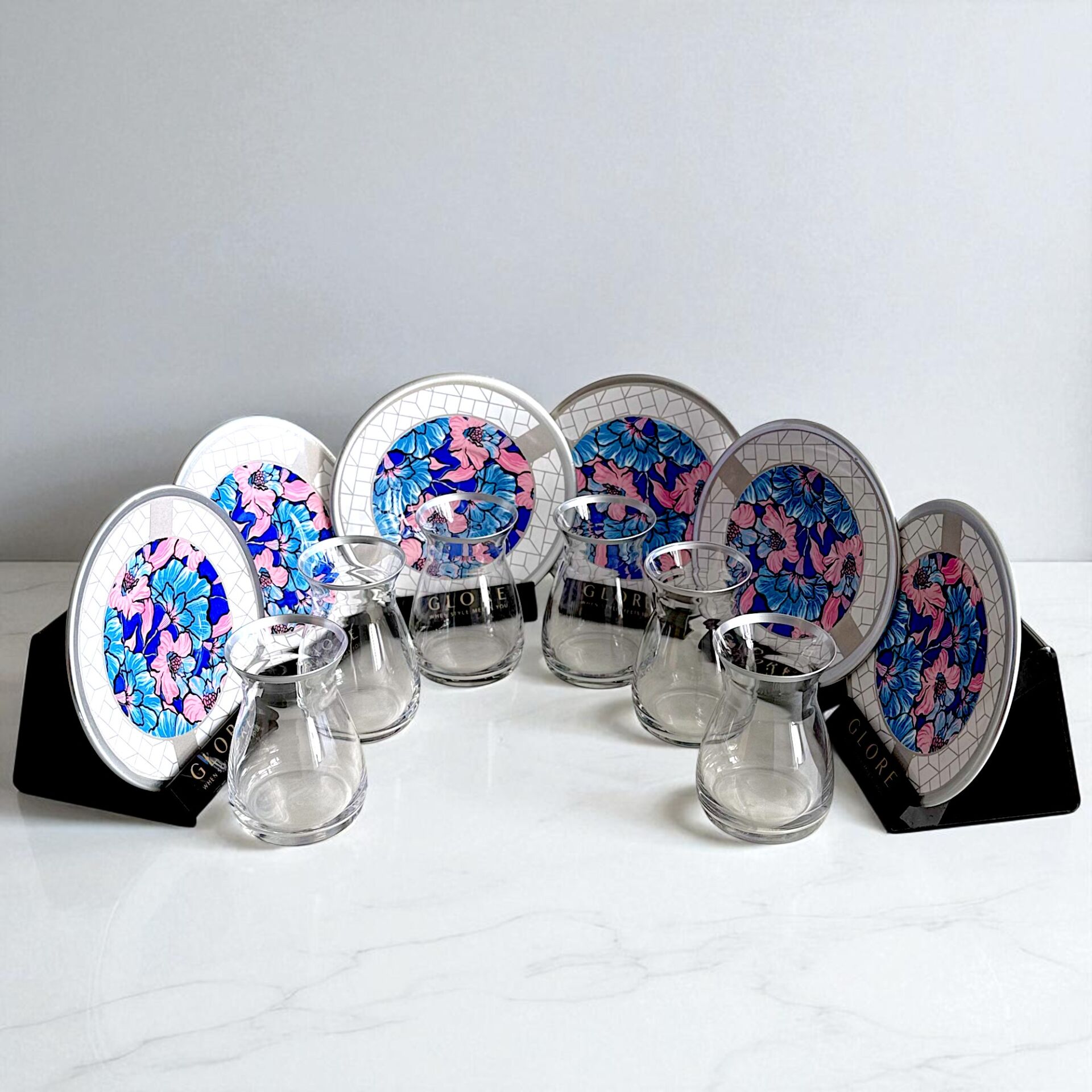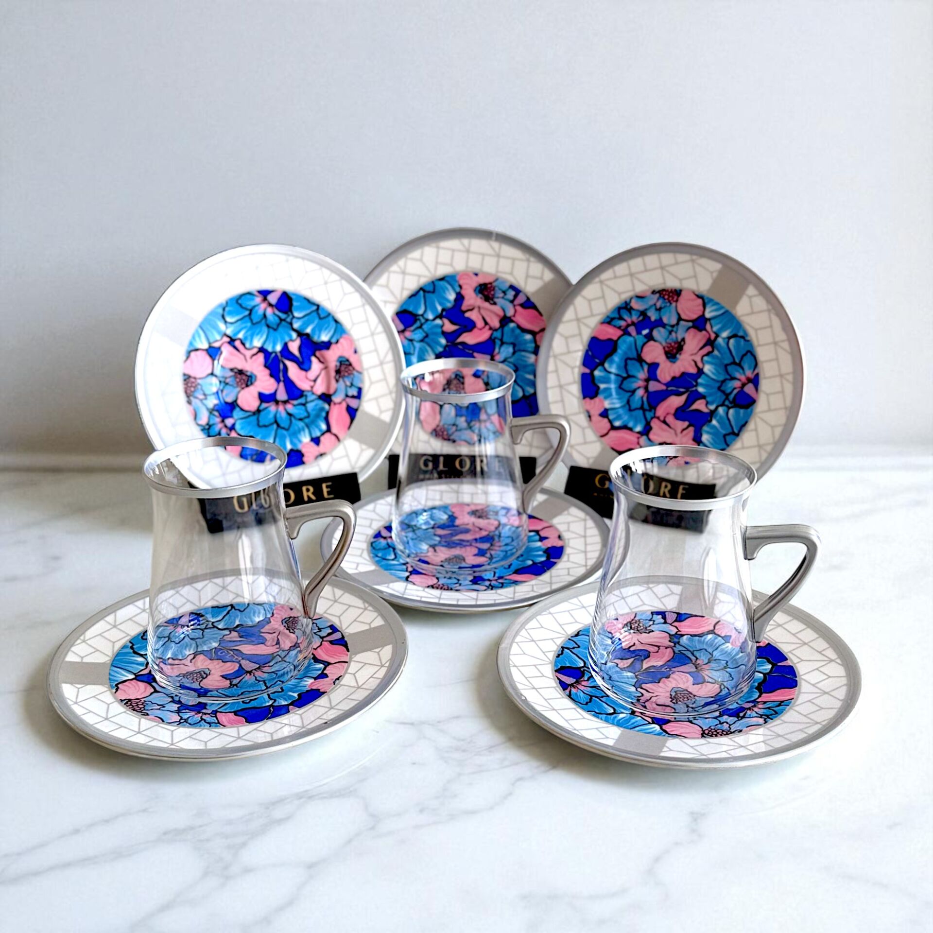 Sudedi Home'un sunduğu bu özel 6 kişilik çay bardağı takımı, canlı pembe ve mavi çiçek desenleri ile dikkat çeker.