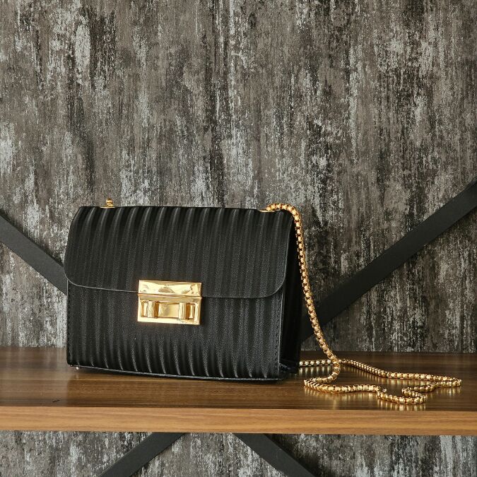 Modern ve dikkat çekici piliseli dokusuyla öne çıkan bu omuz çantası, gold renkli tokası ve zincir askısıyla şıklığınıza ışıltı katacak.
