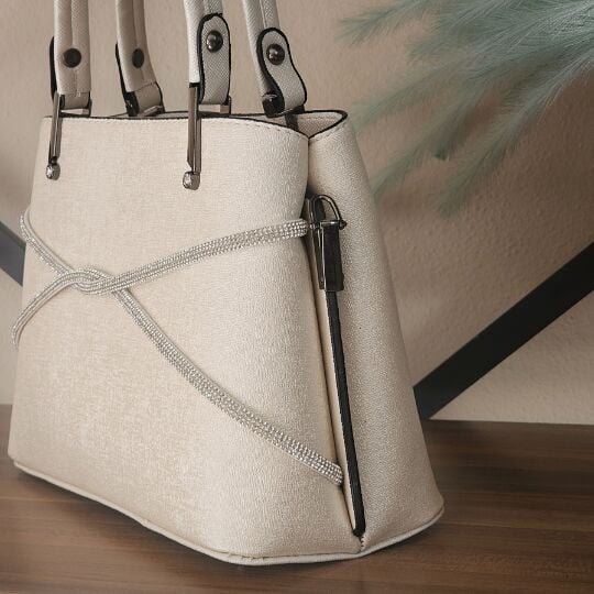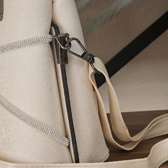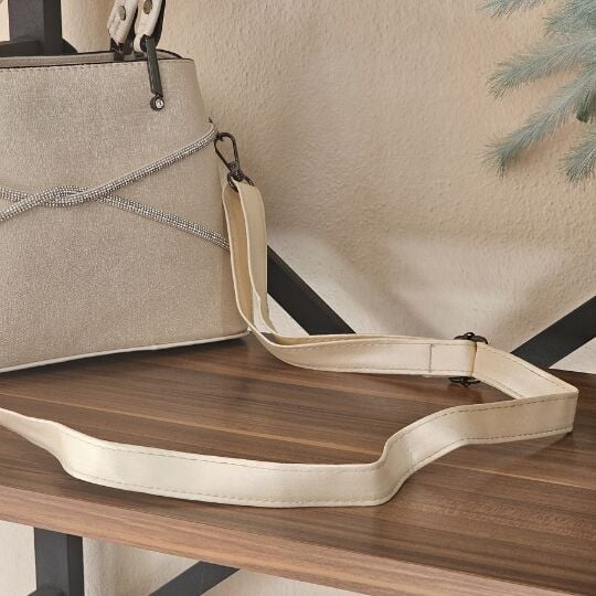 Zarif krem rengi ve parıltılı sim detaylarıyla göz alıcı bir tasarıma sahip bu çanta, şıklığıyla her ortamda dikkat çekiyor. Gündüzden geceye tüm kombinlerinize uyum sağlayan bu model, hem zarif hem de fonksiyonel yapısıyla vazgeçilmeziniz olacak.