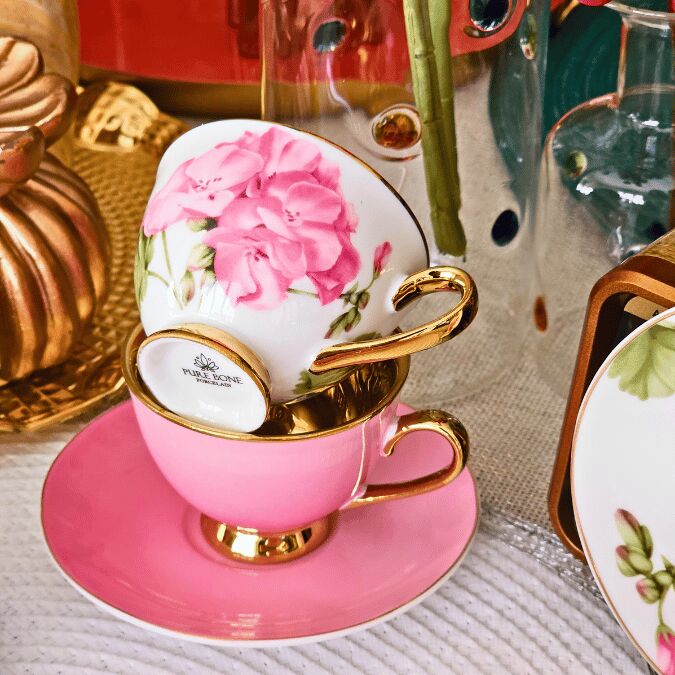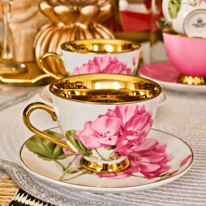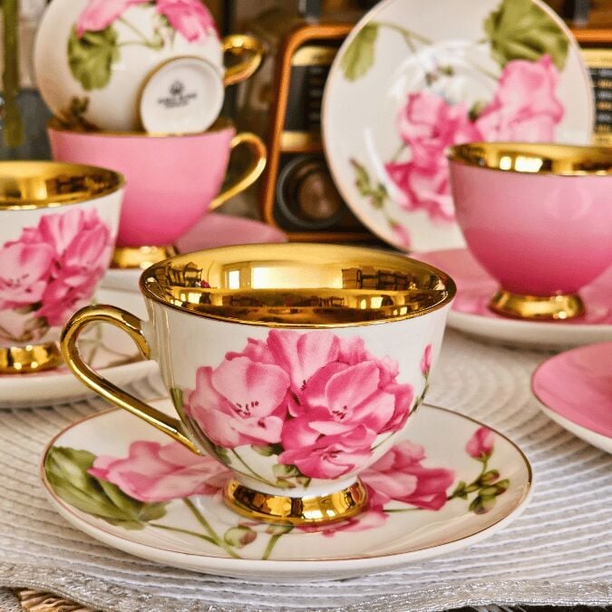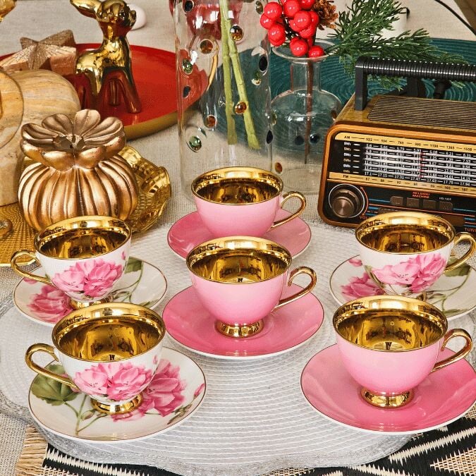 Smyrna Pembe Gold Çiçekli 6 Kişilik Porselen Kahve Fincan Takımı Harlem-725