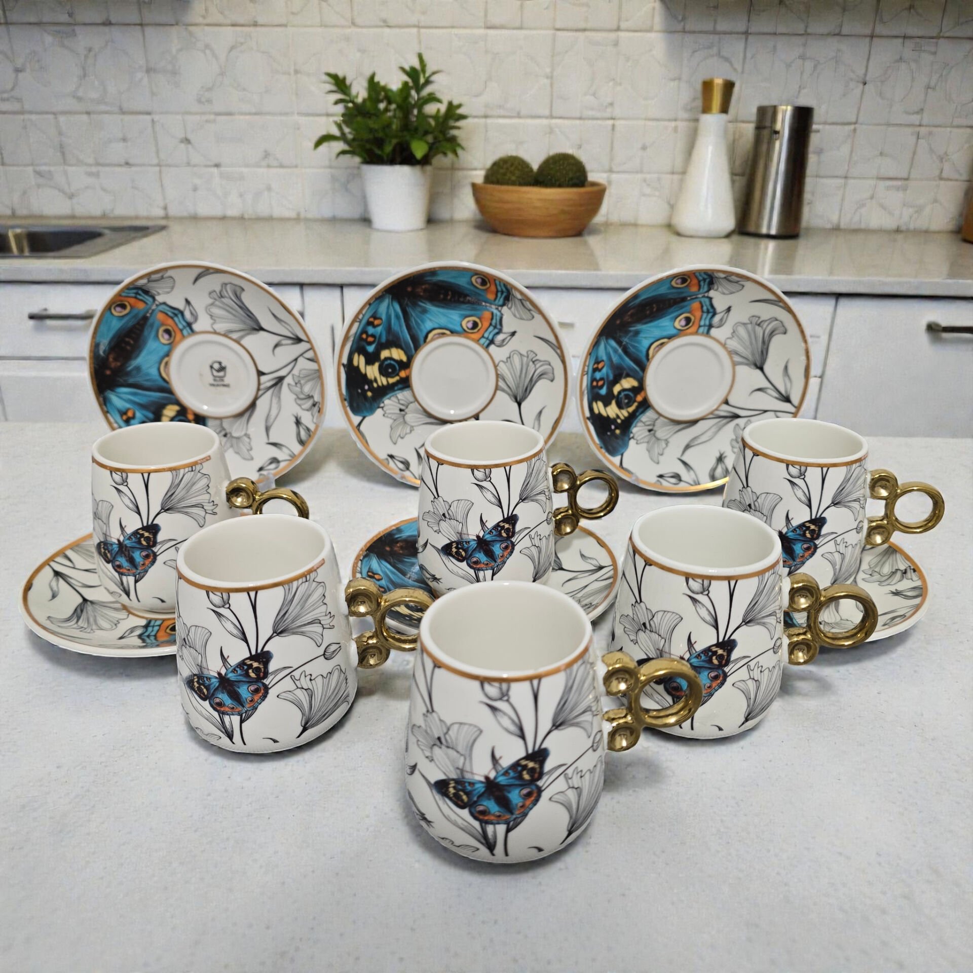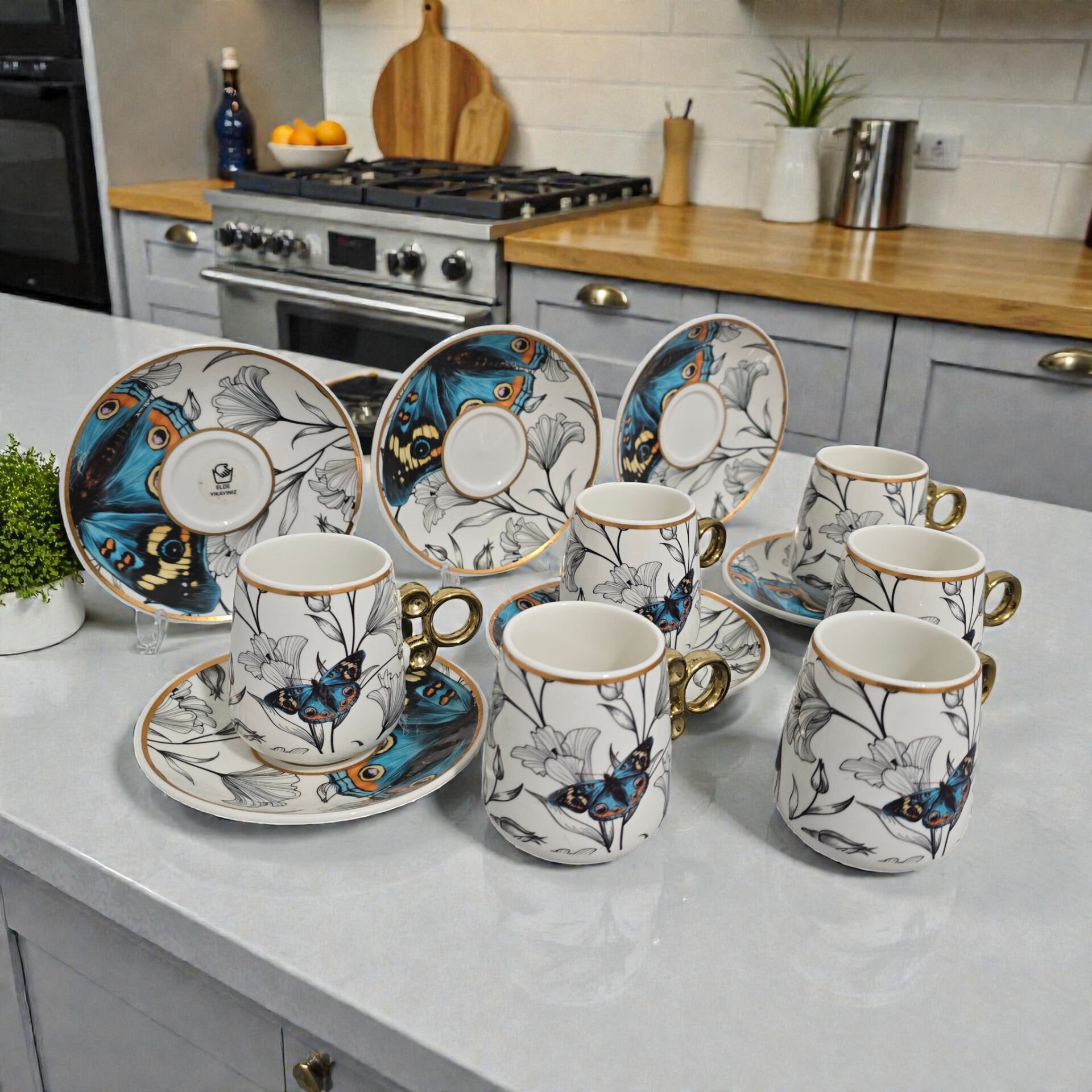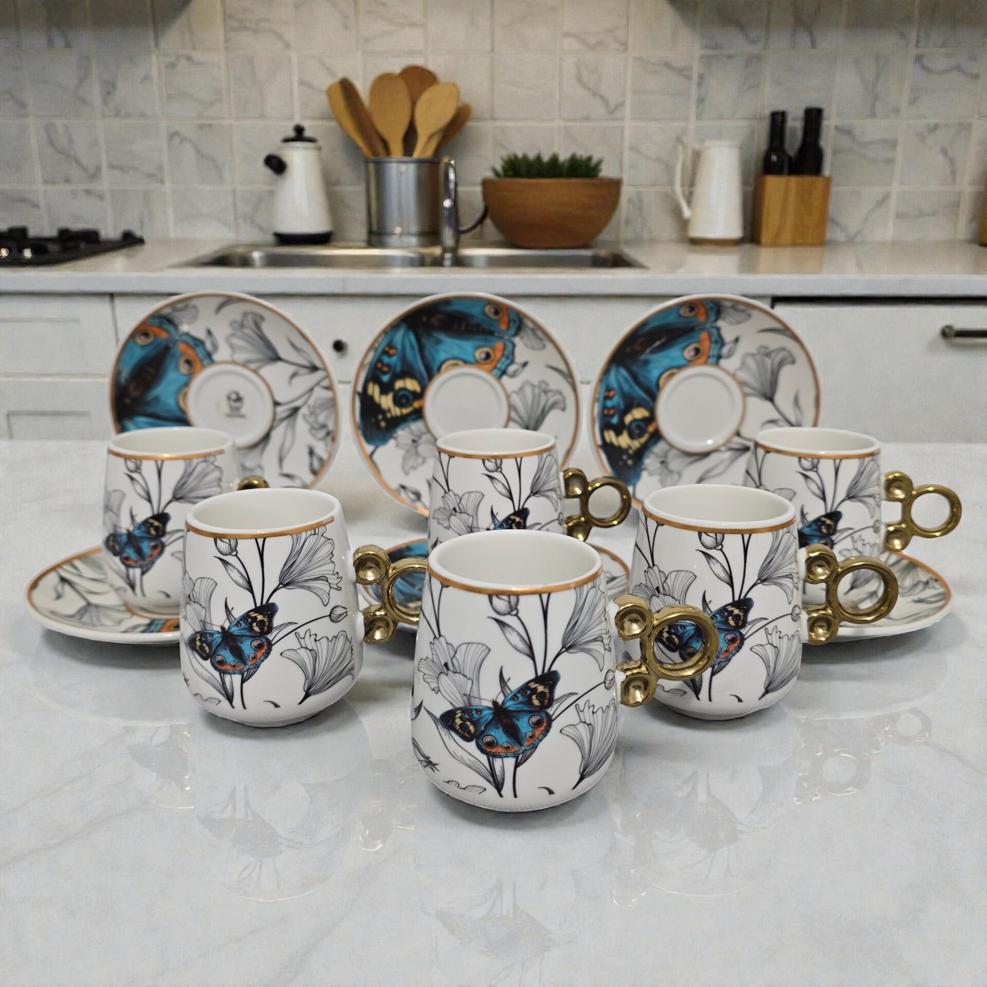 Modern tasarımıyla dikkat çeken bu kahve fincan takımı, 6 kişilik sofistike bir sunum sağlar.