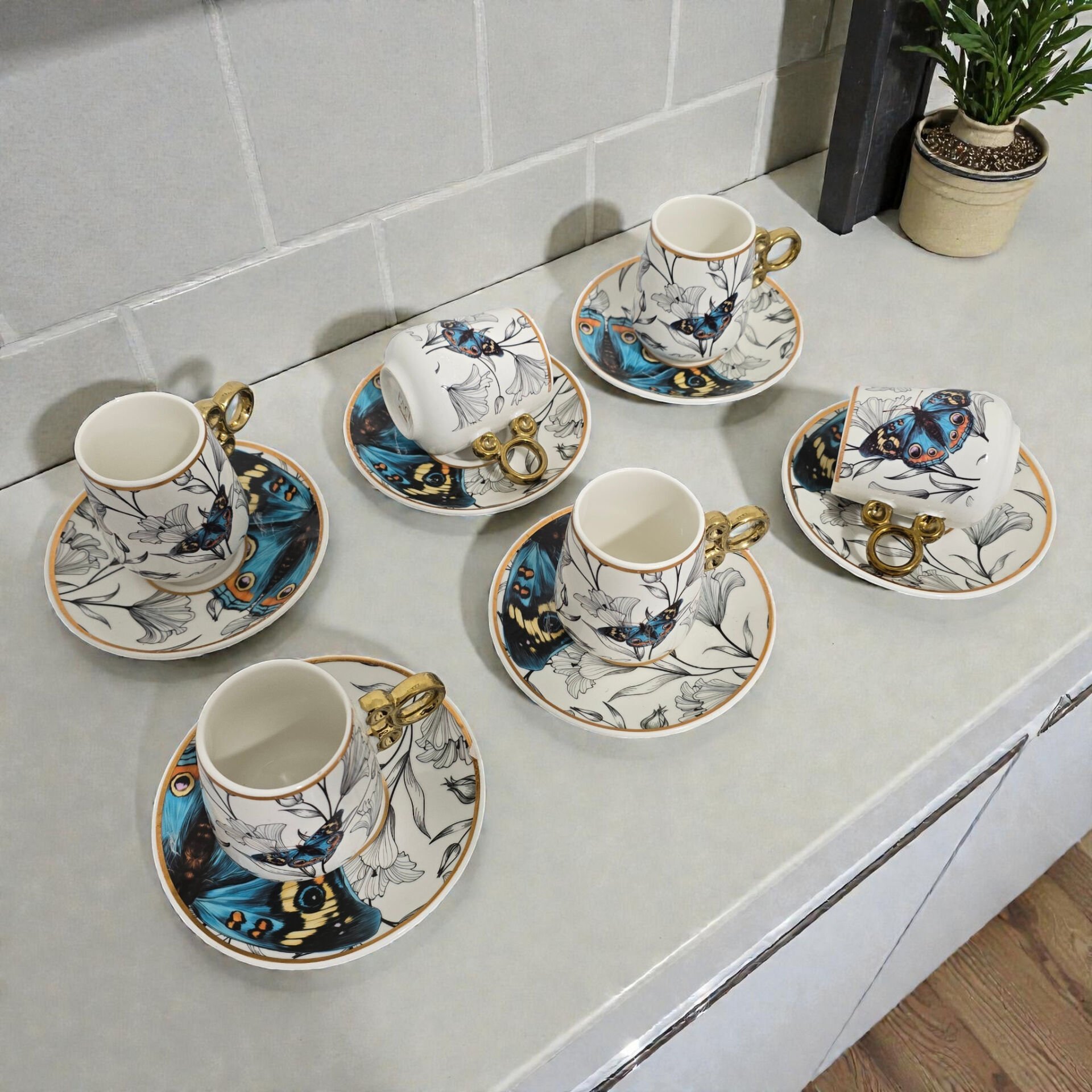 Sudedi Floral Renkli Yaldızlı 6 Kişilik Kahve Fincan Takımı