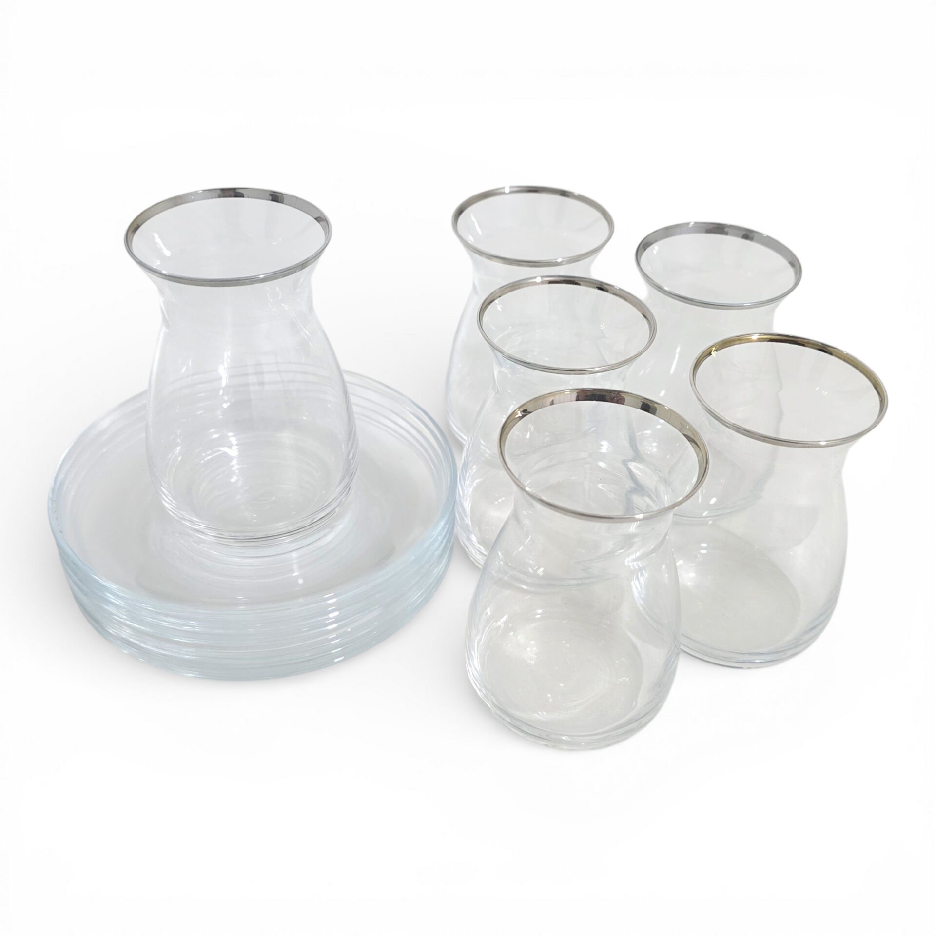 Şeffaf camın doğal ışıltısı ile platin yaldızın zarif kontrastı bir araya gelerek hem günlük kullanım hem misafir sunumları için dengeli ve şık bir alternatif oluşturur.