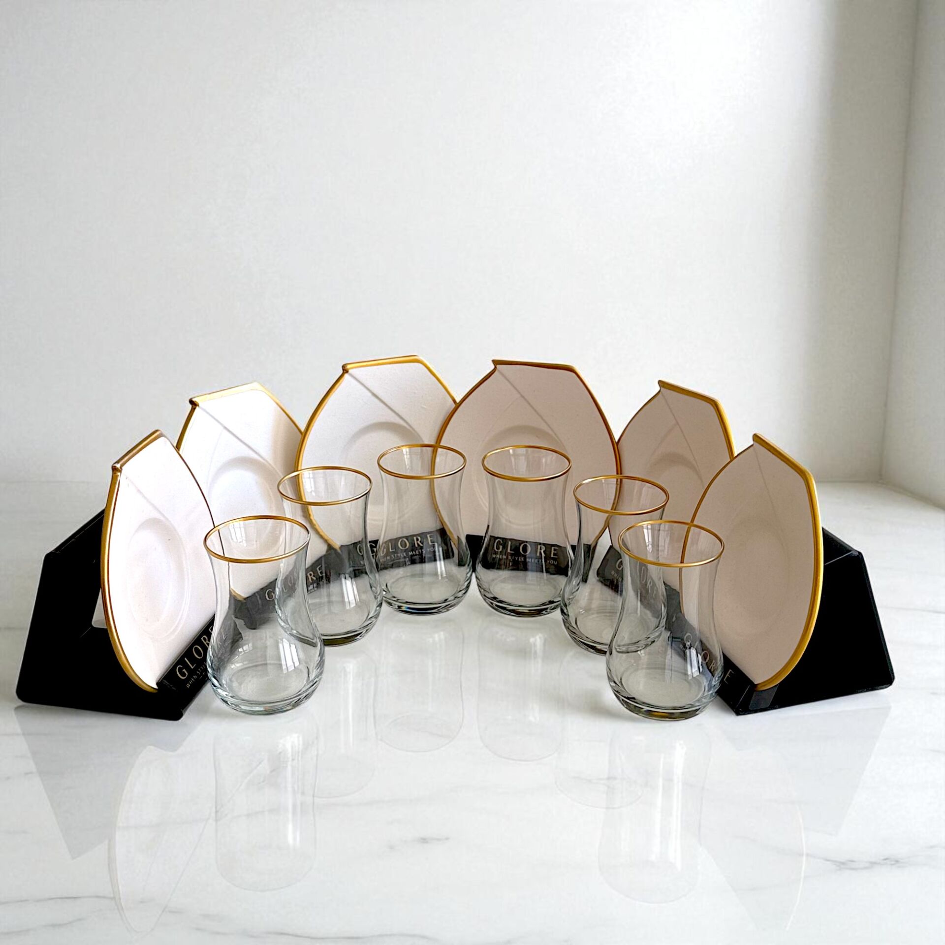 Sudedi Home'un özel tasarımı olan bu 12 parçalık çay bardağı seti, minimalist ve modern çizgileri bir araya getiriyor.
