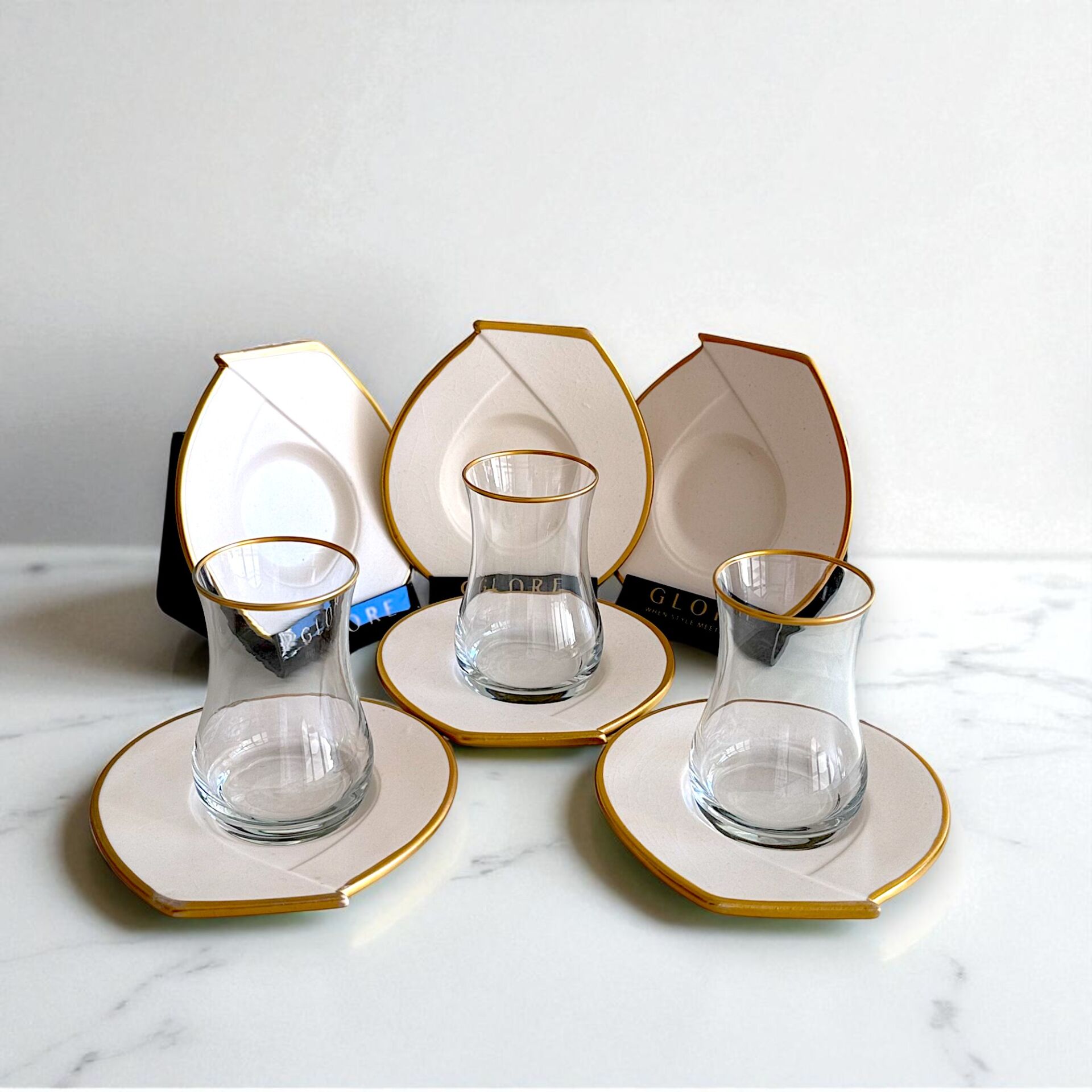 Benzersiz geometrik şekilli tabakları, zarif altın yaldız detayları ve ince cam çay bardaklarıyla göz alıcı bir uyum yakalıyor.