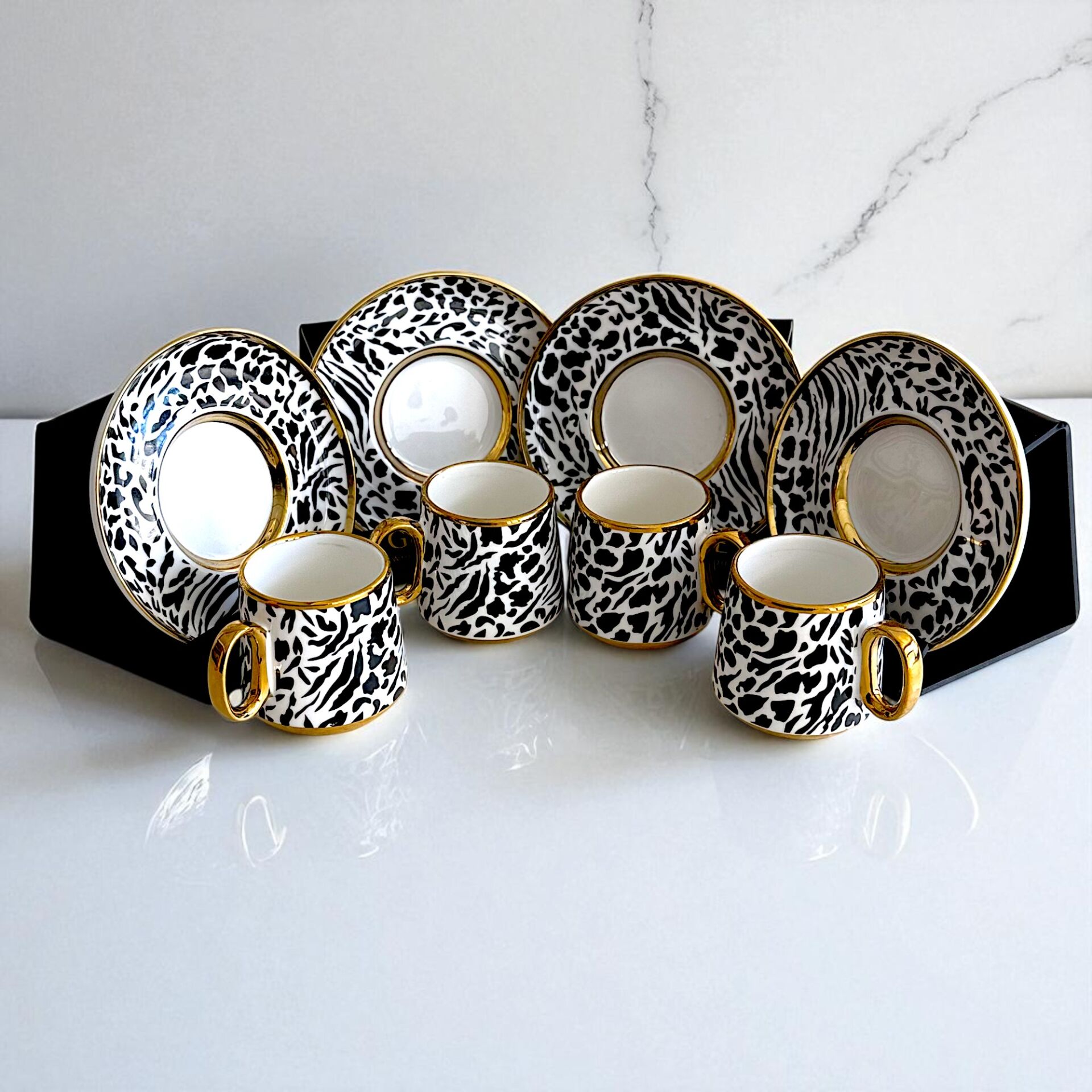 Kaliteli porselenden üretilen fincanlar, alt kısımlarındaki leopar ve üst kısımlarındaki zebra desenleriyle dikkat çekici bir tasarıma sahip.