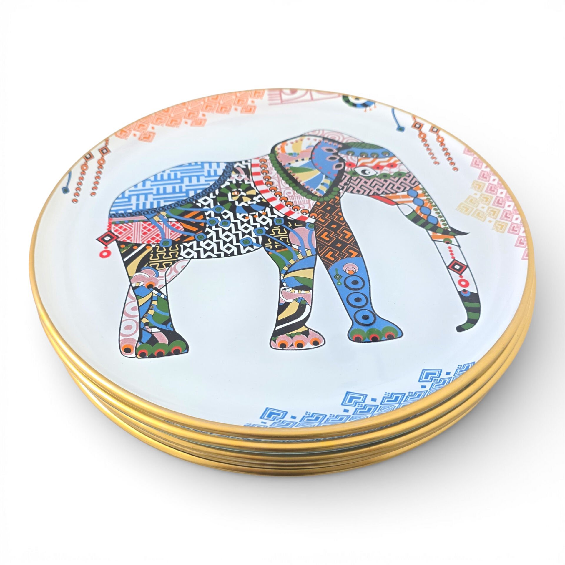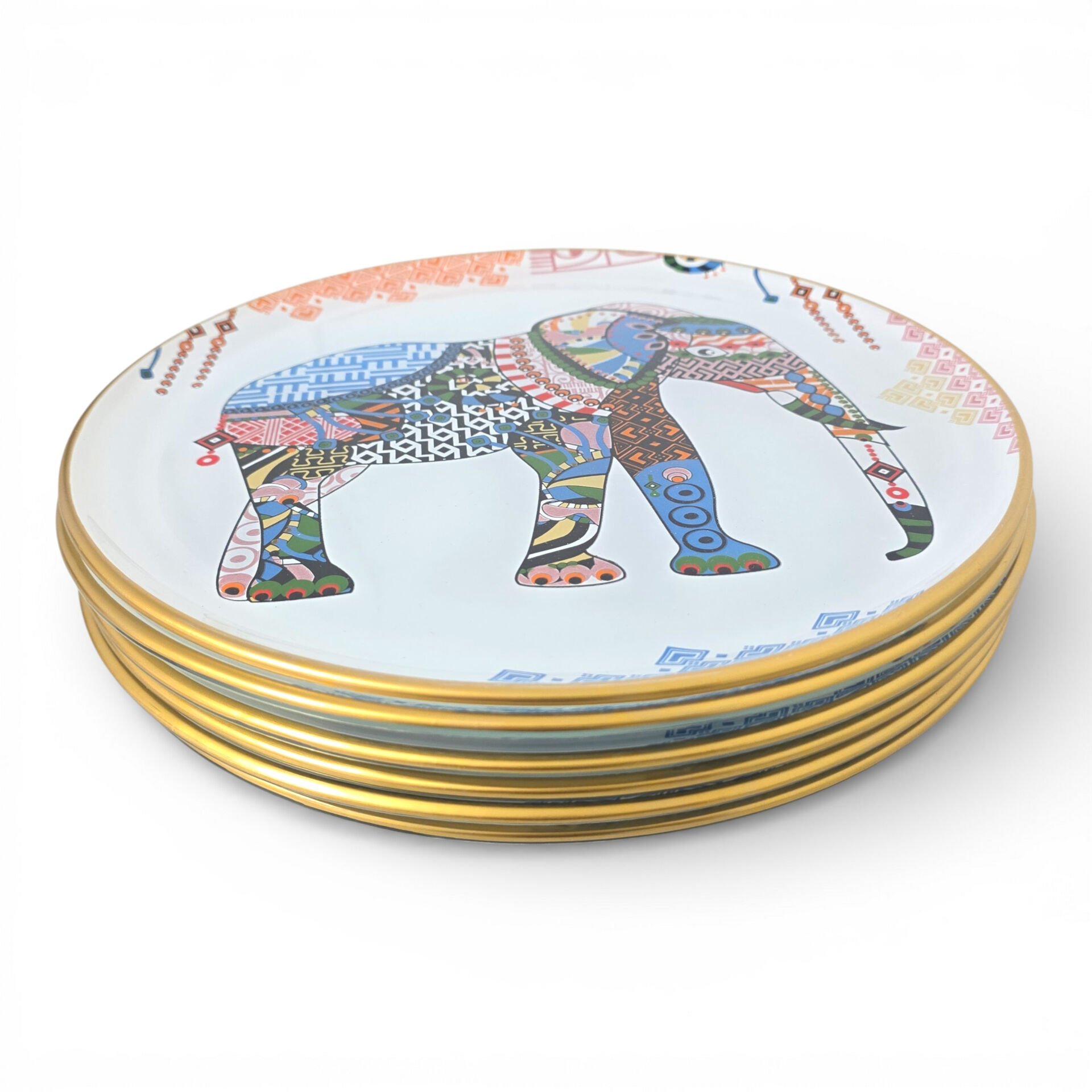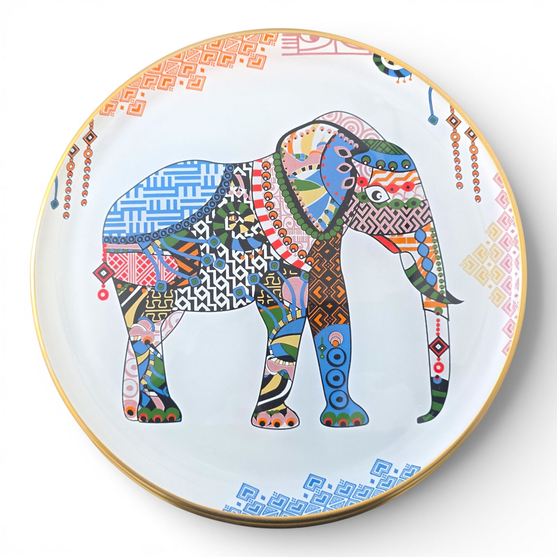Sudedi Home koleksiyonuna ait bu servis tabağı, beyaz zemin üzerinde yer alan çok renkli fil deseniyle güçlü ve dikkat çekici bir görünüme sahiptir.