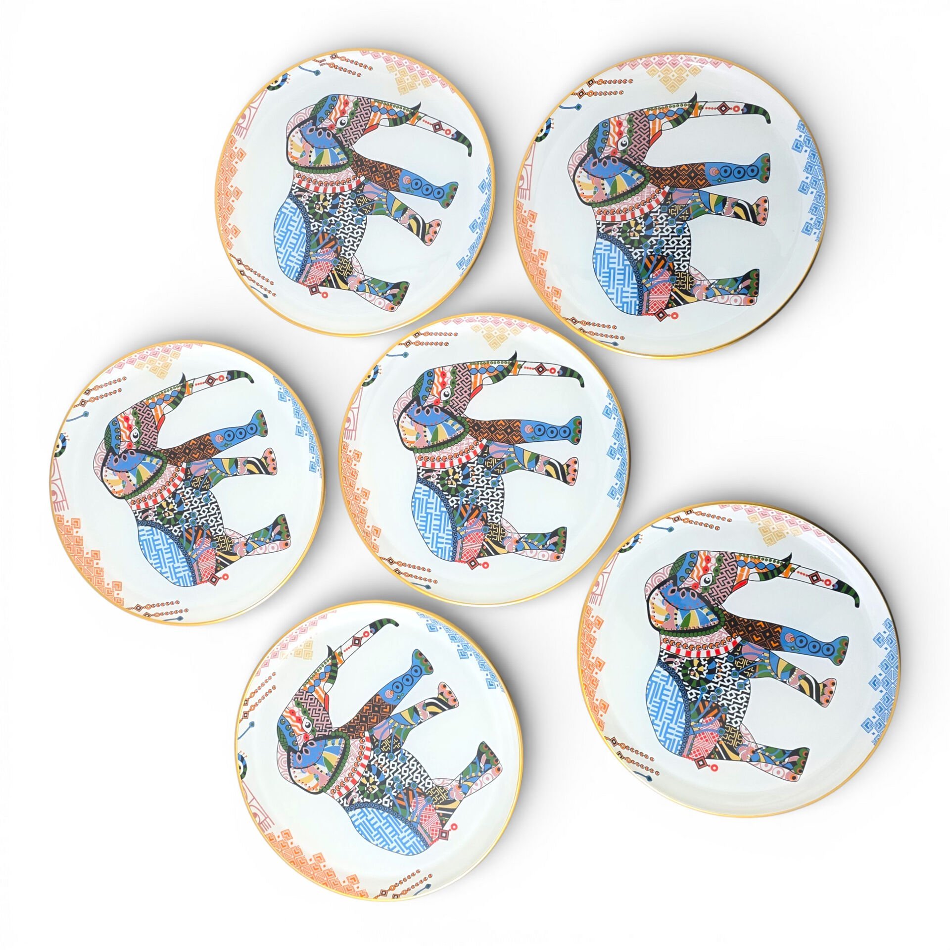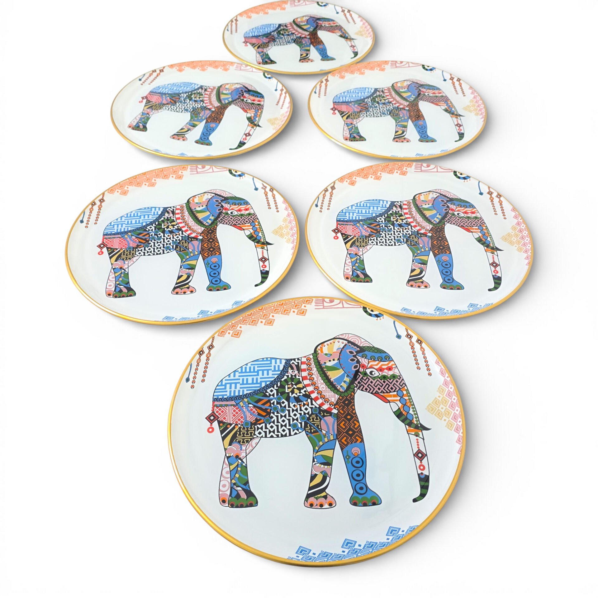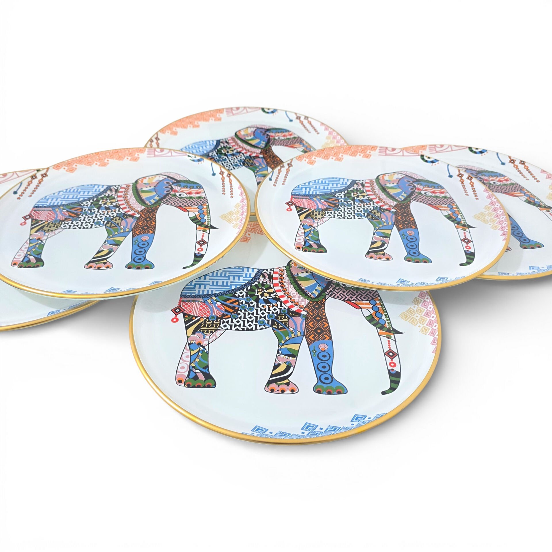 Sudedi Home koleksiyonuna ait bu servis tabağı, beyaz zemin üzerinde yer alan çok renkli fil deseniyle güçlü ve dikkat çekici bir görünüme sahiptir.
