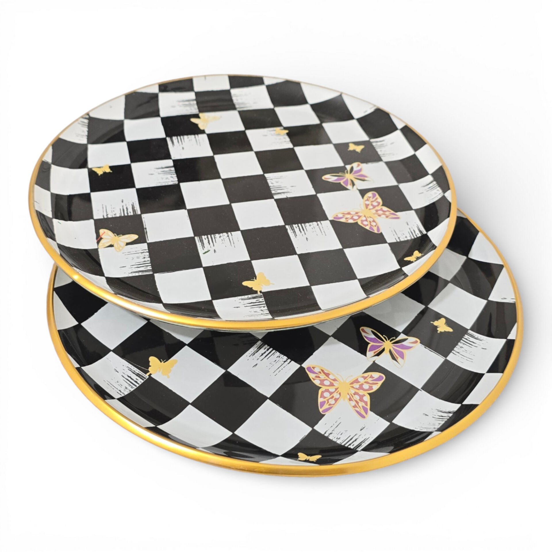Sudedi Home Gerçek Altın Yaldızlı Cam Pasta Tabağı 21 cm Siyah Beyaz Dama Desenli 2 Kişilik Set