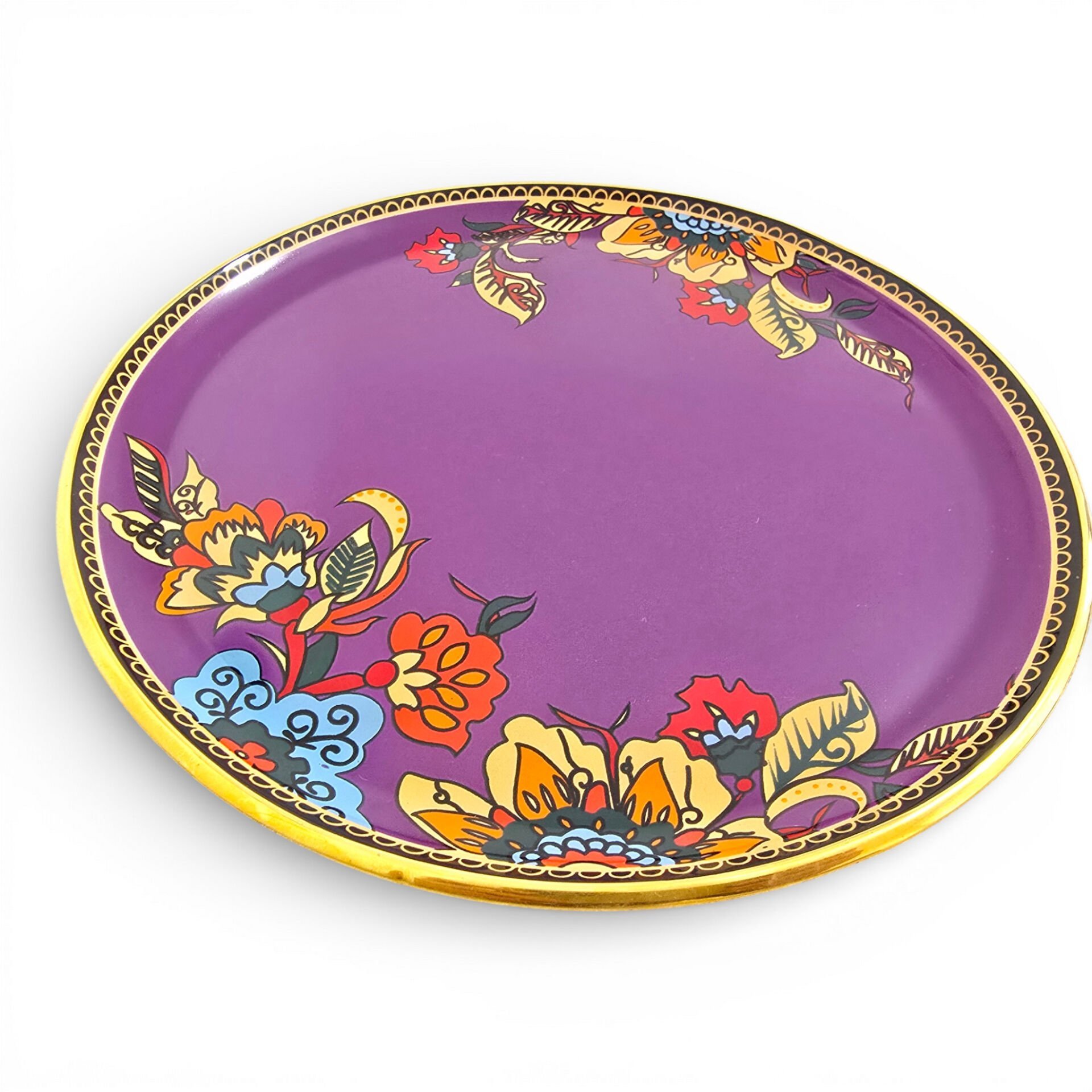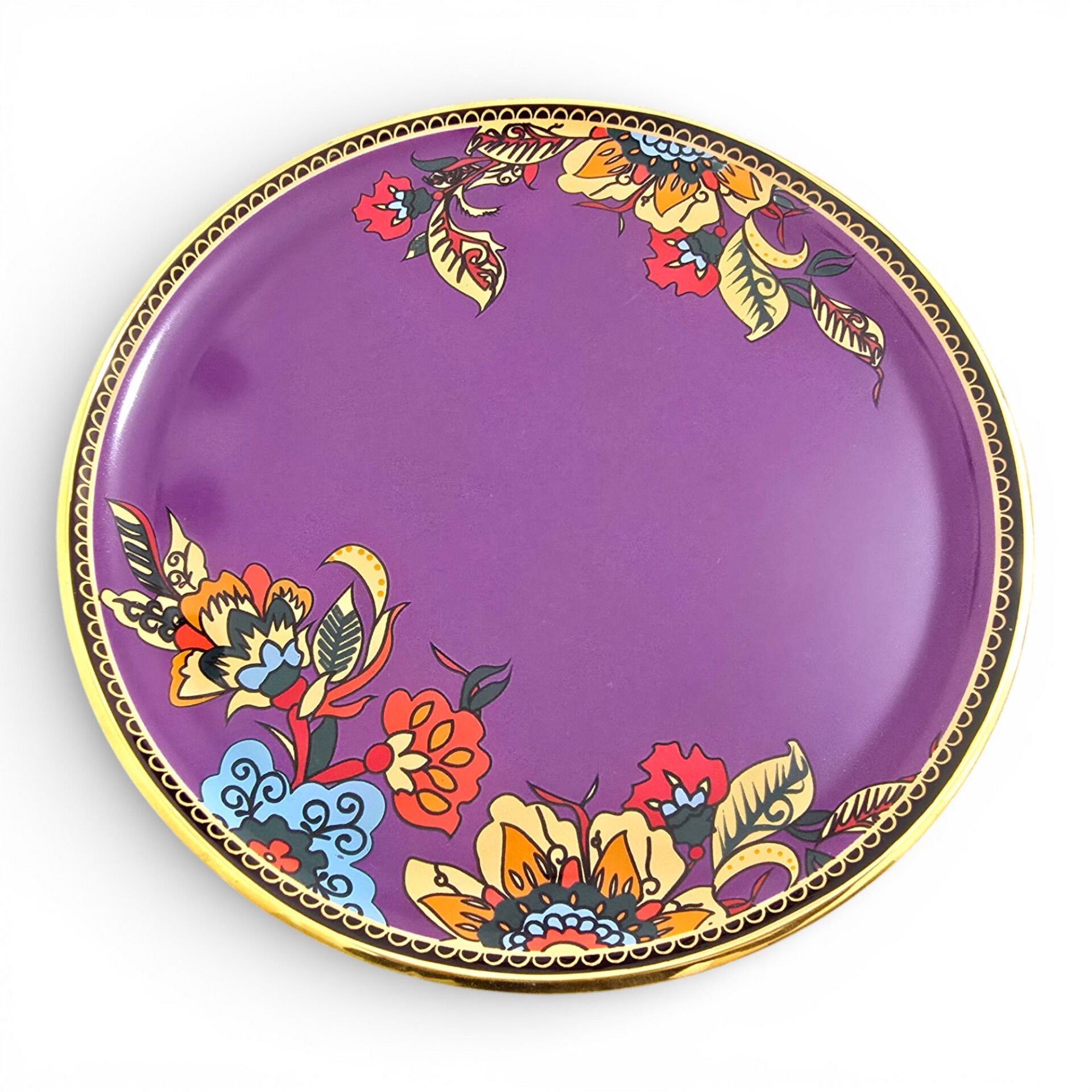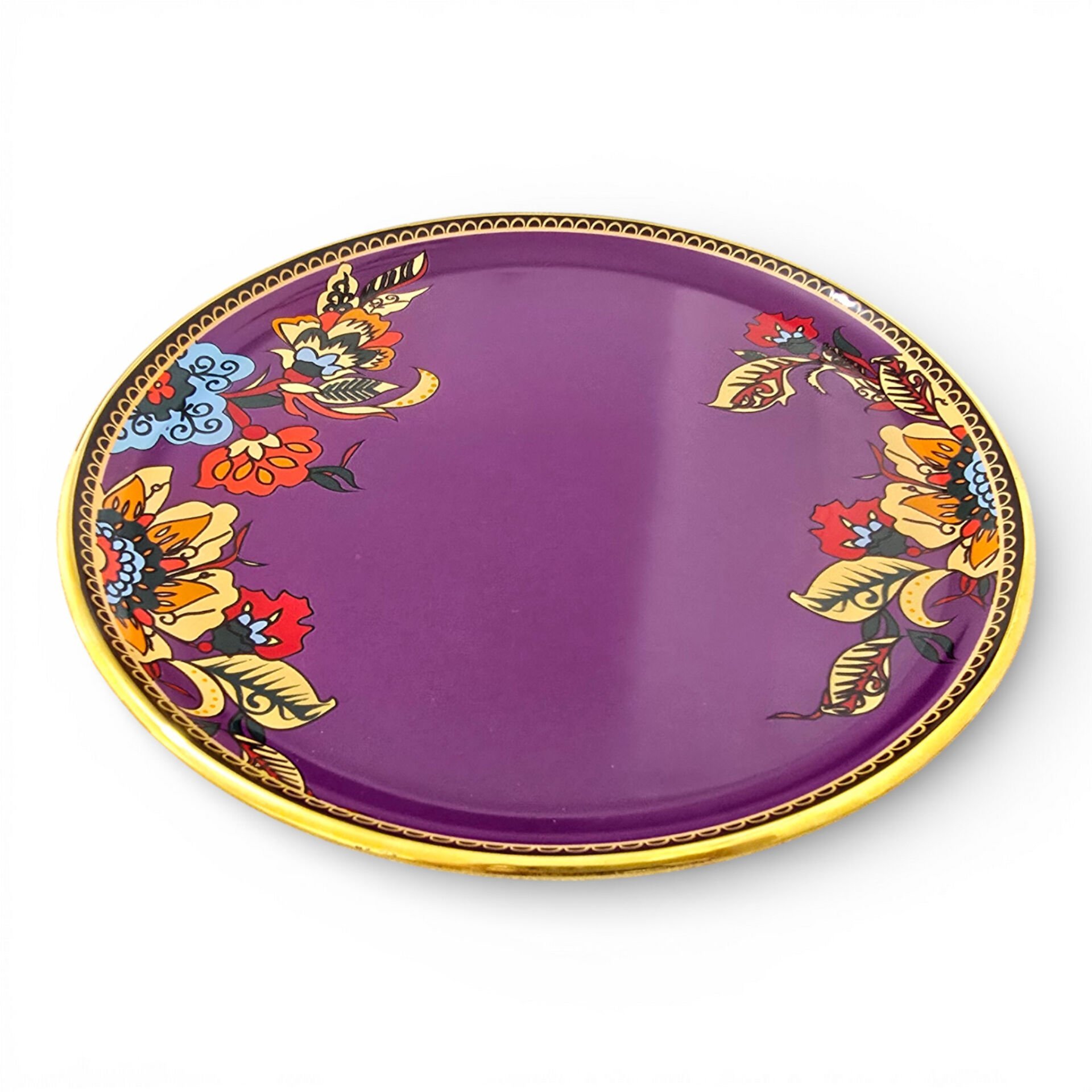 Mor zemin ve floral desenler, klasik ile modern tarzı aynı tabakta buluşturur.