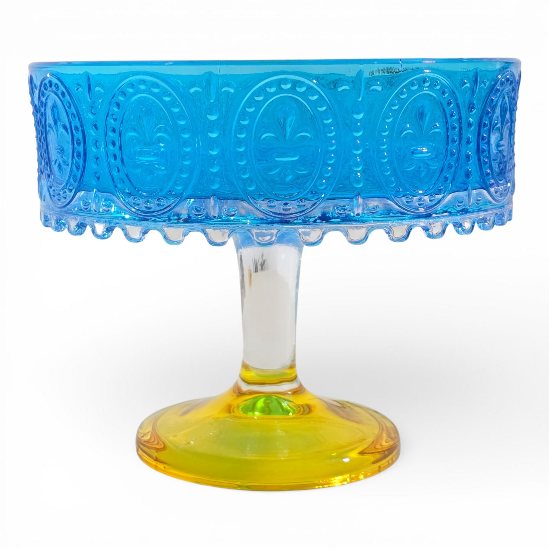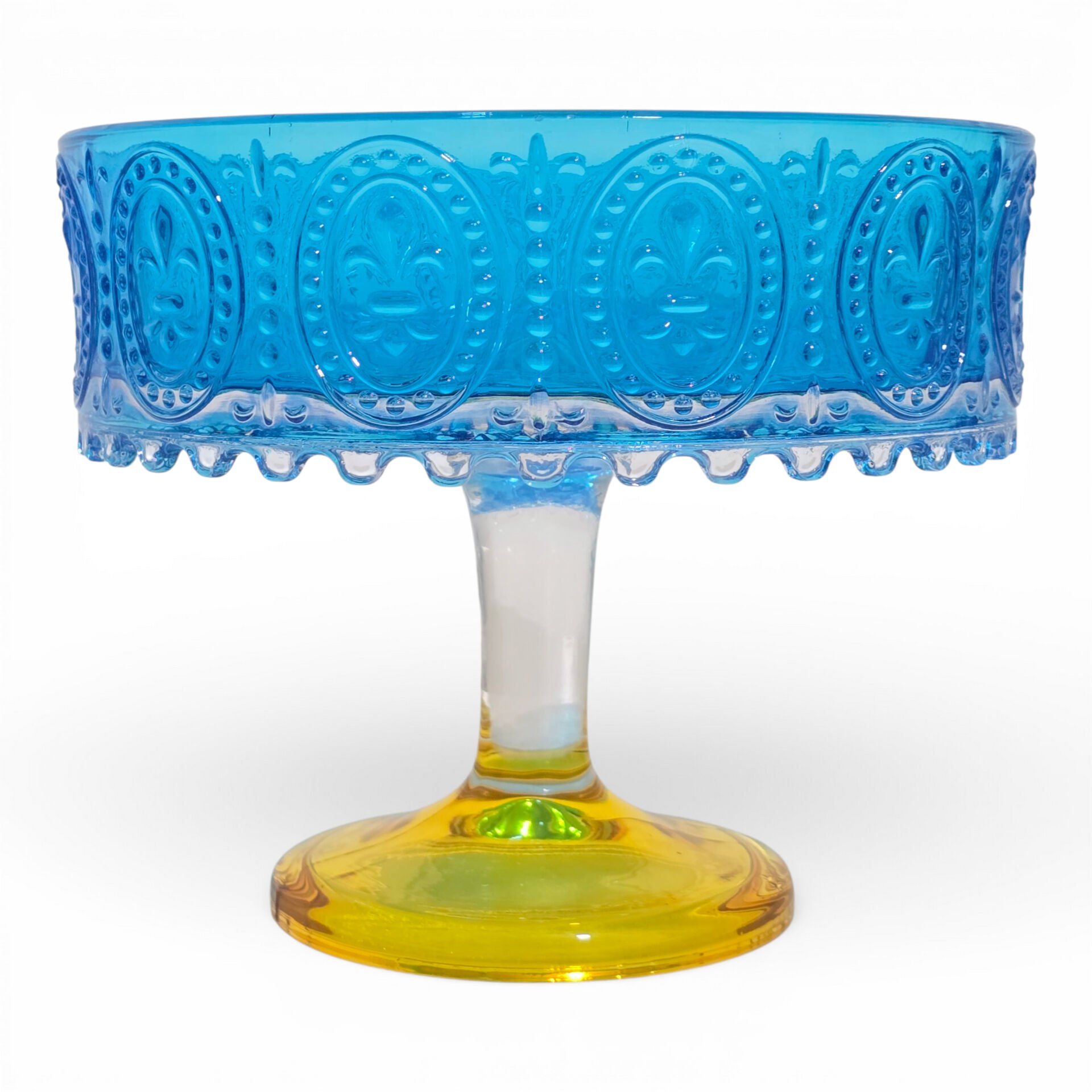 Sudedi Home tasarımı bu ayaklı sunum standı, canlı mavi tonlu kabartmalı üst yüzeyi ve kontrast yaratan sarı cam taban detayıyla sofralarda fark yaratan güçlü bir görsel etki sunar.