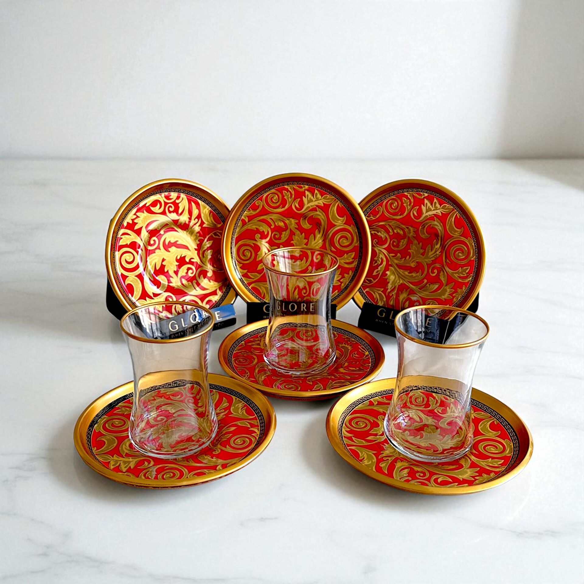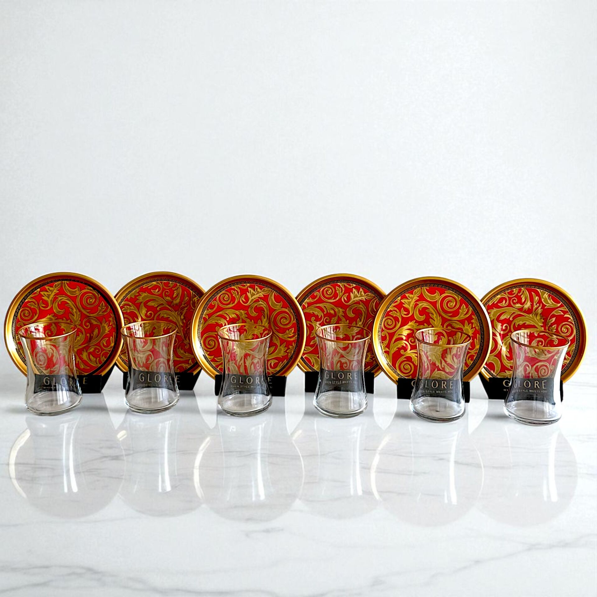Paket İçeriği: 6 adet cam çay bardağı ve 6 adet kırmızı altın desenli porselen tabaktan oluşur. Toplam 12 parçadır.