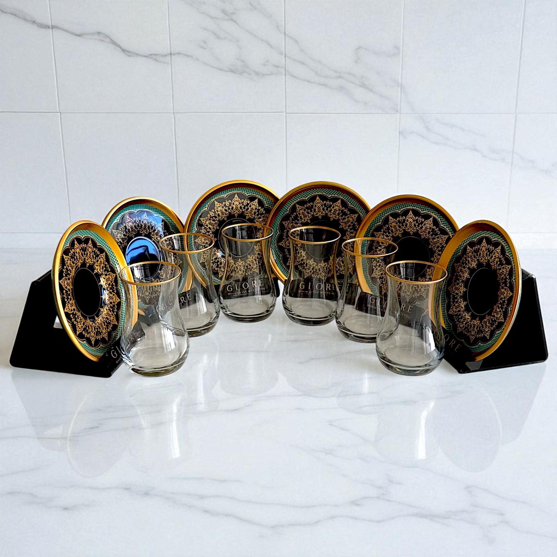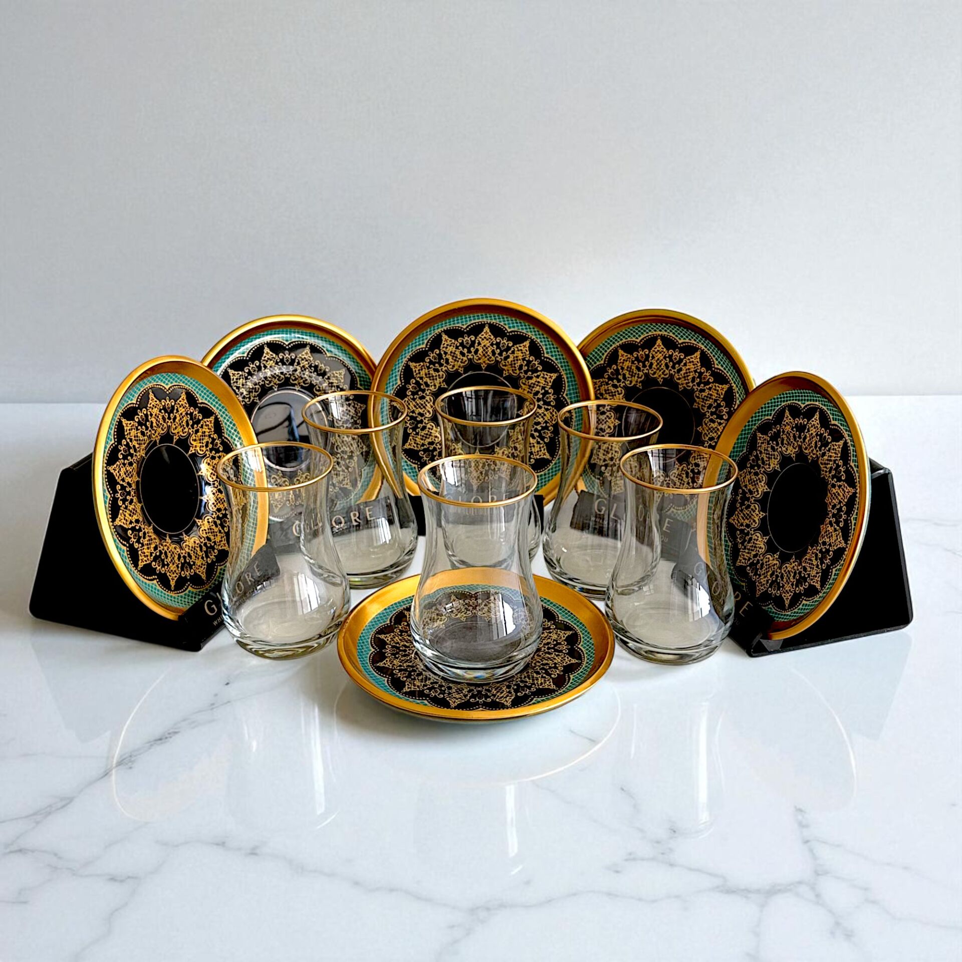 Sudedi Home'un özel tasarımı olan bu 12 parçalık çay bardağı seti, zarif siyahın üzerinde parlayan turkuaz ve altın renkleriyle göz kamaştırıyor.