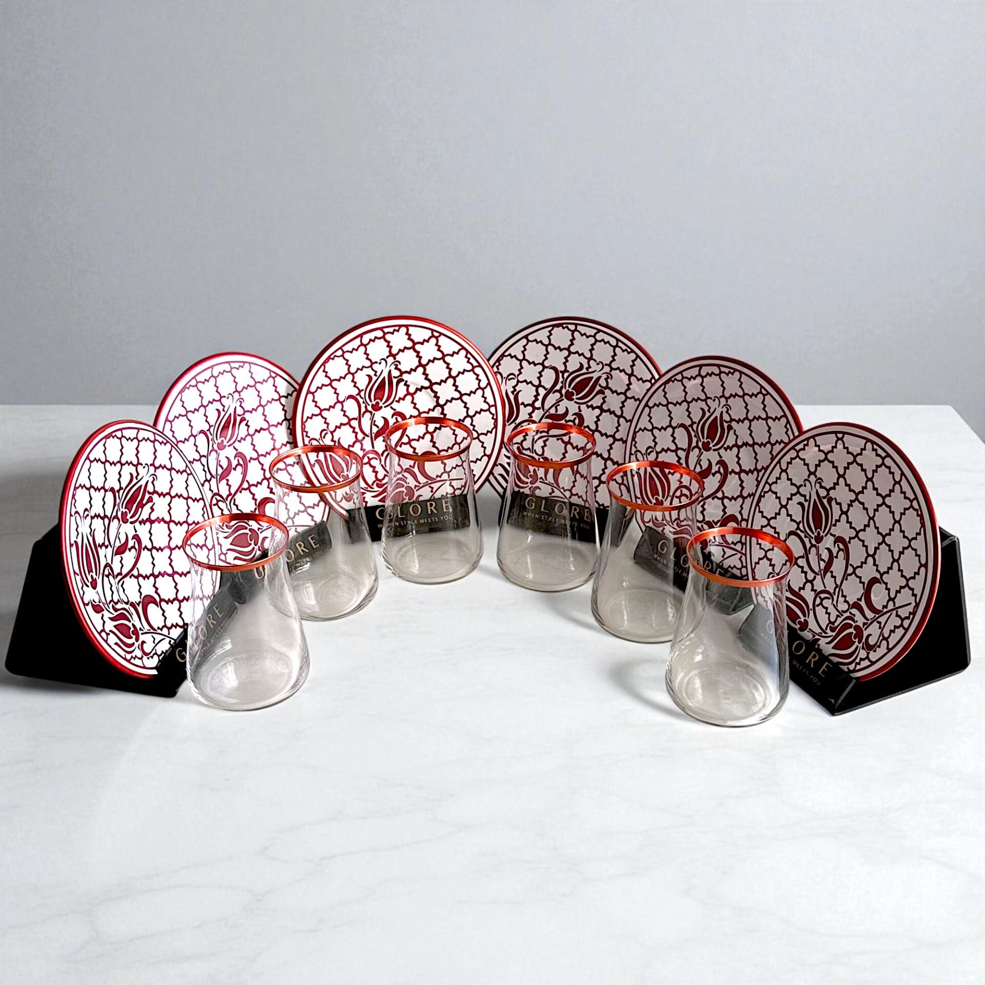 Sudedi Home Türk Lale Motifli 6'lı Kırmızı Tabaklı Çay Bardağı Takımı
