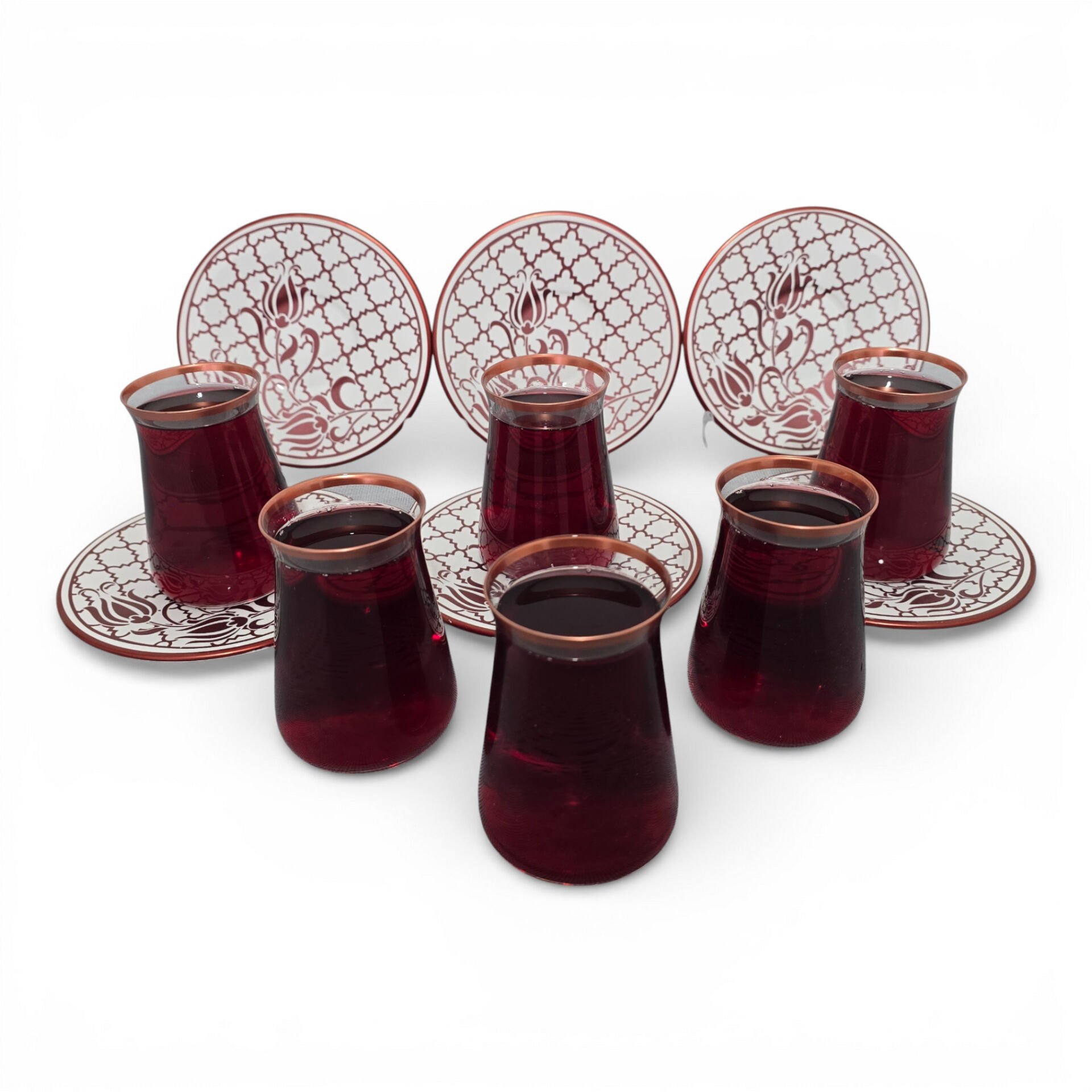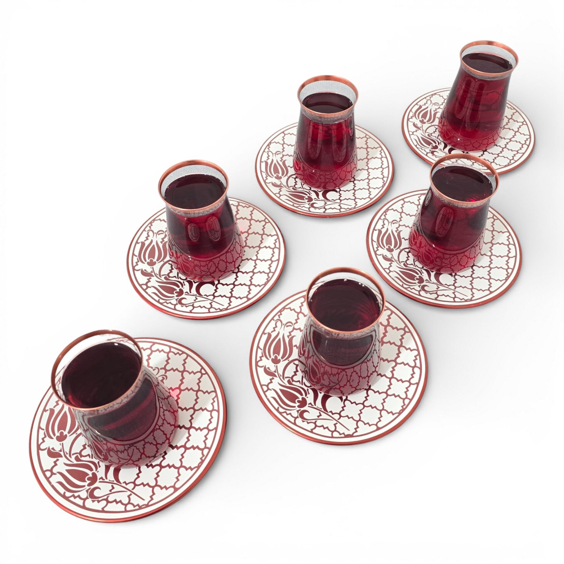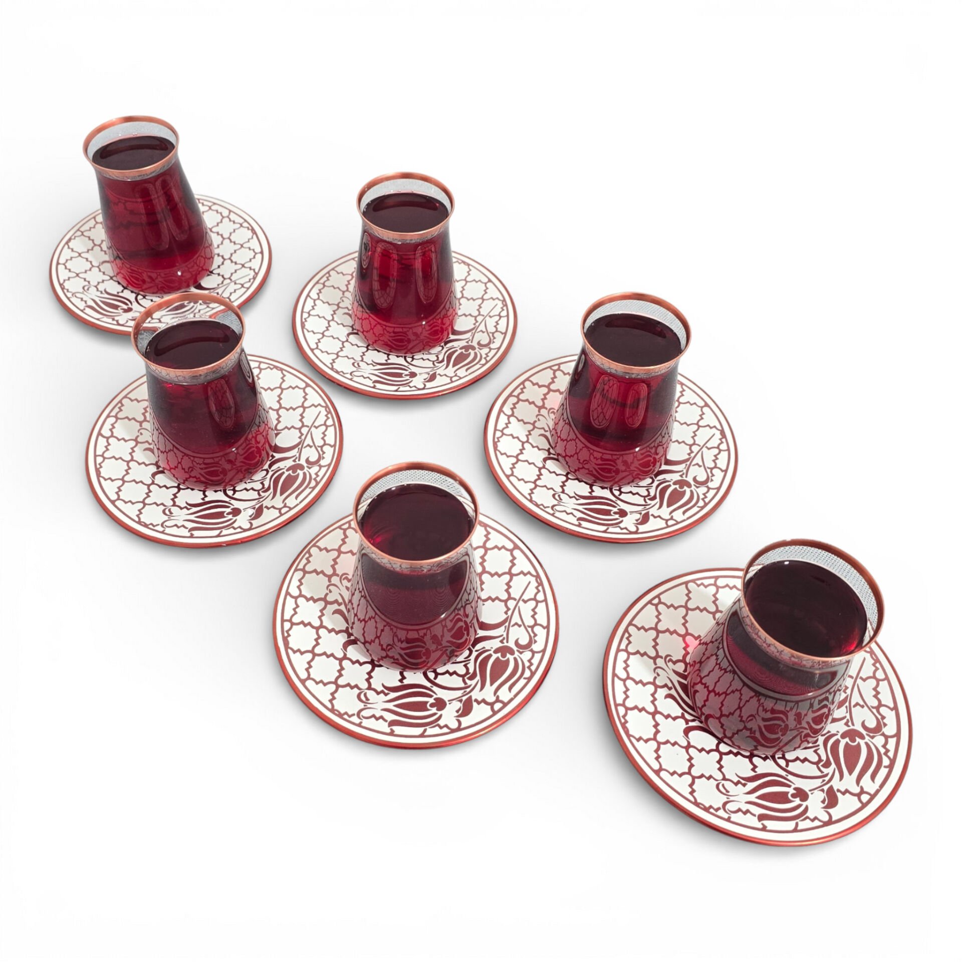 Sudedi Home Osmanlı Desenli Bakır Yaldızlı Bordo Cam Bardaklı Porselen Tabaklı 6’lı Çay Bardağı Seti