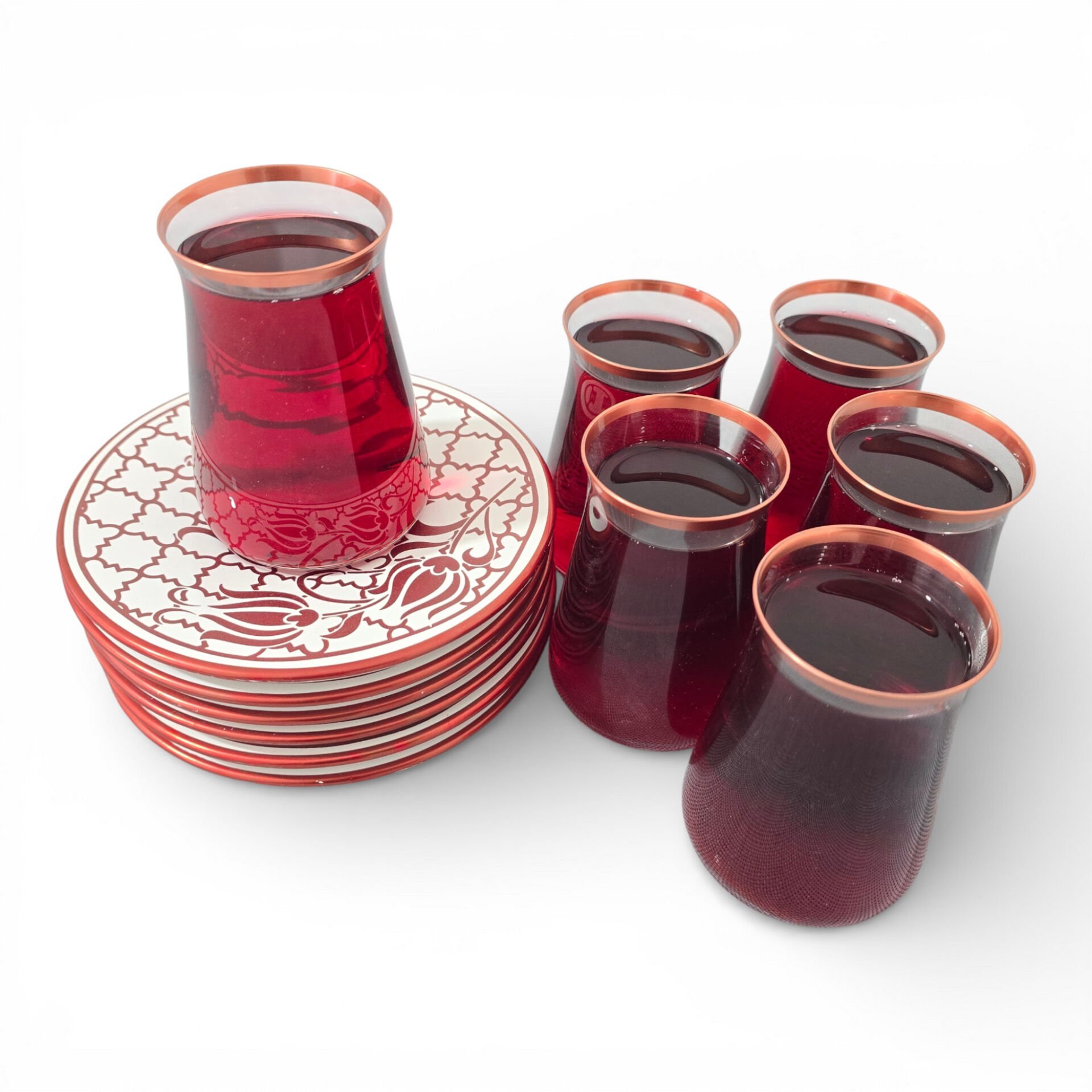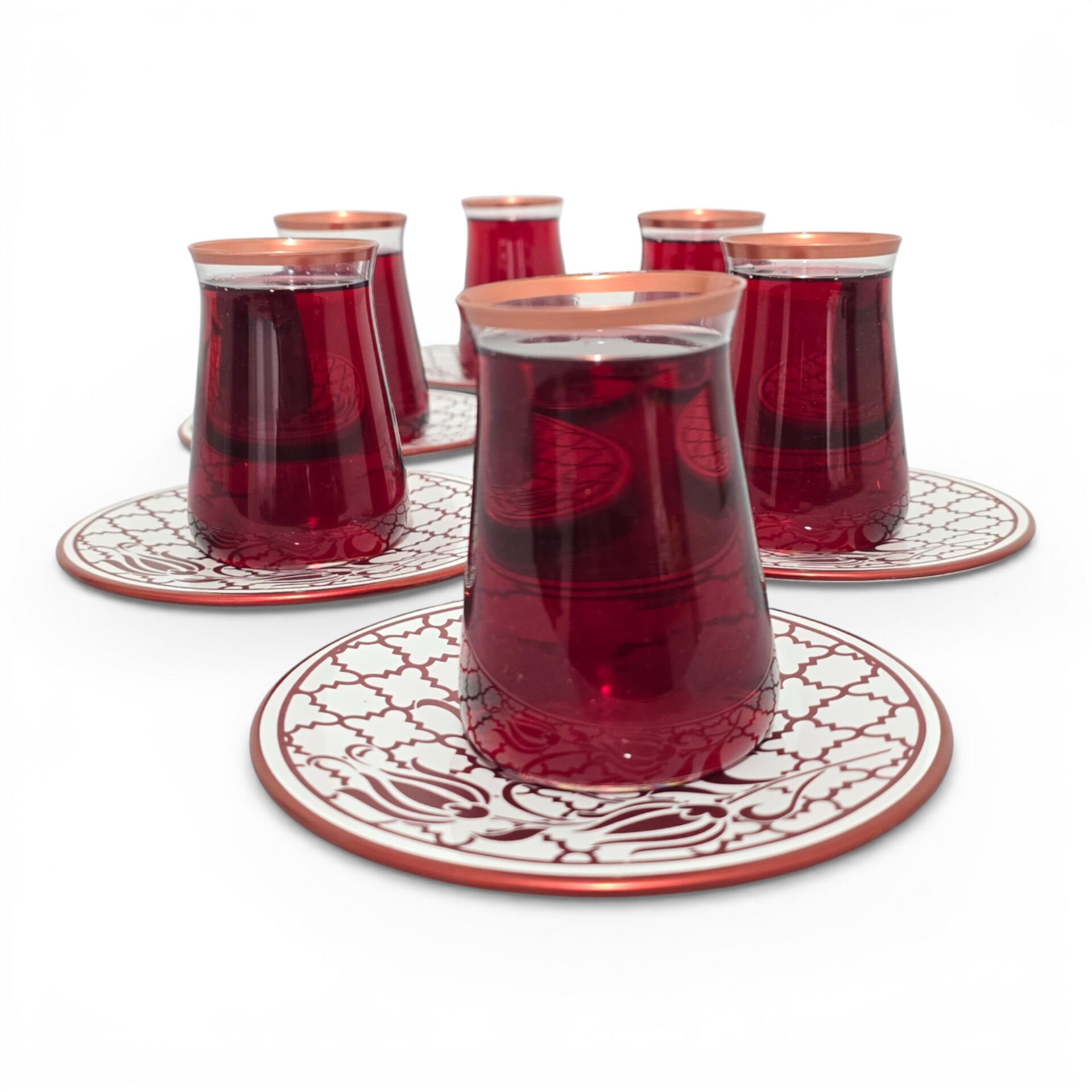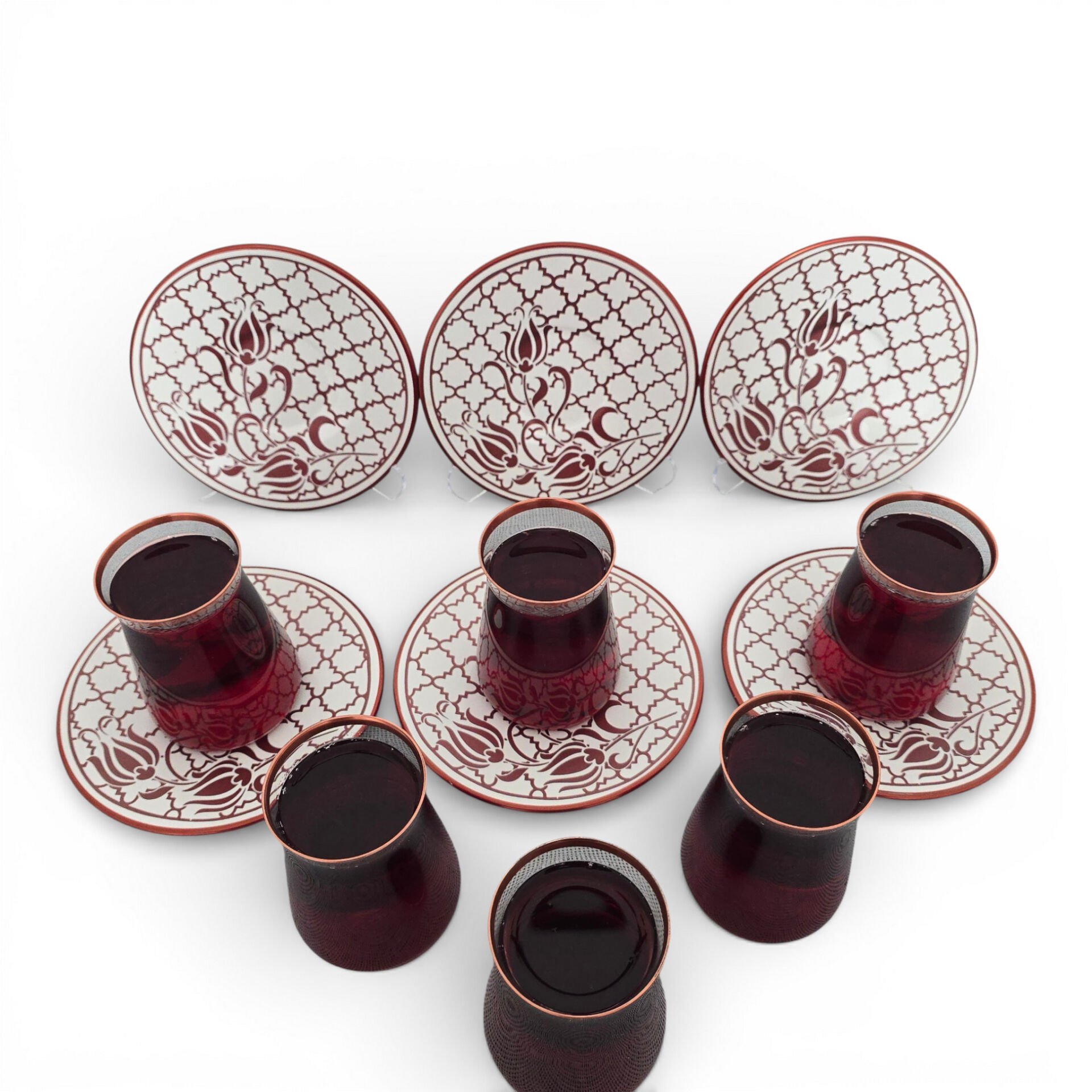 Sudedi Home Osmanlı Desenli Bakır Yaldızlı Bordo Cam Bardaklı Porselen Tabaklı 6’lı Çay Bardağı Seti