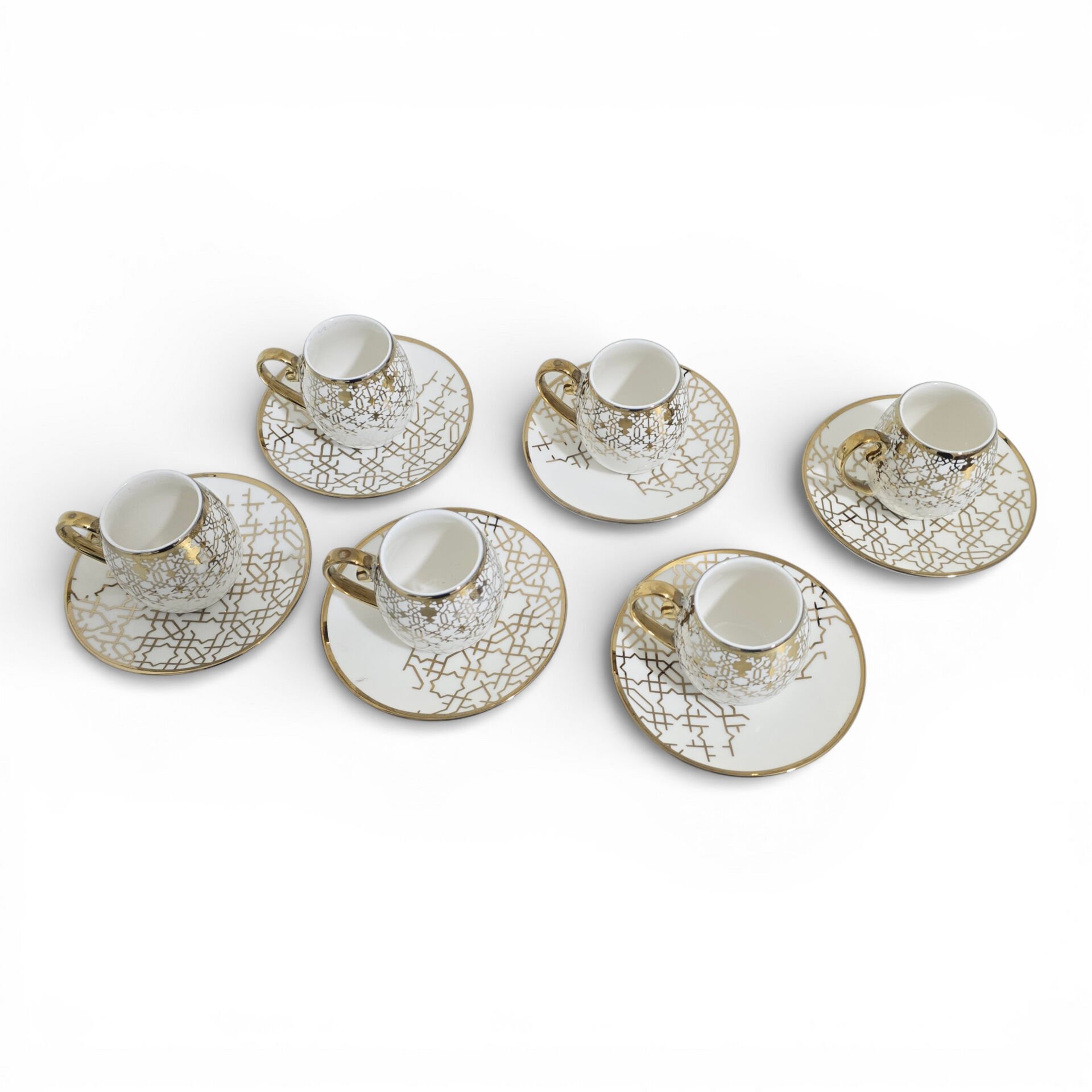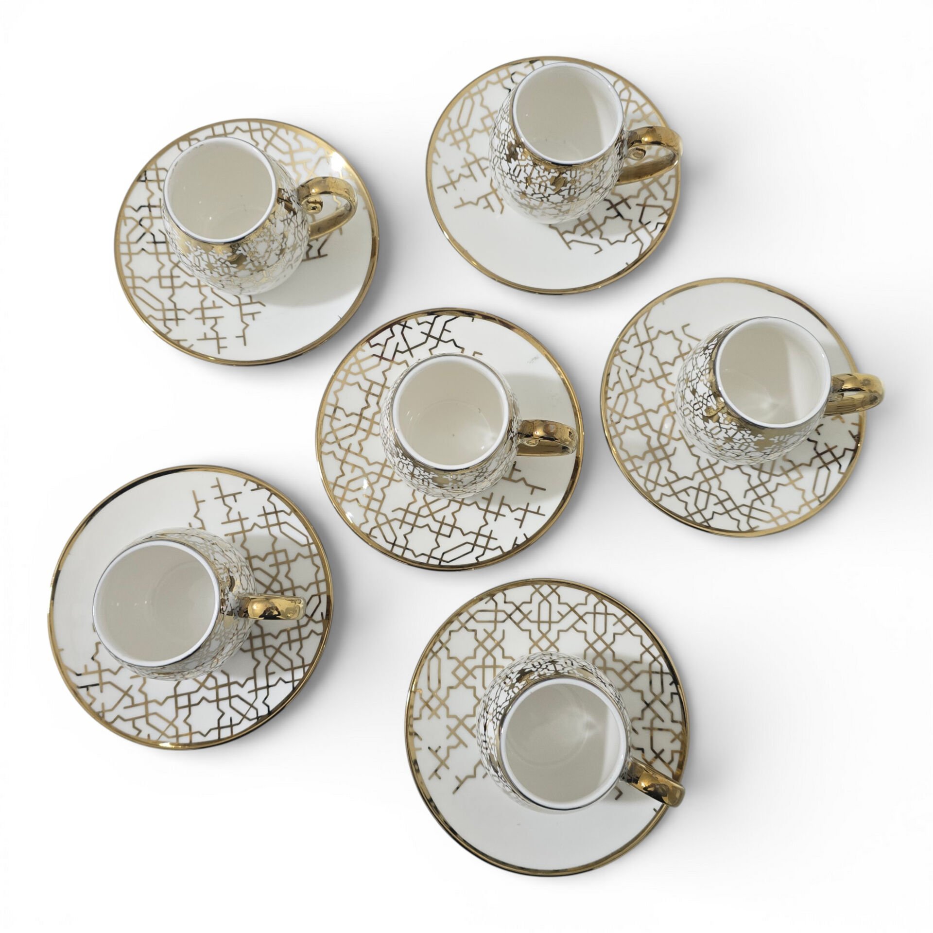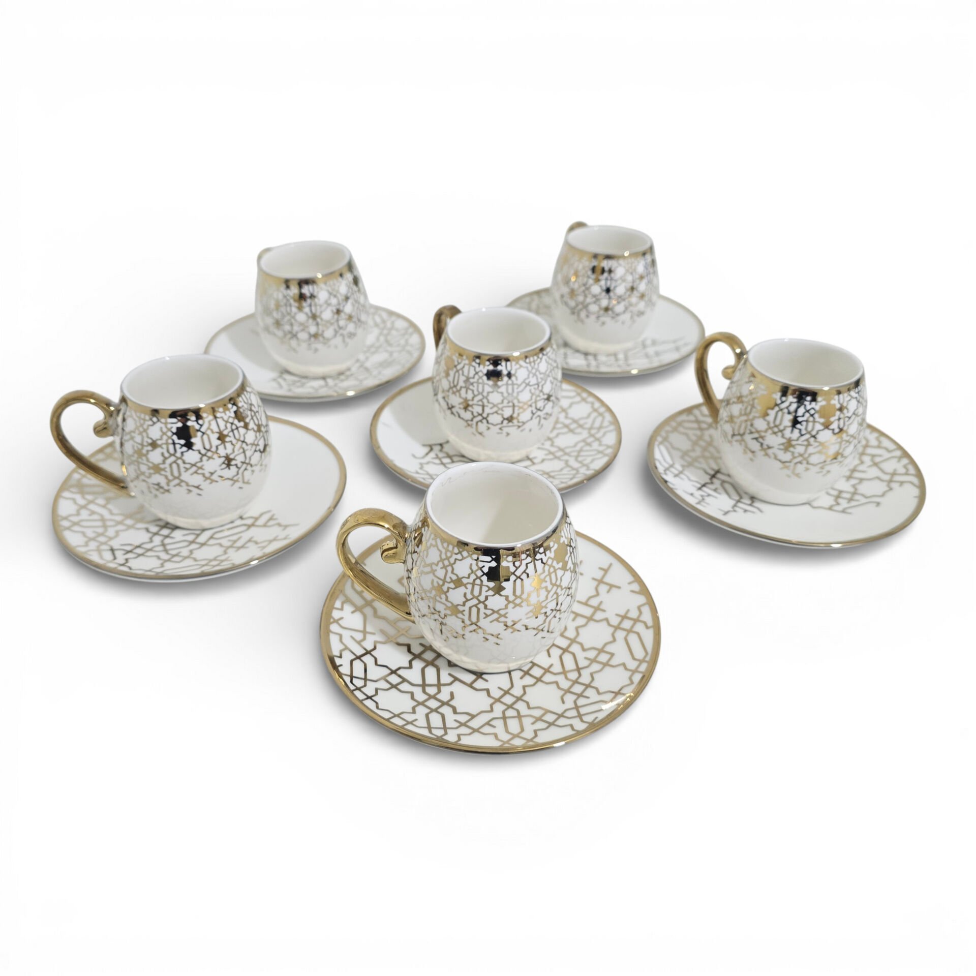 Sudedi Home Yaldızlı Desenli Porselen Fincan Takımı, beyaz zemin üzerine uygulanan geometrik desenleri ve uyumlu tabak formu ile kahve ve ikram sunumlarında dengeli ve şık bir görünüm sunar.