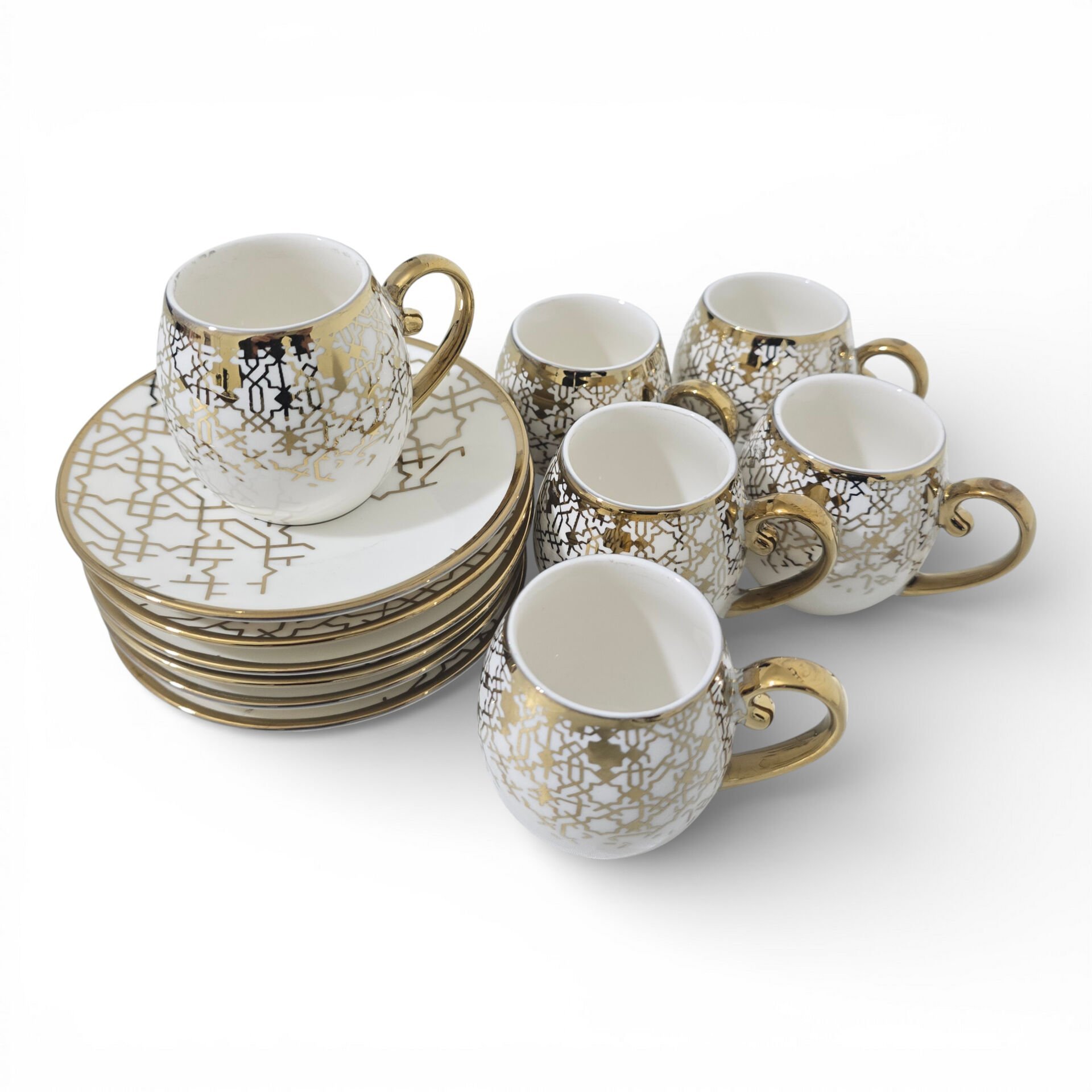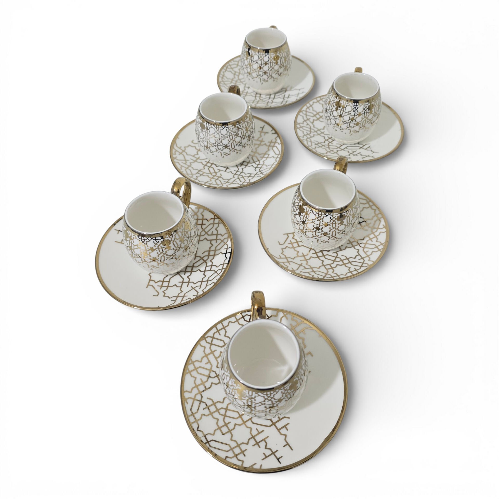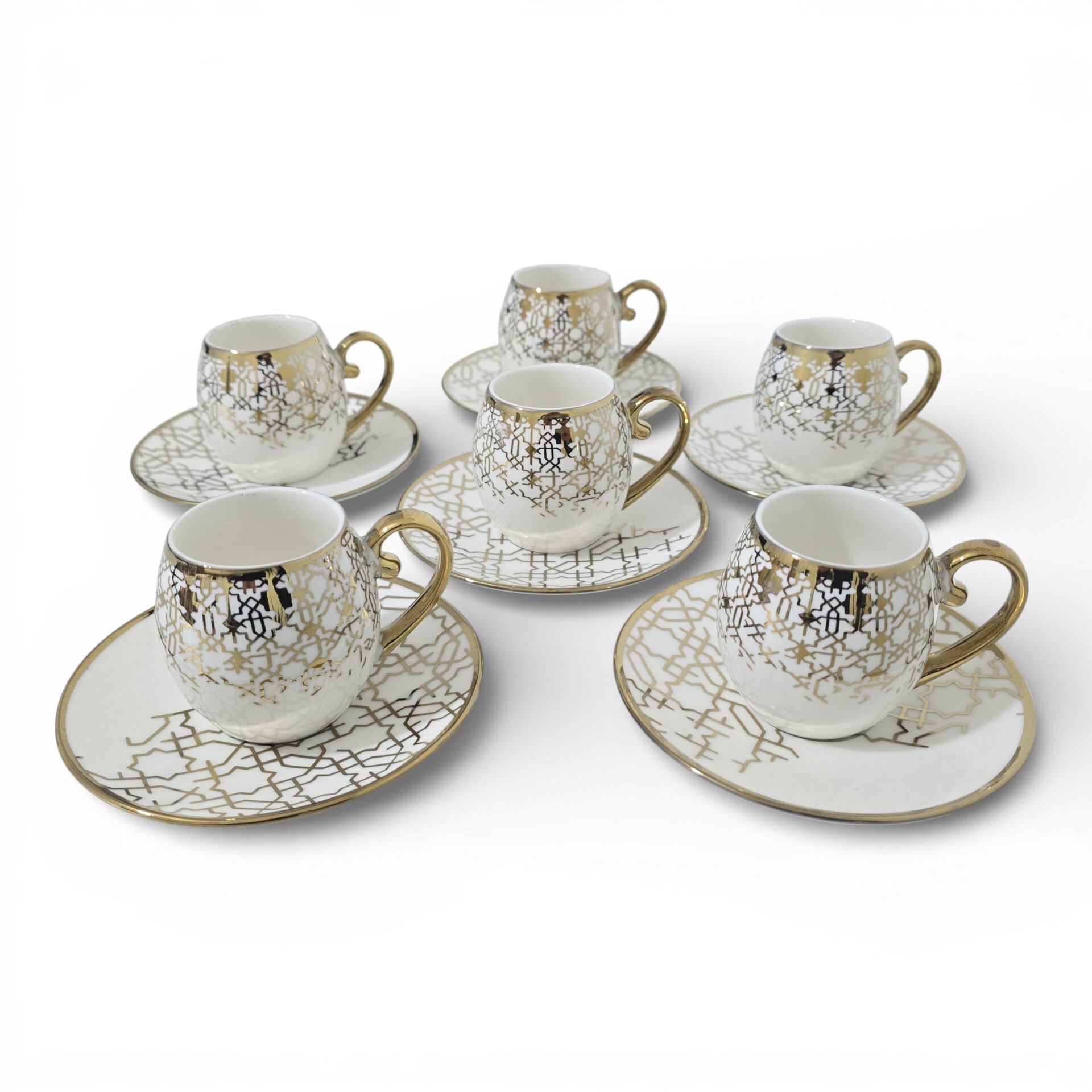 Sudedi Home Yaldızlı Desenli Porselen Fincan Takımı, beyaz zemin üzerine uygulanan geometrik desenleri ve uyumlu tabak formu ile kahve ve ikram sunumlarında dengeli ve şık bir görünüm sunar.