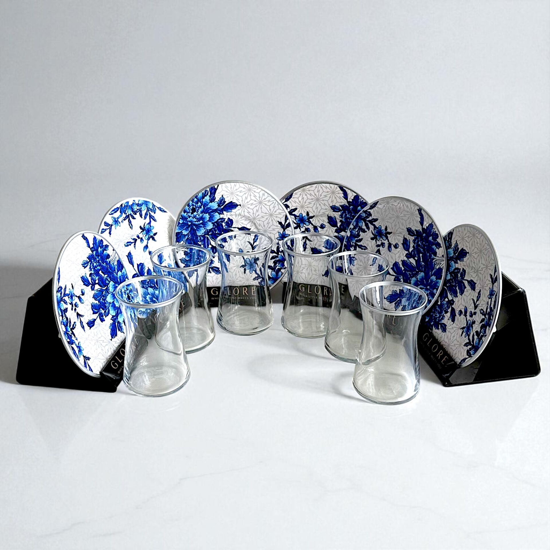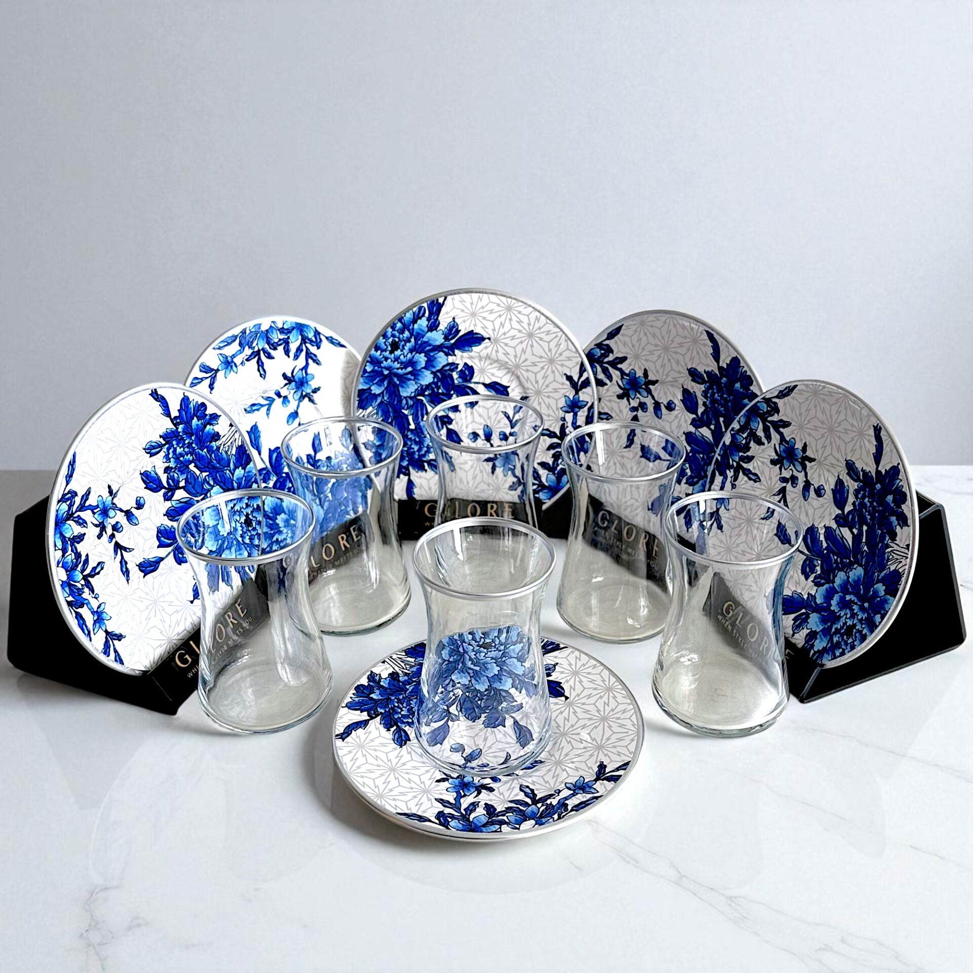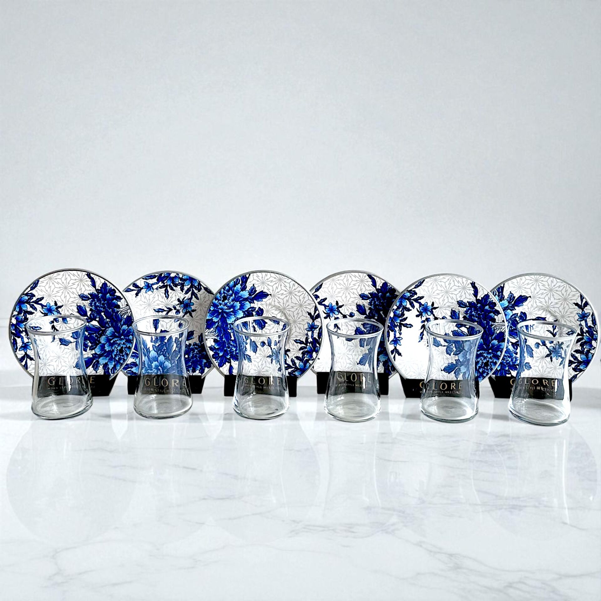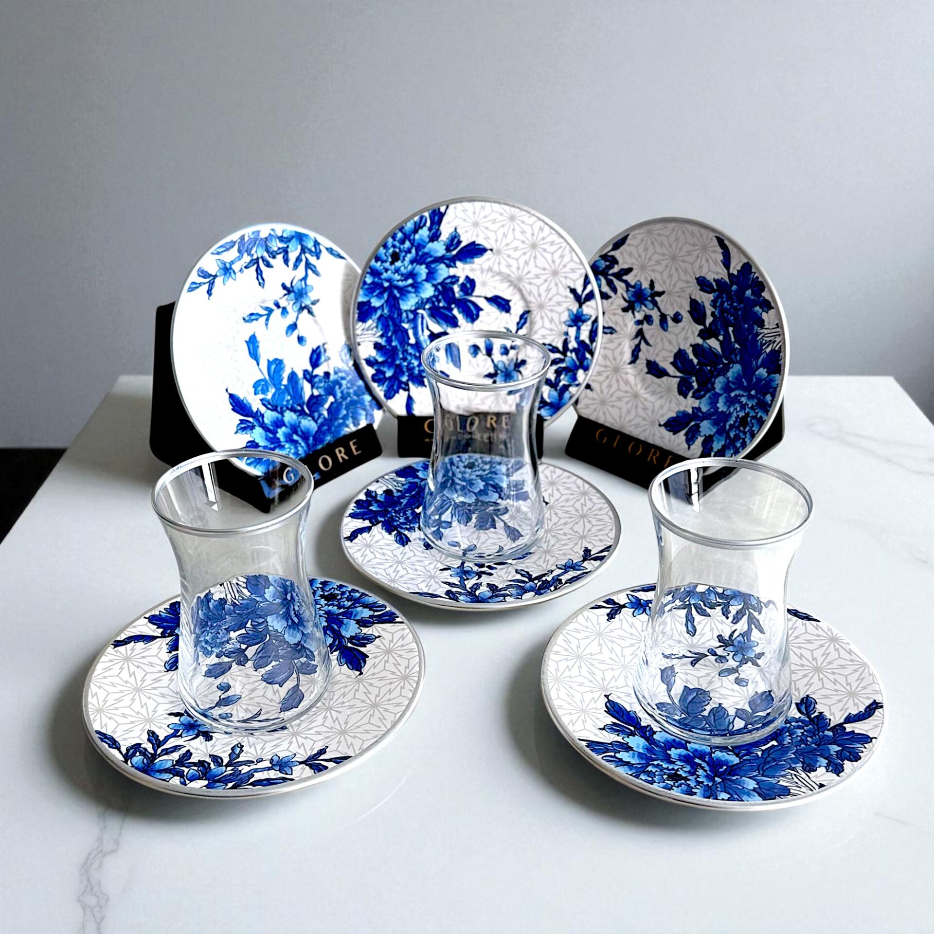 6 kişilik çay bardağı seti, canlı mavi çiçek desenleri ve geometrik desenlerle süslenmiş porselen tabaklarla birlikte gelir.