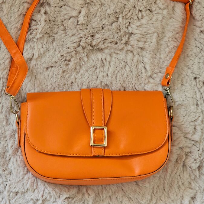 Bu göz alıcı turuncu mini omuz çantası, zarif tokası ve modern kesimiyle öne çıkıyor.